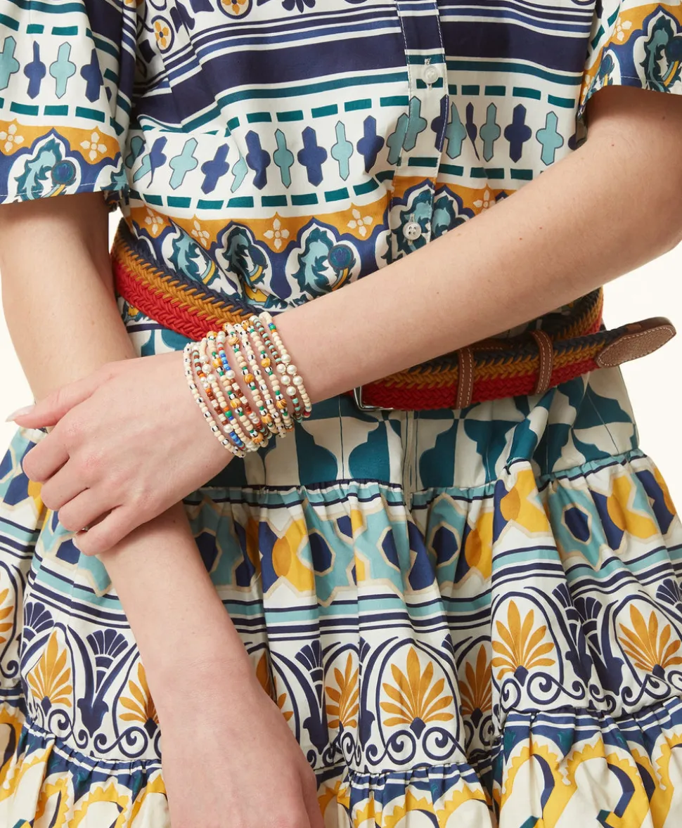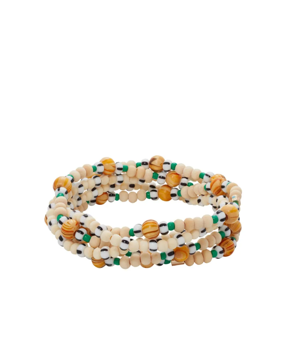 Set of 5, mixed metal, heishi, and enamel beaded stretch bracelets.