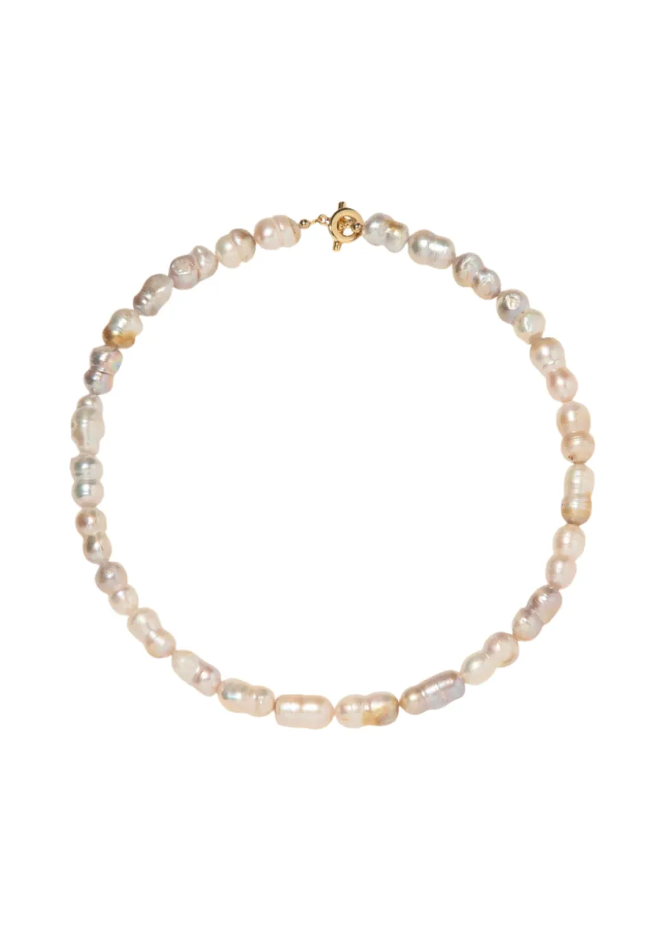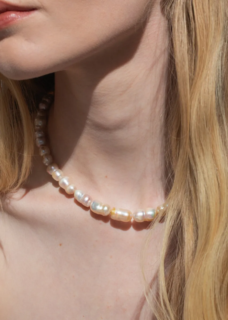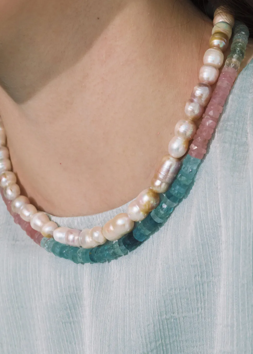 “Everything has a story to tell,” says Jennifer Behr, the founder of her namesake luxury hair accessory brand that has blossomed into one of New York City’s foremost ateliers for jewelry, as well as bridal. In every crystal, pearl, and ribbon, you’ll find the utmost quality and a sense of romance, as each piece reveals a modern interpretation of centuries-old regalia. The Lilah Necklace is hand-beaded with freshwater pearls, which are treasured for their organic nuances. The pearls have a natural warm champagne hue, casting a flattering glow. This necklace is designed to be worn solo or stacked with other gemstone necklaces.