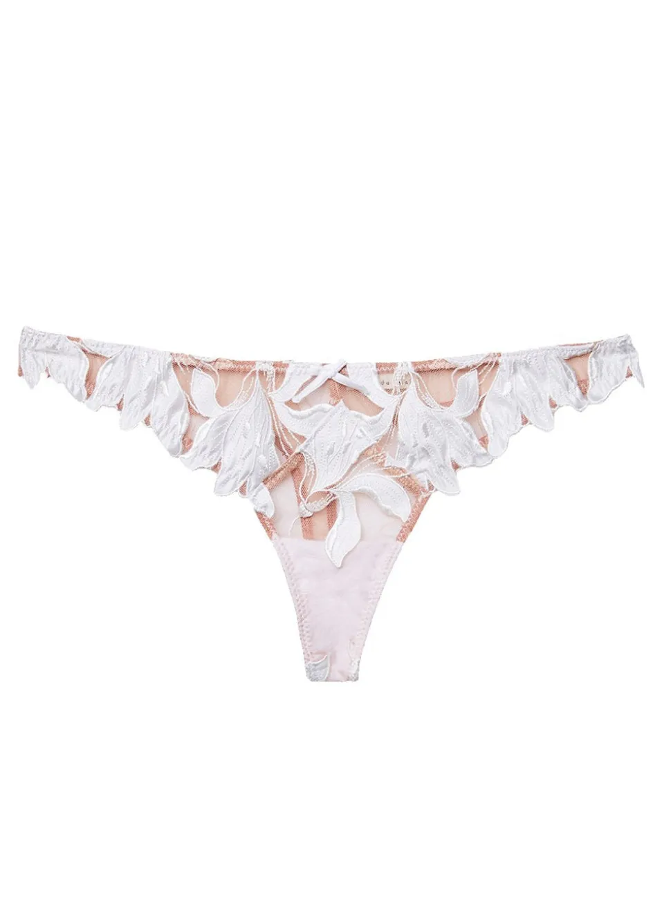 Inspired by Charles Baudelaire’s masterful collection of poetry entitled “Les Fleurs du Mal,” Jennifer Zuccarini founded Fleur du Mal with the belief that wearing beautiful lingerie should be an everyday affair. Tastefully provocative, the luxury brand has amassed a cult following of devotees who adore the sultry and empowering pieces. The Lily Embroidery Hipster Thong in Ivory showcases the brand’s signature large embroidered lilies, finished with flirty scalloped edges and a sheer mesh back. Designed to pair with the Lily Embroidery Plunge Demi and Garter, this piece is a timeless addition to your lingerie drawer.