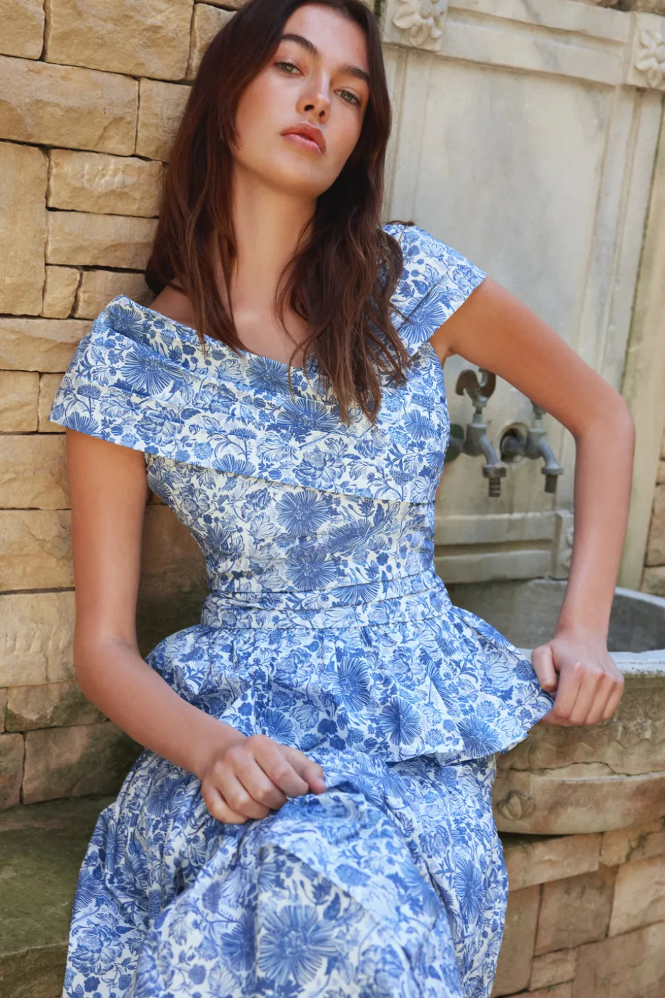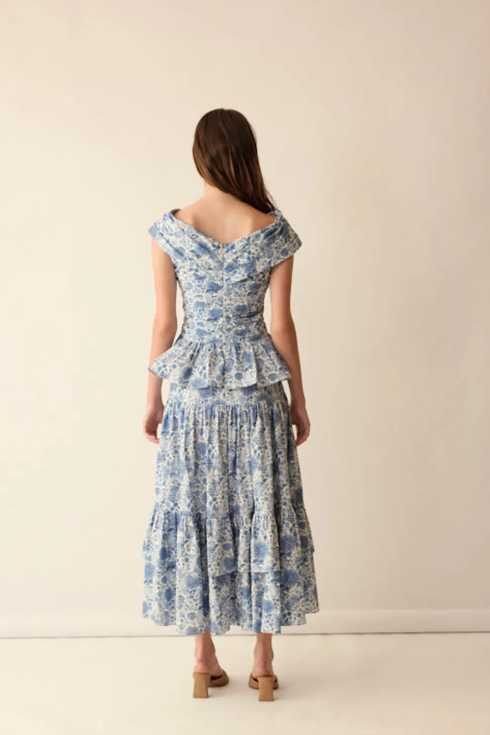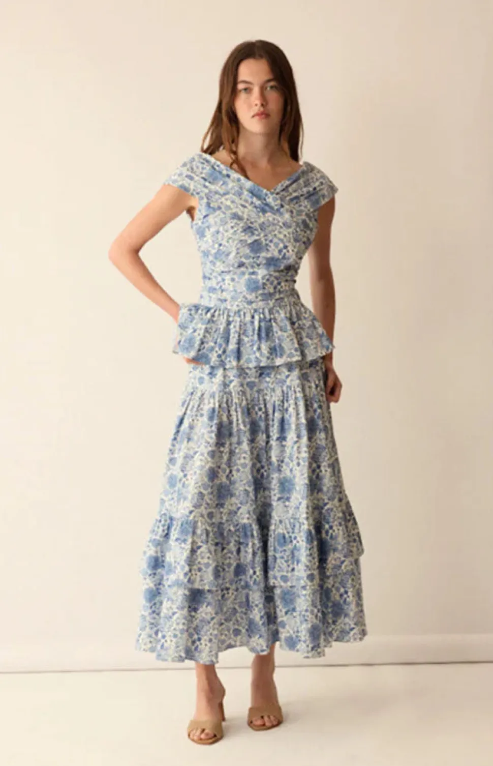 Loulou, founder of Loulou La Dune, extends her refined feminine touch from interior design and tableware into the realm of ready-to-wear fashion. Recognizing the desire for beautifully crafted, effortless, and chic clothing, she has created a capsule collection that integrates elegance and ease into everyday wear. A sweet, summery staple defines the Lily Top in Blue. Its peplum silhouette beautifully cinches at the waist, creating a flattering shape for all body types. The pleated bodice adds a touch of sophistication, while the stunning deep V-neck décolleté offers a hint of allure. The lightweight cotton fabric ensures breathability and comfort, making it ideal for warm, sunny days. Styled with its matching skirt for a harmonious, garden-inspired look.