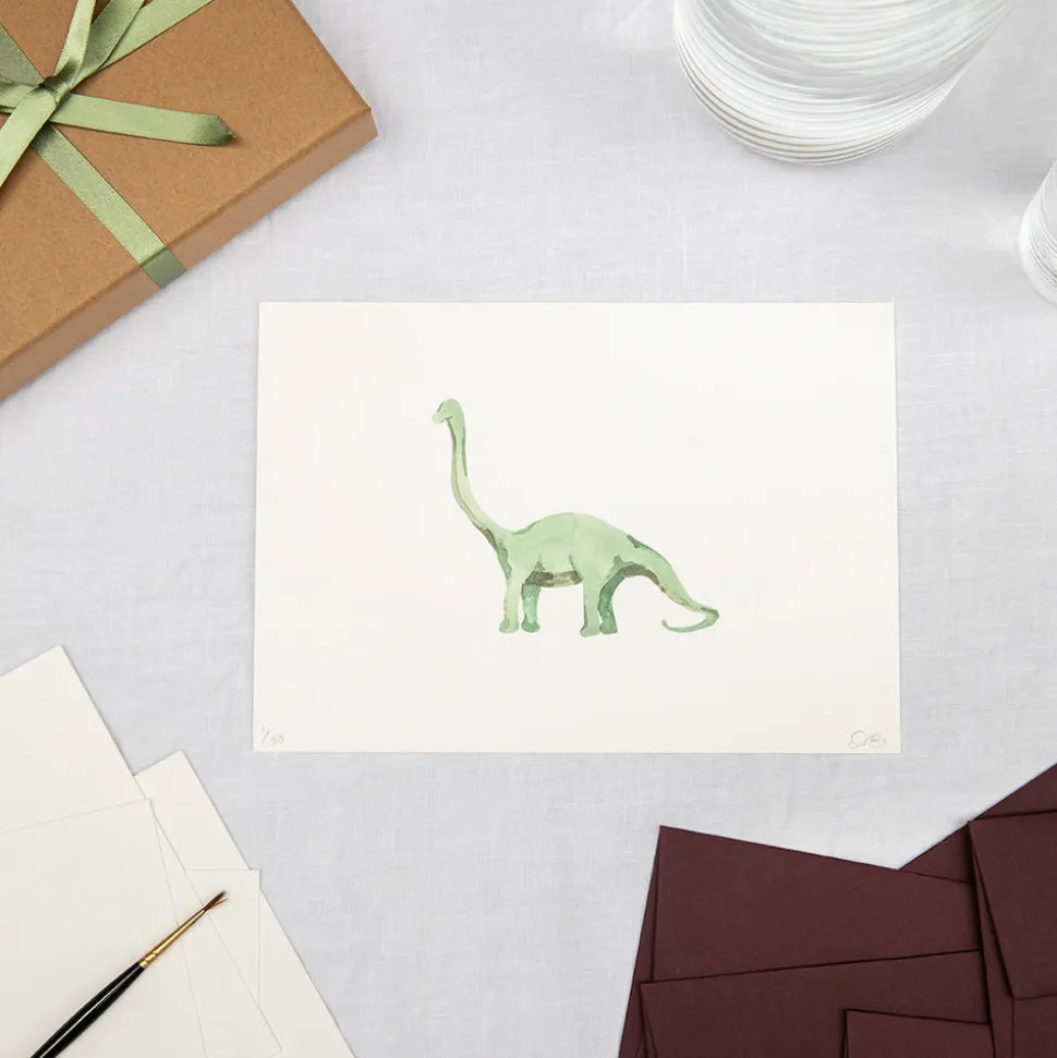 A lifelong love of the written word led Alice Edwards to create Memo Press, a luxury stationery company specializing in small batch cards, paper gifts and writing paper that make any expression, or occasion, that much more meaningful. The Limited Edition Diplodocus Print is a delightful, original watercolor of a gentle, giant long-necked dinosaur. Printed on ivory 400 gsm paper in the United Kingdom and limited to 50 numbered editions, each signed by the artist, founder Alice Edwards.