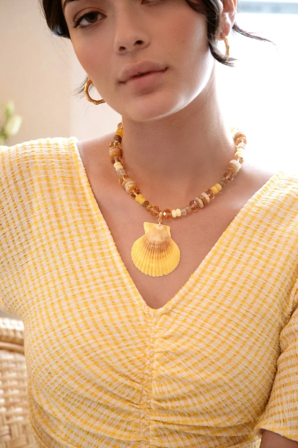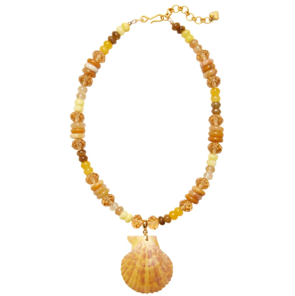 Hand-made. A strand of jade rondelles, jasper discs and faceted topaz glass beads adorned with a Pecten Shell. 24K antique gold-plated brass hook and chain ending. Adjustable. Hook closure. Please note that no two shells or semi-precious beads are exactly the same; they range slightly in color and detailing due to being natural materials. Each shell has its own unique markings and there will be slight variations due to the individuality of each piece.