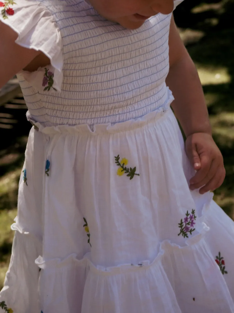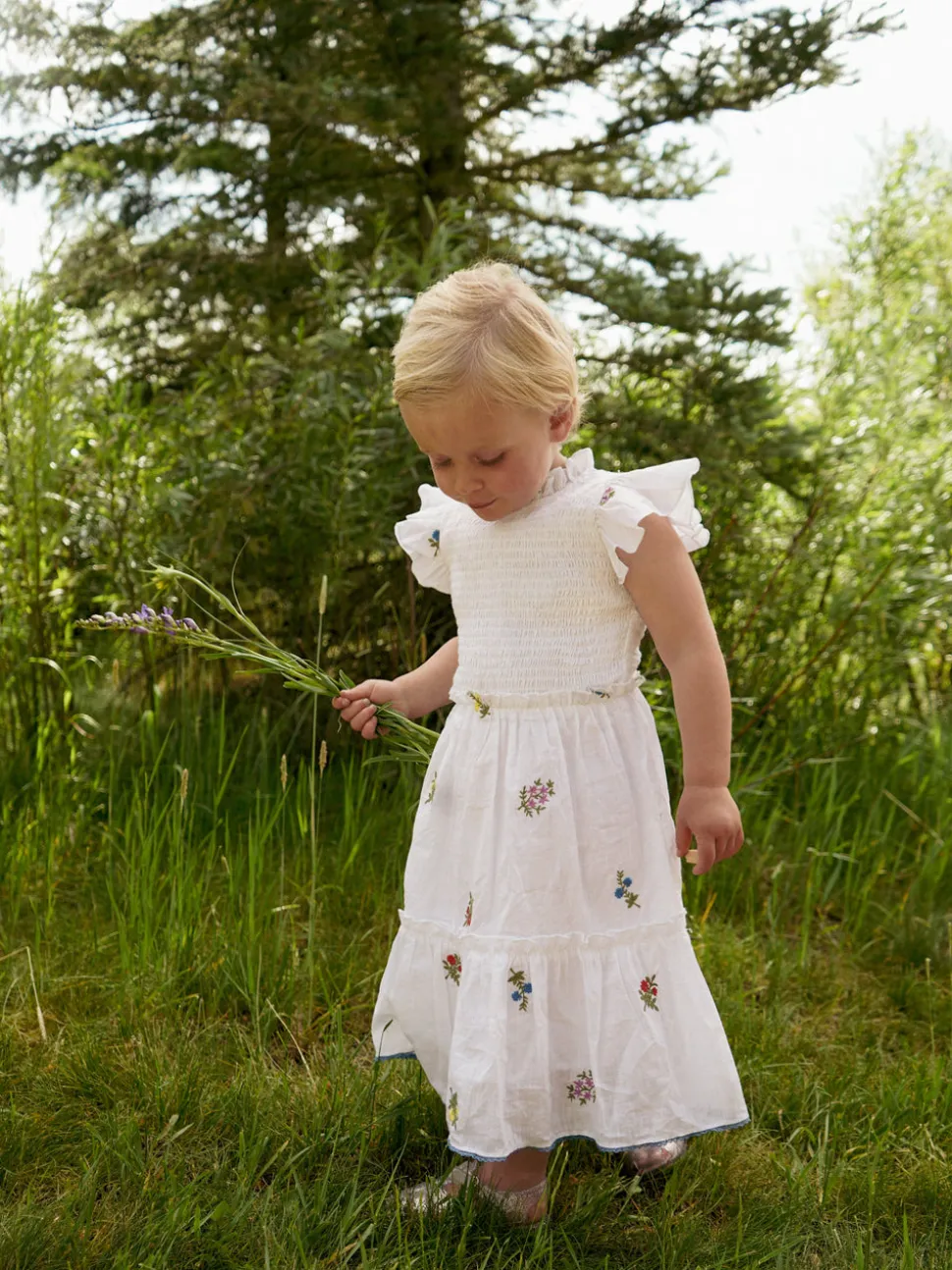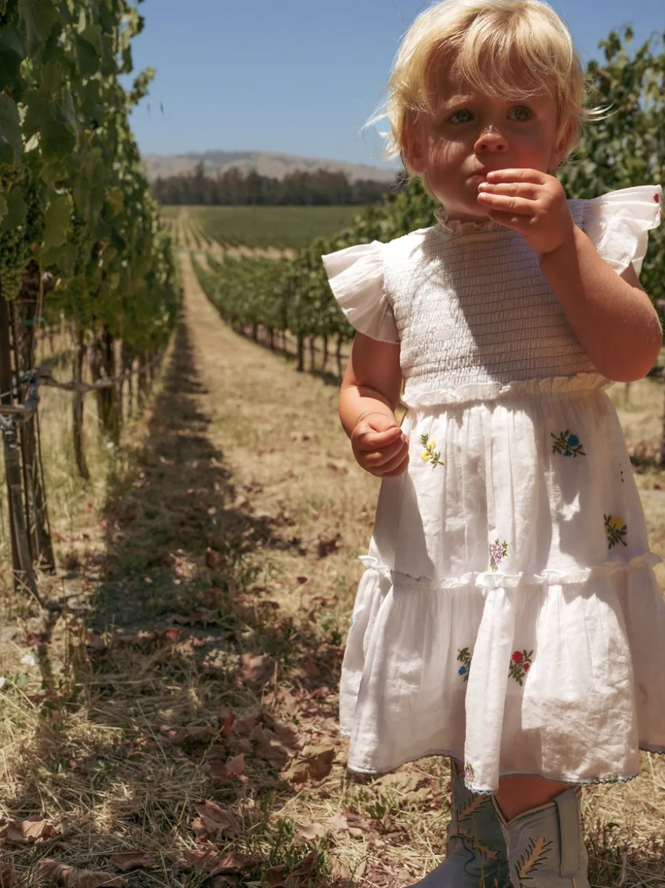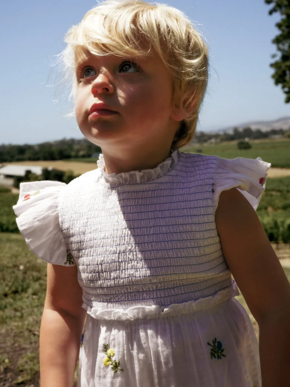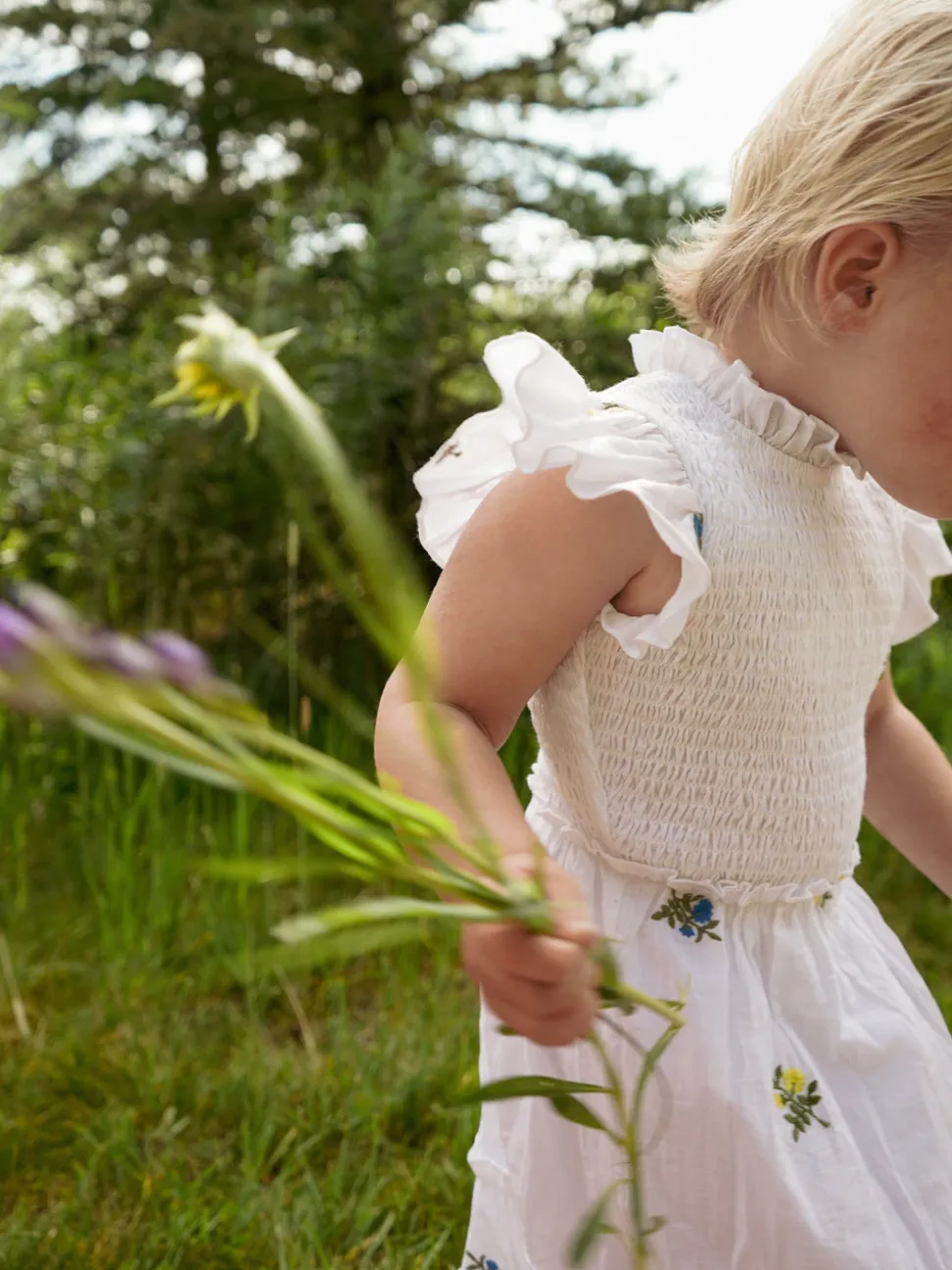 Tomboy looks, girly-girl styles, and an always fashionable approach define EDDY’s aesthetic. With a focus on bold and feminine silhouettes, EDDY dresses and tops pair elevated California bohemian with global inspiration; these are clothes designed to make you feel good inside and out. The Little Lady Field Dress in White with Embroidery is stitched with freedom and play in mind—tailored for backyard tea parties, barefoot escapades, and lemonade stand CEOs-in-training. Crafted from airy white cotton and delicately embroidered with scattered blooms, it features a smocked bodice for comfort, a twirl-friendly skirt, and side pockets for treasures of all kinds. The sweetest dose of everyday magic.