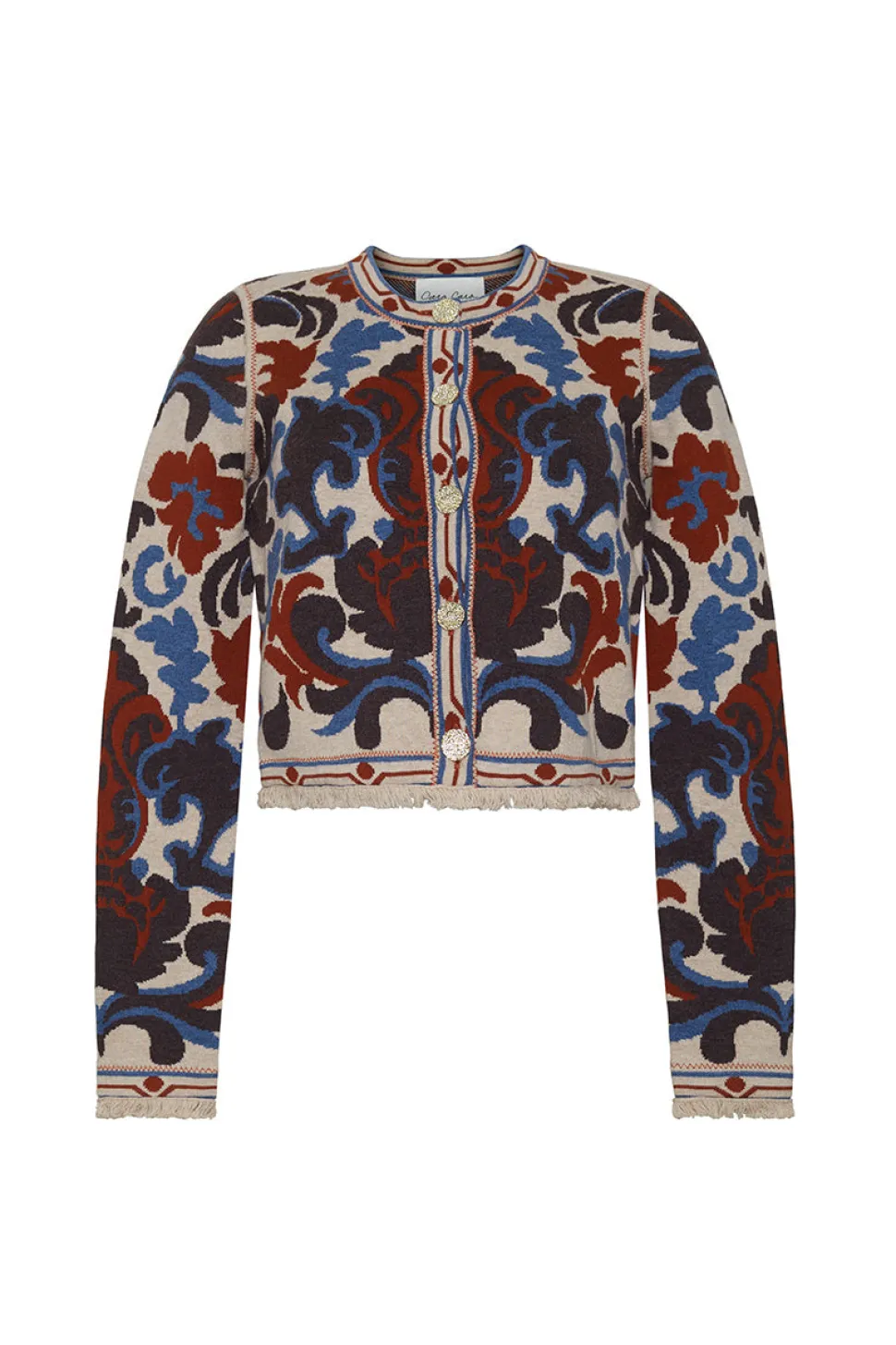 Jacquard knit jacket with fitted boxy shape. Novelty gold buttons. Long sleeves with fringe detail at cuff and bottom hem.