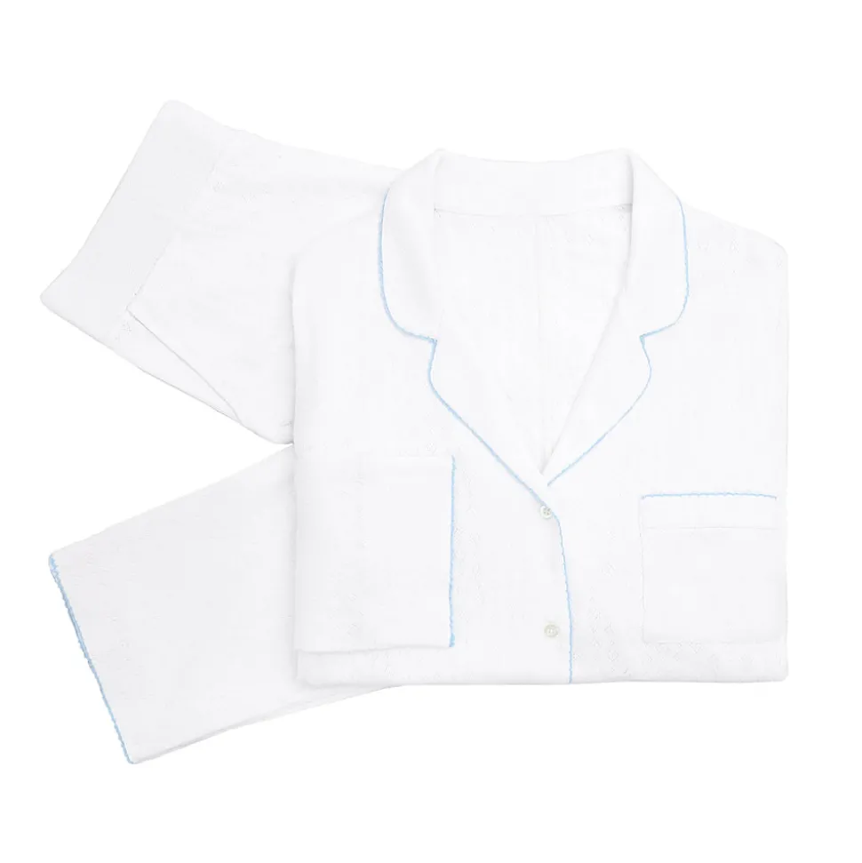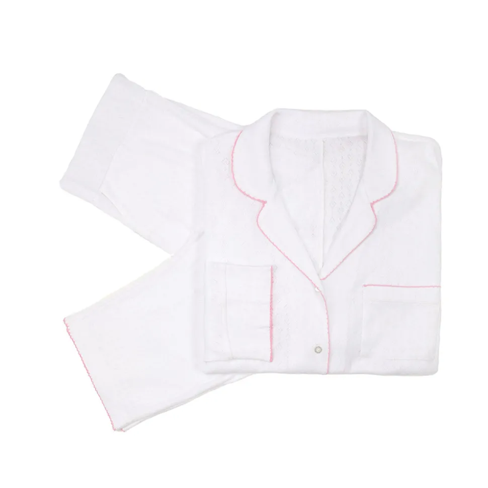 Timeless quality meets everyday living in Lenora’s ladies nightwear, travel accessories and baby clothes. Through their premium offerings, Lenora seeks to elevate every facet of a woman’s wardrobe, and their home. Crafted from exquisite pointelle cotton knit with a delightful heart pattern, the Liza Pointelle Cotton Long Pajamas are adorned with embroidered crochet trim for an extra touch of elegance. We love the chic, practical details, like the button-front top, notched collar, front pocket, and rounded edges at the hem. Mean while, the pull-on style pants feature a wide elastic waistband, ensuring a snug, comfy fit.