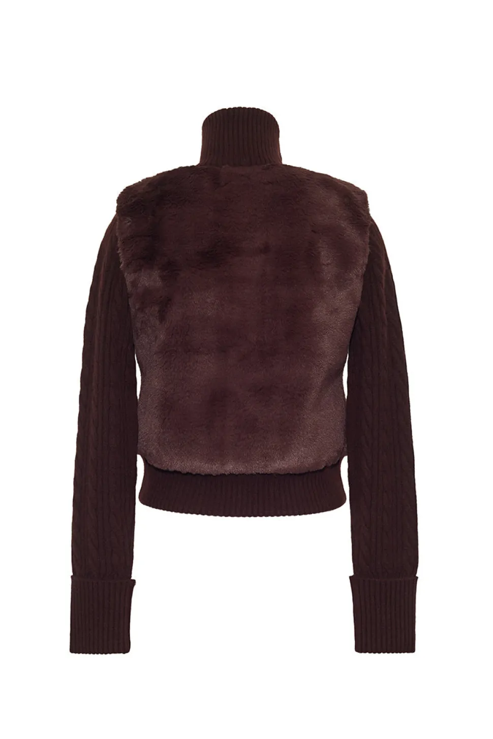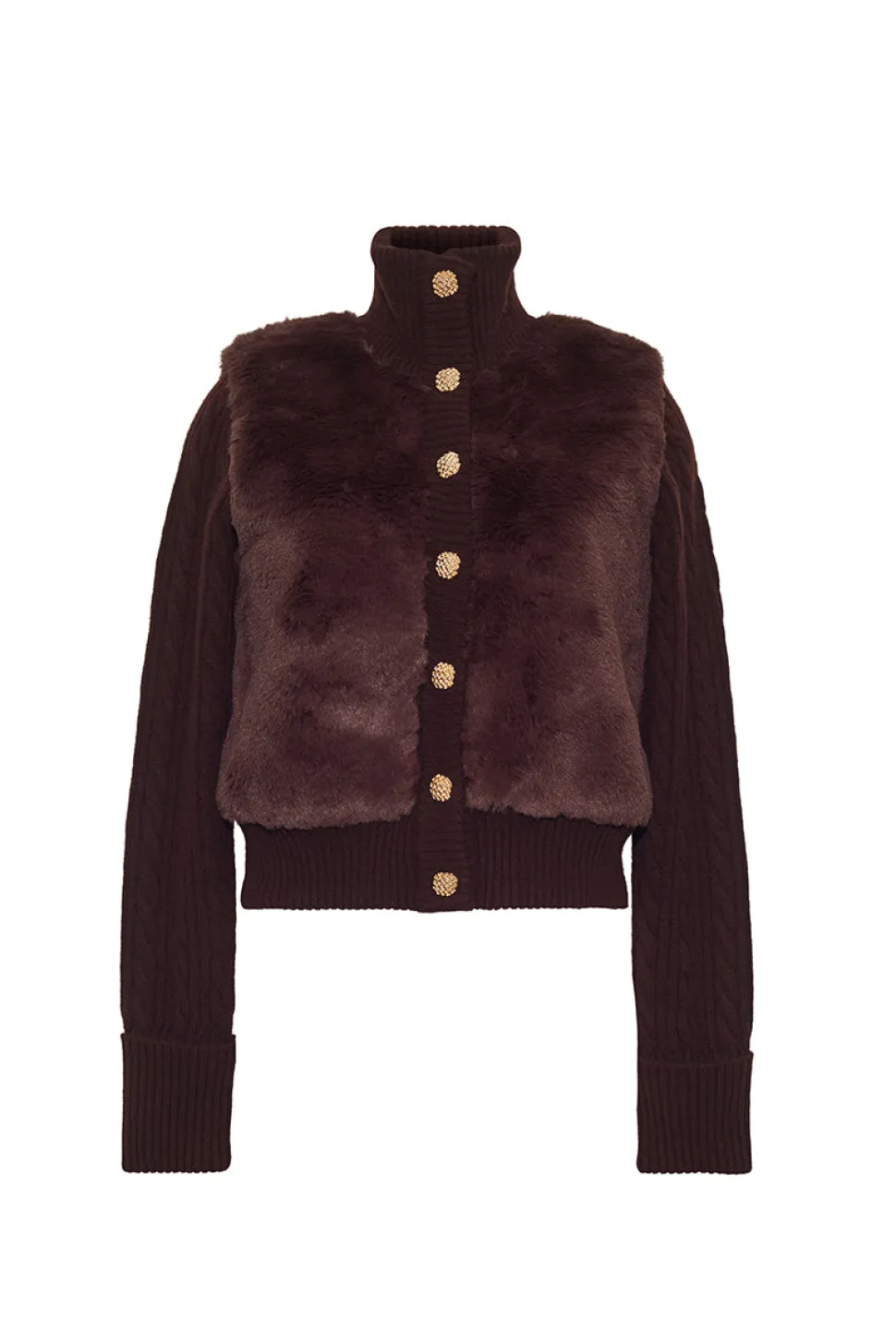 Founded by three New York City-based mothers who met through their kids, Cara Cara’s hallmarks include crisp poplin, house-designed prints, and casual glamour. The inspiration for their ethical womenswear comes from interior design, as well as the world’s most exotic locales. The Logan Jacket in Brown combines cable-knit with faux fur for a cozy yet sophisticated long-sleeve silhouette. It features ribbed trims, fold-back cuff details, and a funnel neck, accented by novelty gold buttons and an inside snap-down placket. A faux suede inner backing behind the fur adds comfort and structure to this statement layering piece.