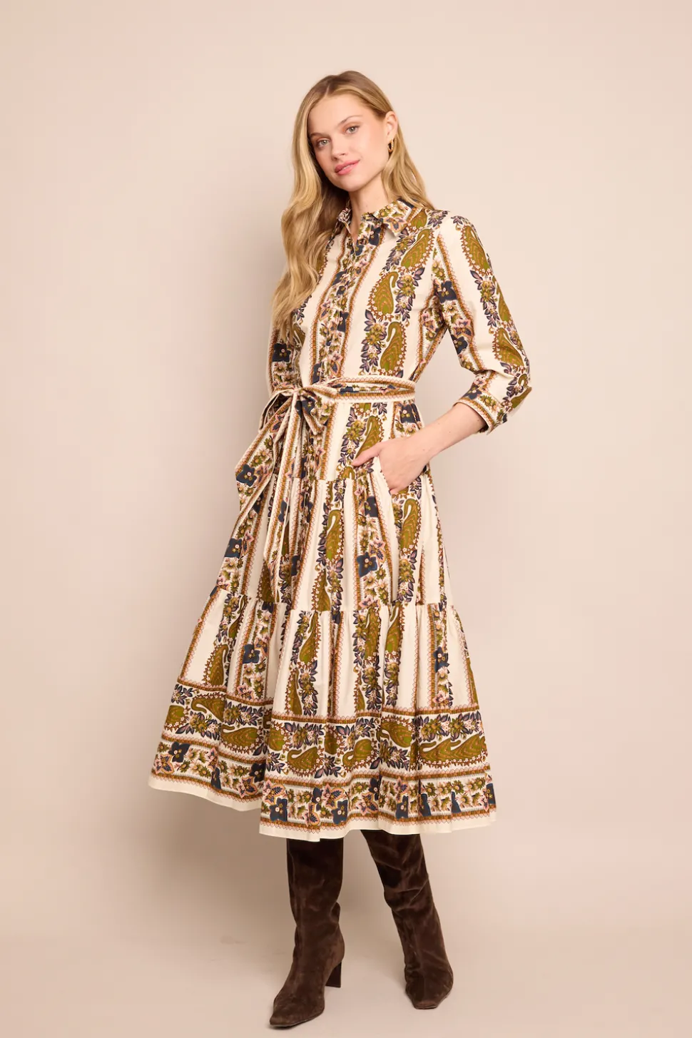 Founded by three New York City-based mothers who met through their kids, Cara Cara’s hallmarks include crisp poplin, house-designed prints, and casual glamour. The inspiration for their ethical womenswear comes from interior design, as well as the world’s most exotic locales. The Lolita Dress in Paisley Trail Ivory reimagines the shirtdress with an intricate scarf print. Cascading tiers begin at the waist, adding structural detail to this festive, collared midi dress. A wide, removable sash with crochet bunny loops offers versatile styling options. Functional center front placket, signature self-covered buttons with gold eyelets, side-seam pockets, and cuffs featuring back slits with self-covered button closures complete this elegant design.