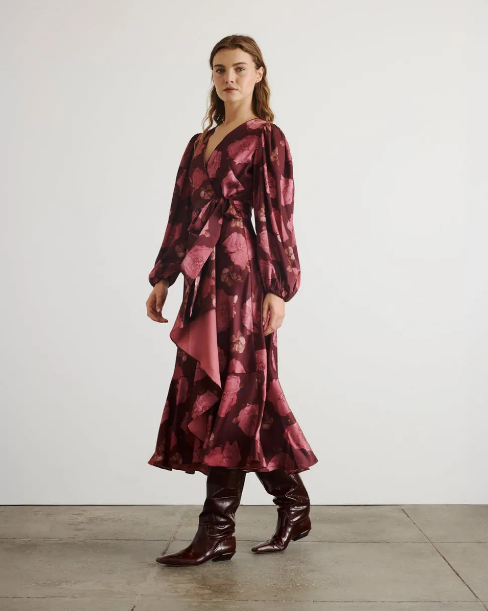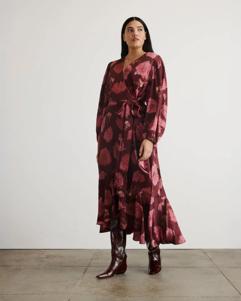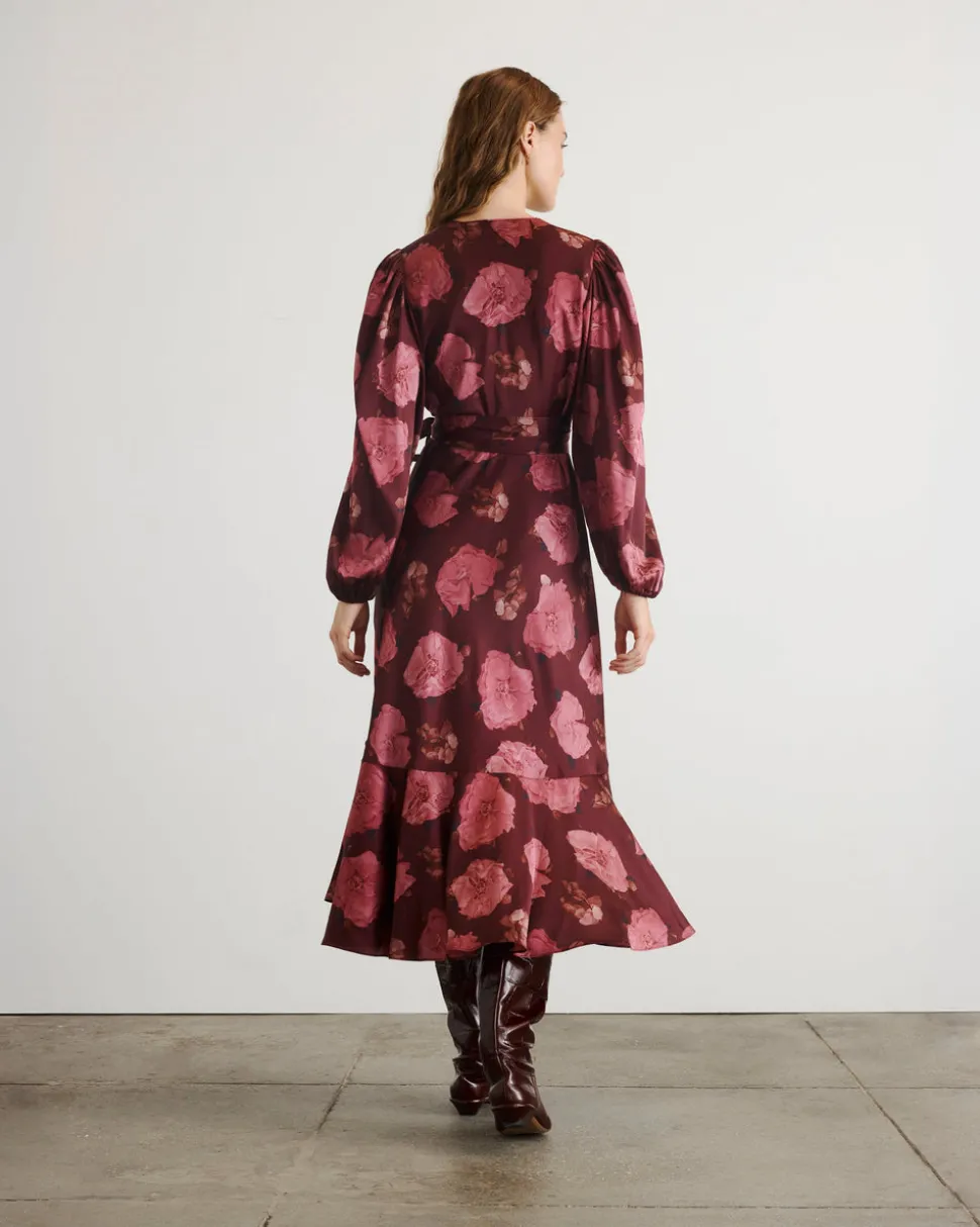 Creating clothing that inspires confidence, celebration, and community, Tanya Taylor is a New York-based womenswear brand whose mission is to provide practicality and style to a range of ready-to-wear in inclusive sizes. Each collection is thoughtfully designed through the artful use of color, texture, and original hand-painted prints. The Long Sleeve Blaire Dress in Mahogany & Soft Carmine Multi returns in a romantic Rose Garden print. Crafted in stretch silk for a soft, luxurious feel, this faux-wrap midi features a bias-cut skirt with a cascading ruffle and long sleeves for a flattering, transitional silhouette with everyday polish and event-ready elegance.