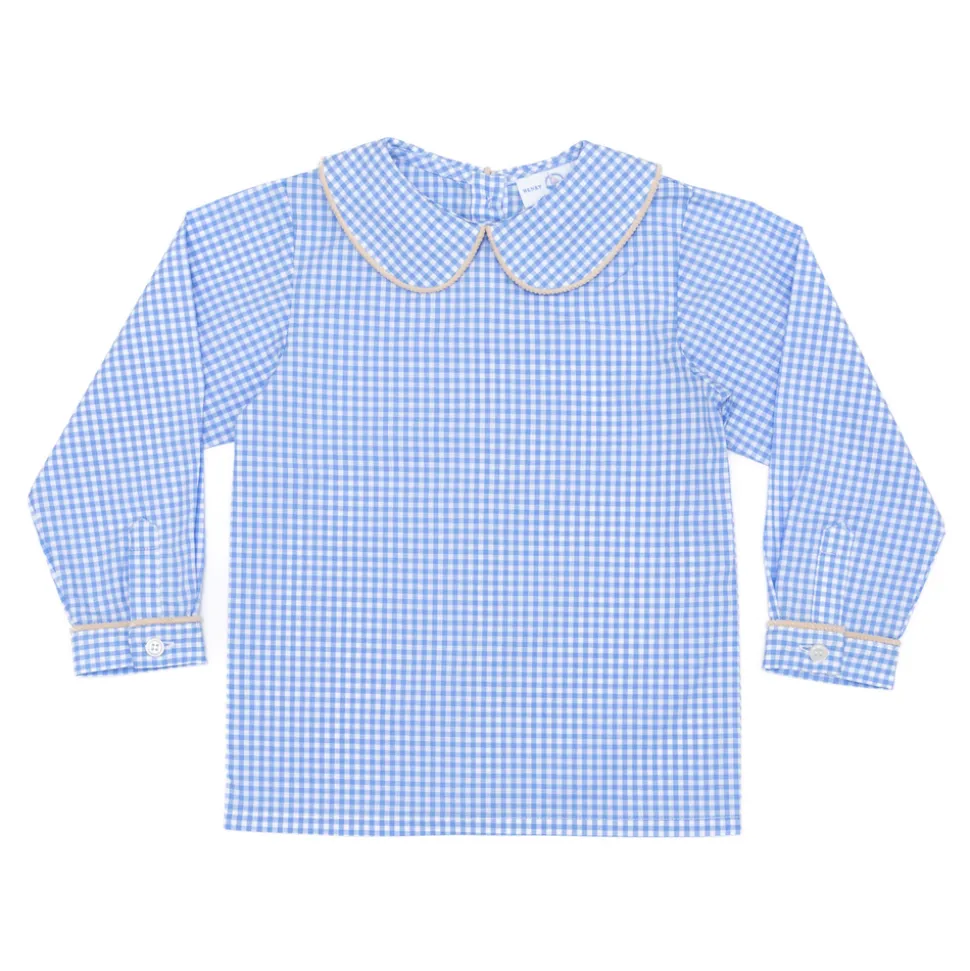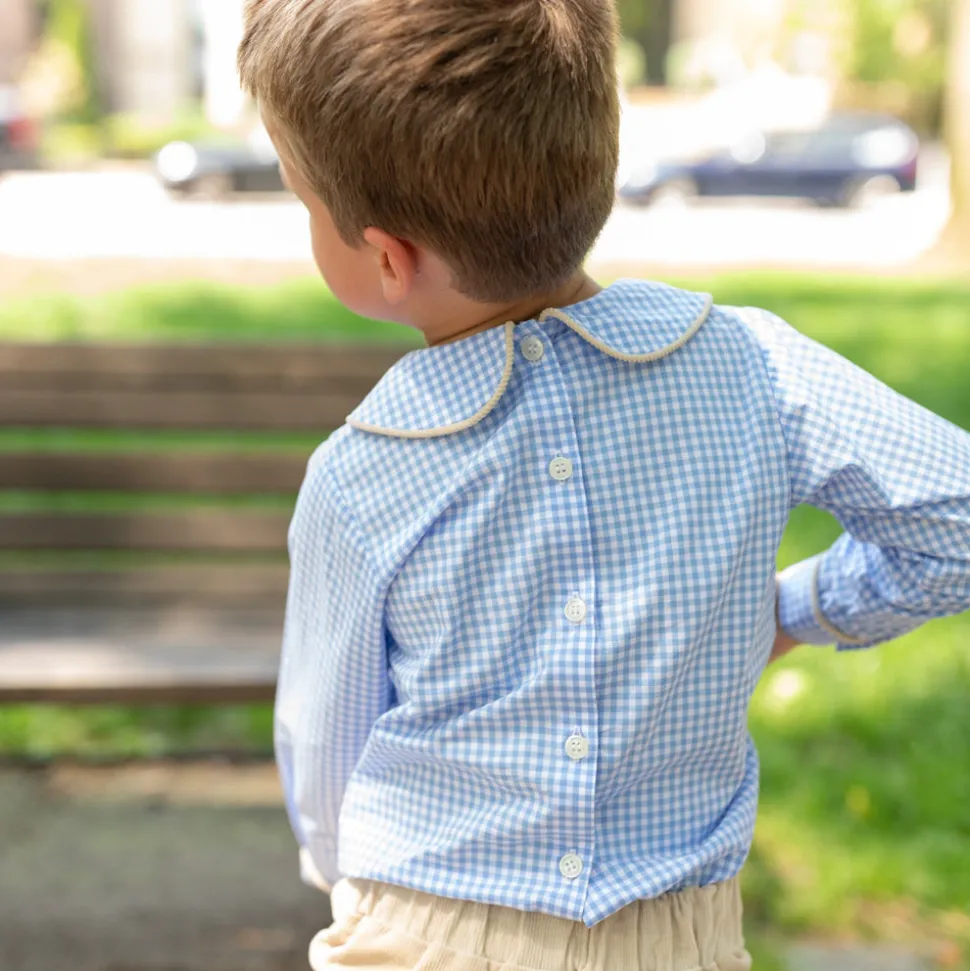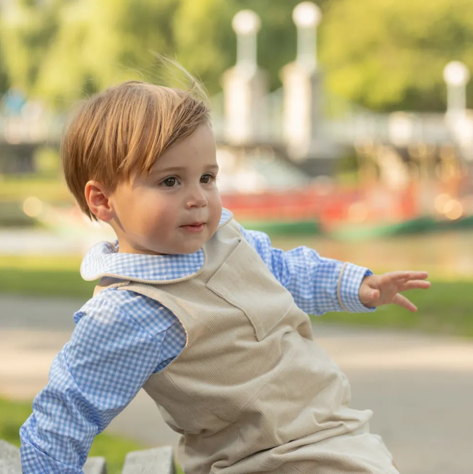 A celebration of the spirit of boyhood, the updated classics from Henry Duvall are curious, imaginative, and sweet. Full of character and playful details, these are easy-to-care-for clothes that families will love. A classic favorite, reimagined for fall, the Henry Peter Pan Shirt returns in Charles Street Check, a crisp and timeless blue gingham that brings heritage charm to every autumn occasion. Finished with a Peter Pan collar and designed for layering, it pairs beautifully with the Oliver Overalls in King’s Way Khaki Corduroy for a refined seasonal look. Equally suited for family photos, festive gatherings, and Thanksgiving dinner, this versatile shirt makes toddler outfitting effortless and elegant. The gentle blue tones of the gingham coordinate seamlessly with fall hues, offering a polished option for every occasion.