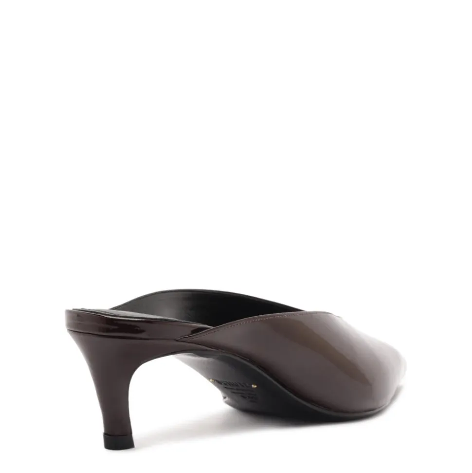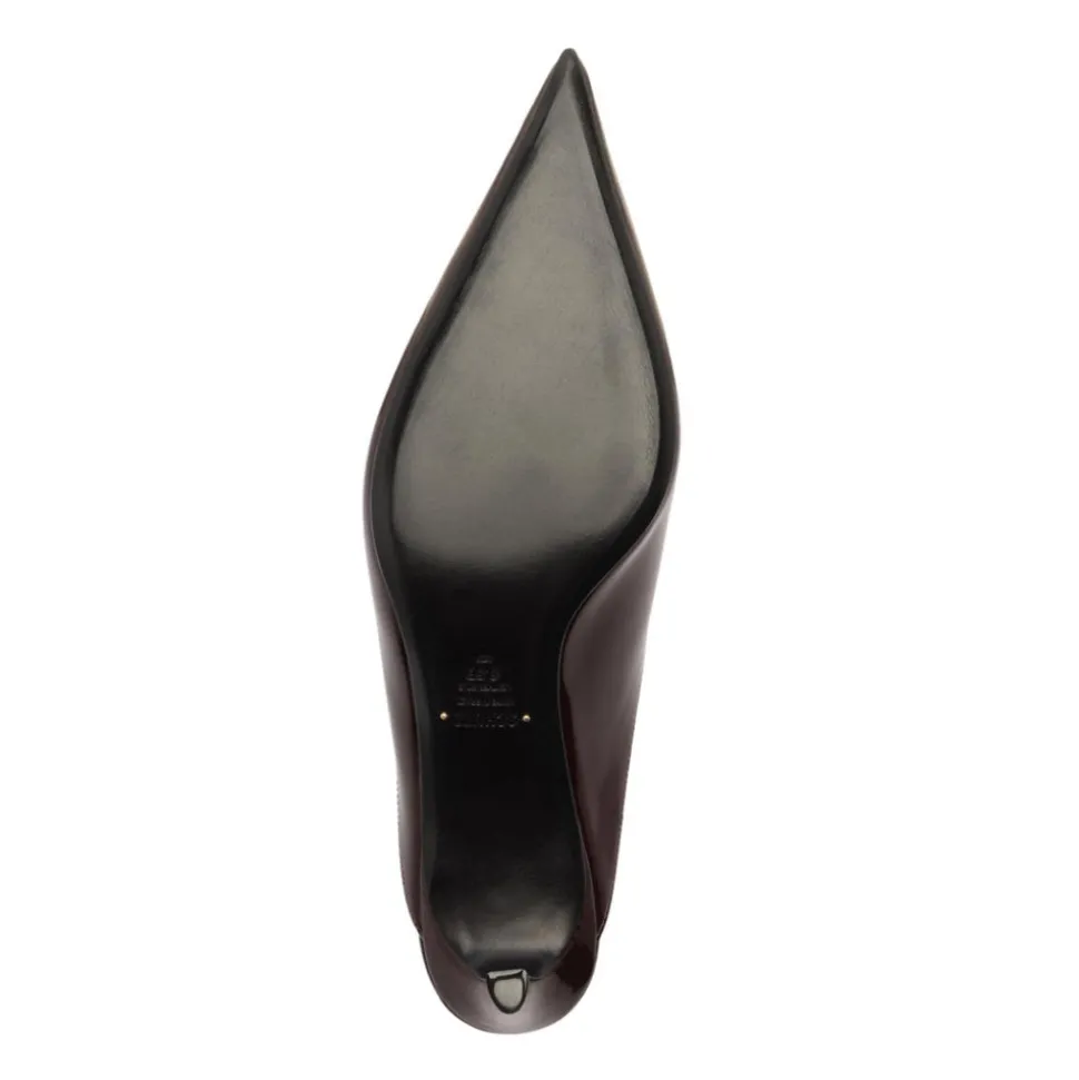 Patent leather upper. Man-made lining. Man-made sole. Mid stiletto heel. Pointed toe.