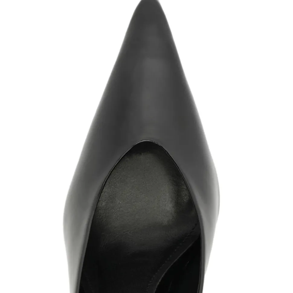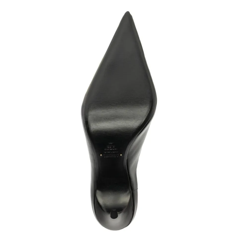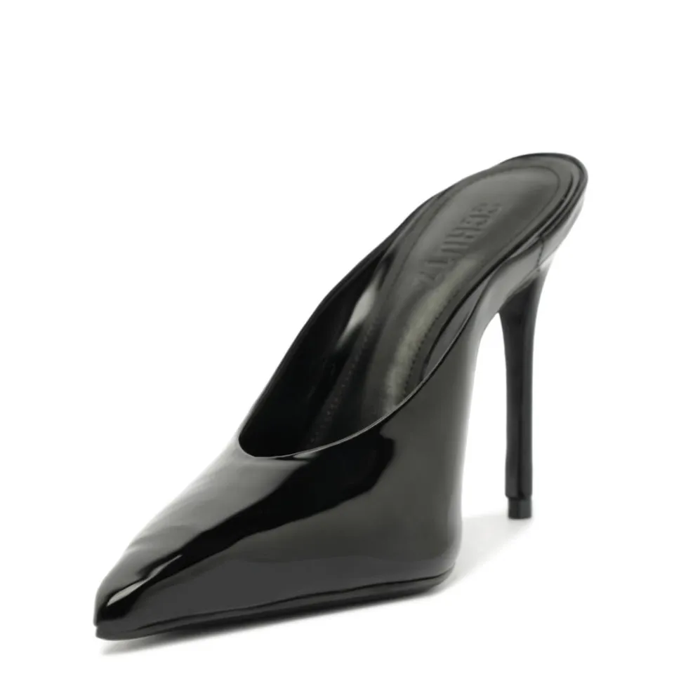 Patent leather upper. Man-made lining. Man-made sole. High stiletto heel. Pointed toe.