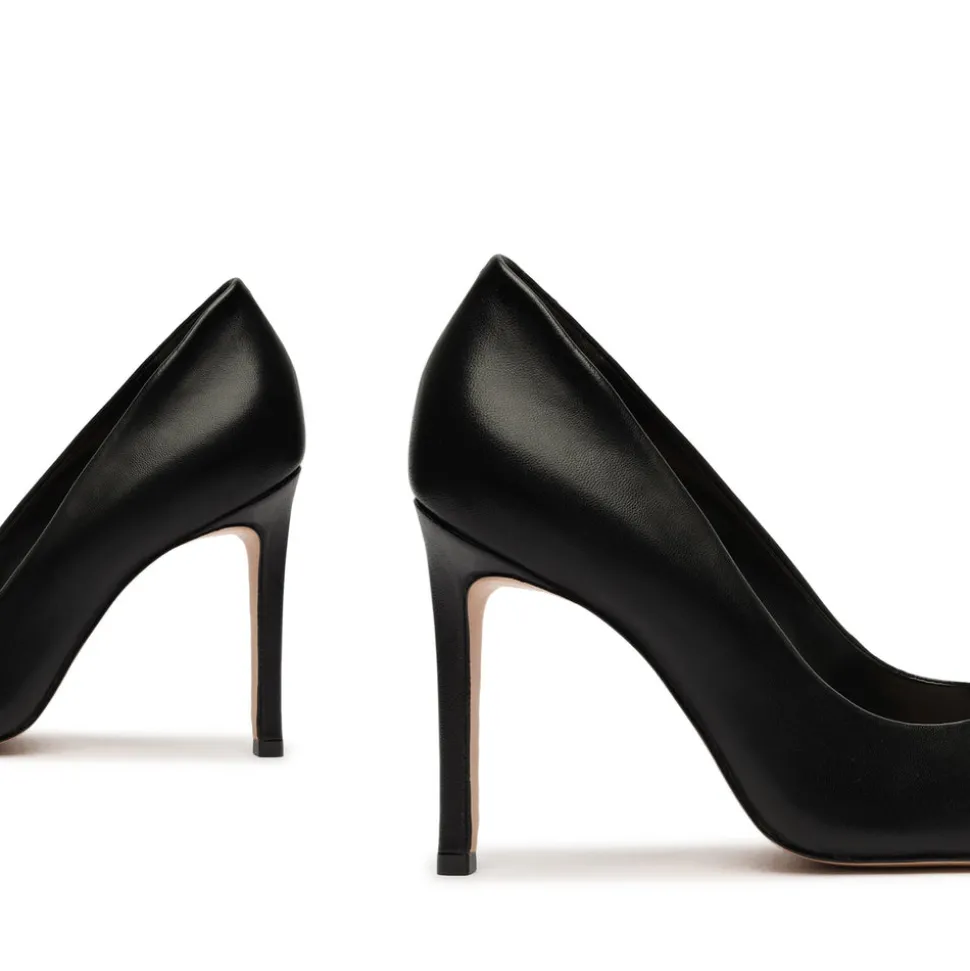 Materials: Nappa leather cow leather lining. Rubber patch at the heel. Stiletto heel. Slip-on. Pointed toe. Heel Height: 3.9″.