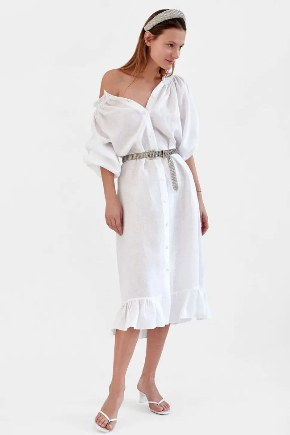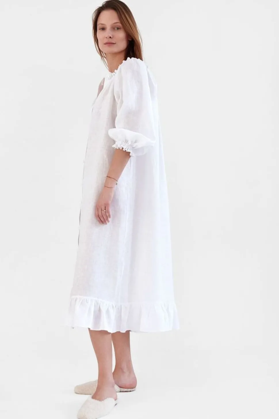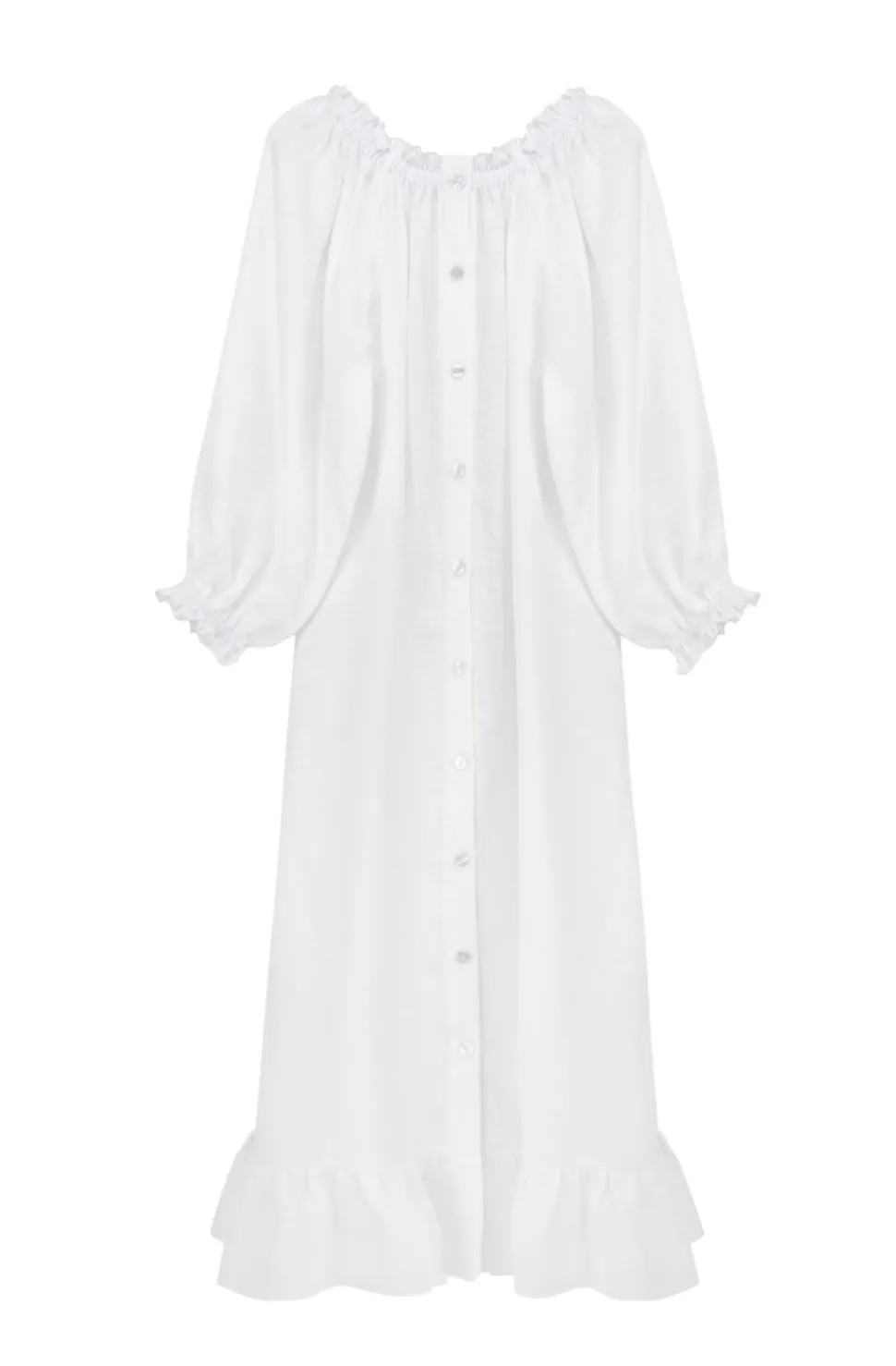 This 100% linen dress is perfect for chilling at home. Sleeves and neckline are fixed with a soft elastic band so that you can wear off or on the shoulder, buttoned up or down, or add a belt.