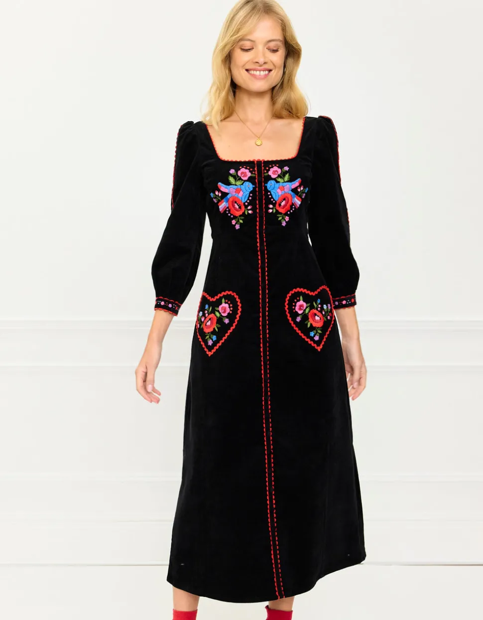 100% cotton corduroy. Hand-embroidered with vibrant lovebirds. Red ric-rac trim. Heart-shaped pockets. Made in India.