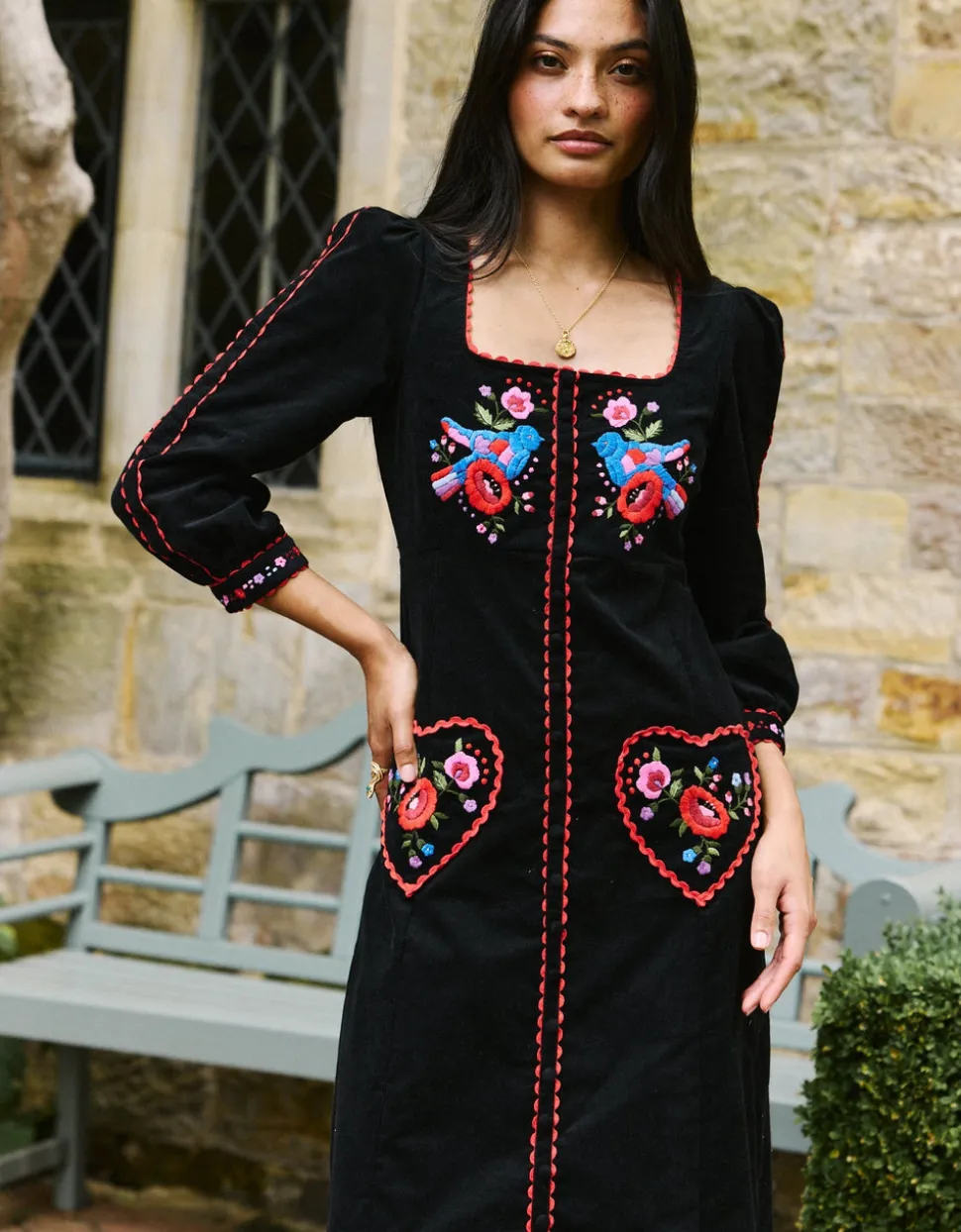 Color and creativity are the foundations of Pink City Prints, a brand inspired by founder Molly Russell’s life in Jaipur. In her inimitable dresses, you’ll find centuries of craft knowledge, expressed through unmatched quality and traditional techniques, like hand embroidery, block printing, and hand-looming. An heirloom in the making, the Love Bird Embroidery Olivia Dress is crafted from soft black corduroy and hand-embroidered with vibrant lovebirds in reds, blues, and pinks — a process that takes up to two and a half days for each piece. A square neckline and red ric-rac trim add playful detail, while heart-shaped pockets showcase intricate stitching. A true work of wearable art, it’s a dress designed to be treasured for years to come.