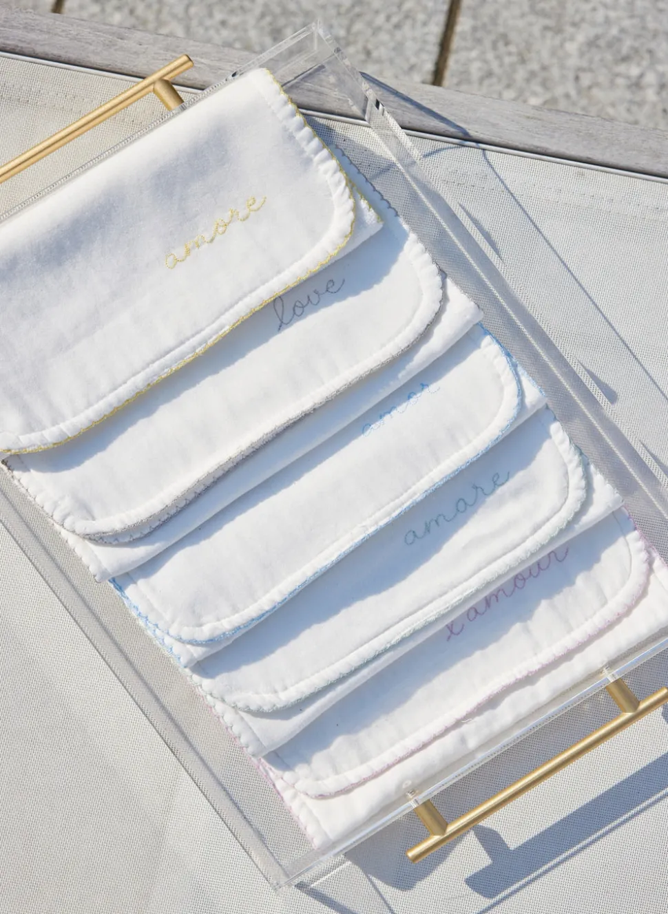 Set of 5 burp cloths. Made with 100% GOTS certified organic cotton. Finished with a picot edge. Made in Portugal.