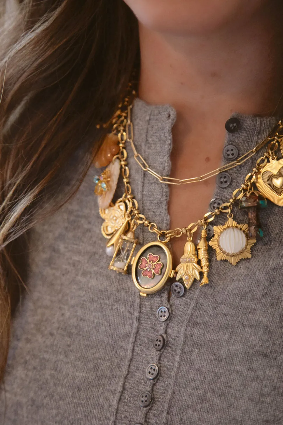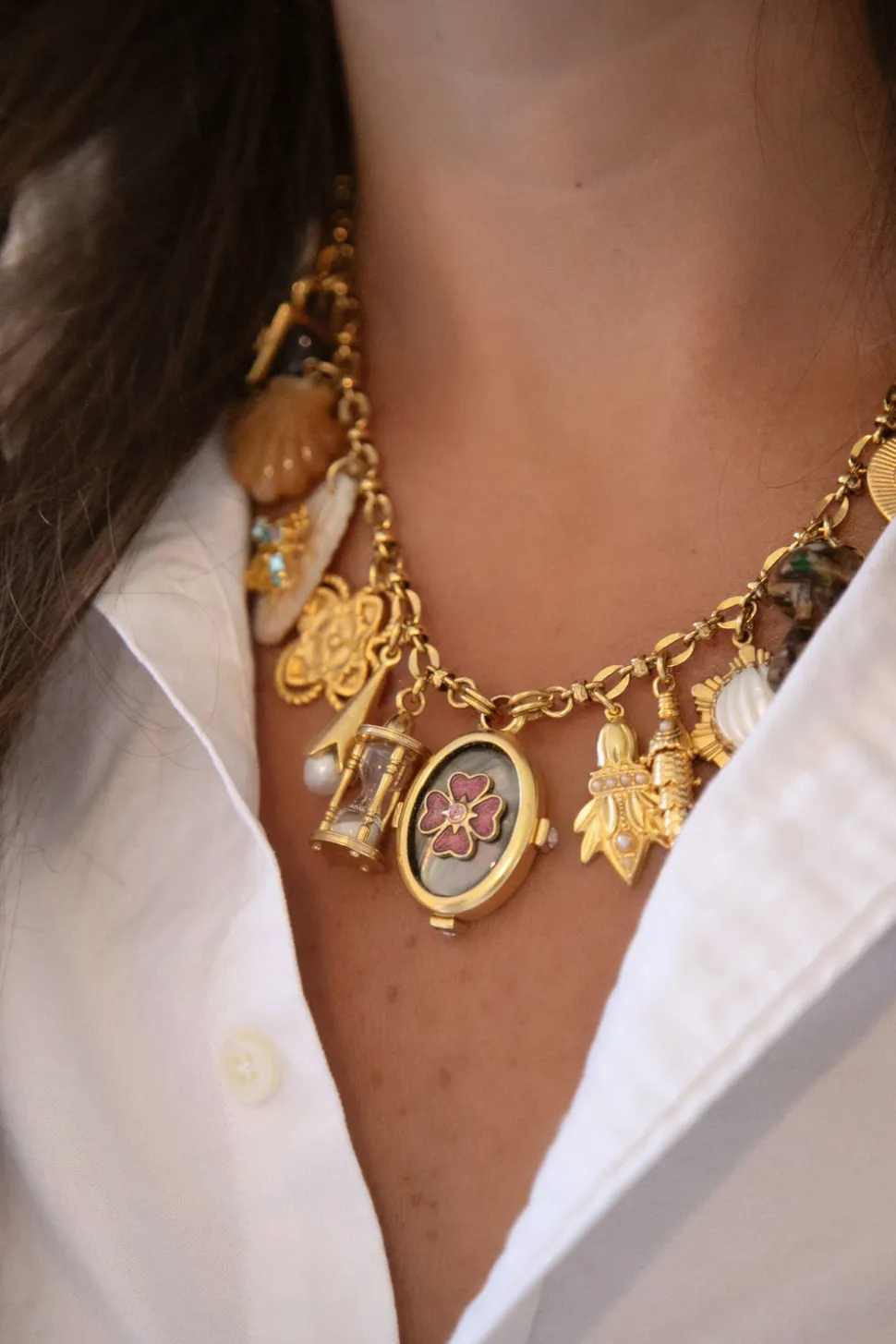 The mother-daughter duo behind Brinker + Eliza combine their experience in metalsmithing and fashion to create incredibly unique jewelry that feels custom-made. Employing pearls, shells, and earth’s most prized organic forms, these are pieces to be not just worn but treasured. The Love Note Necklace features a trove of vintage charms, semi-precious stones, and treasured mementos that were all sourced over the course of years. Some charms are vintage and others are natural, meaning that every embellishment on the Love Note Necklace is one of a kind.