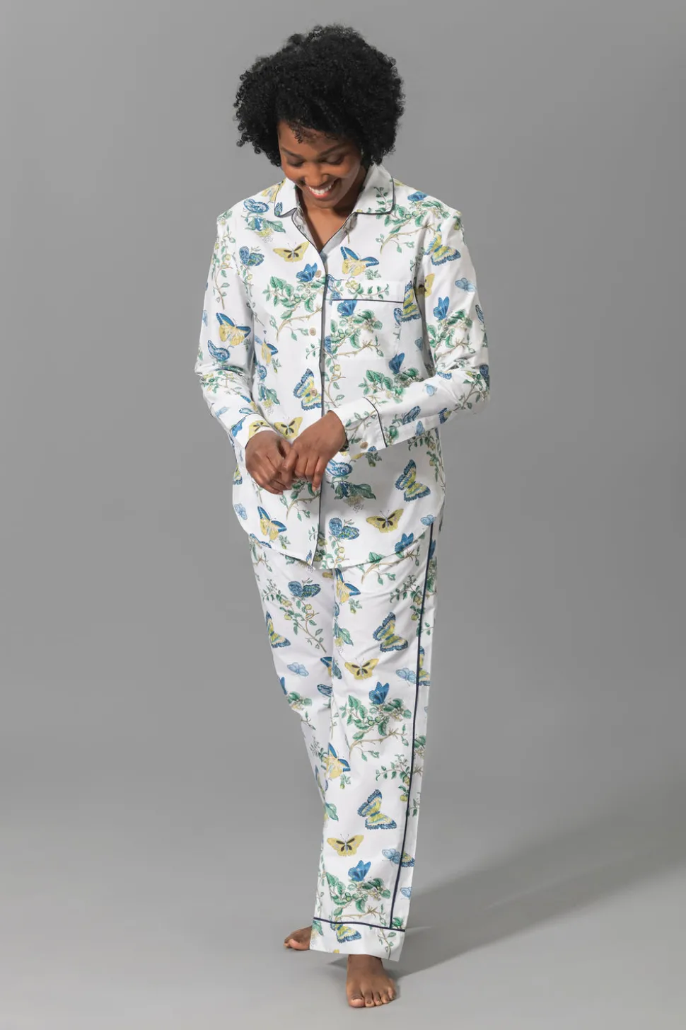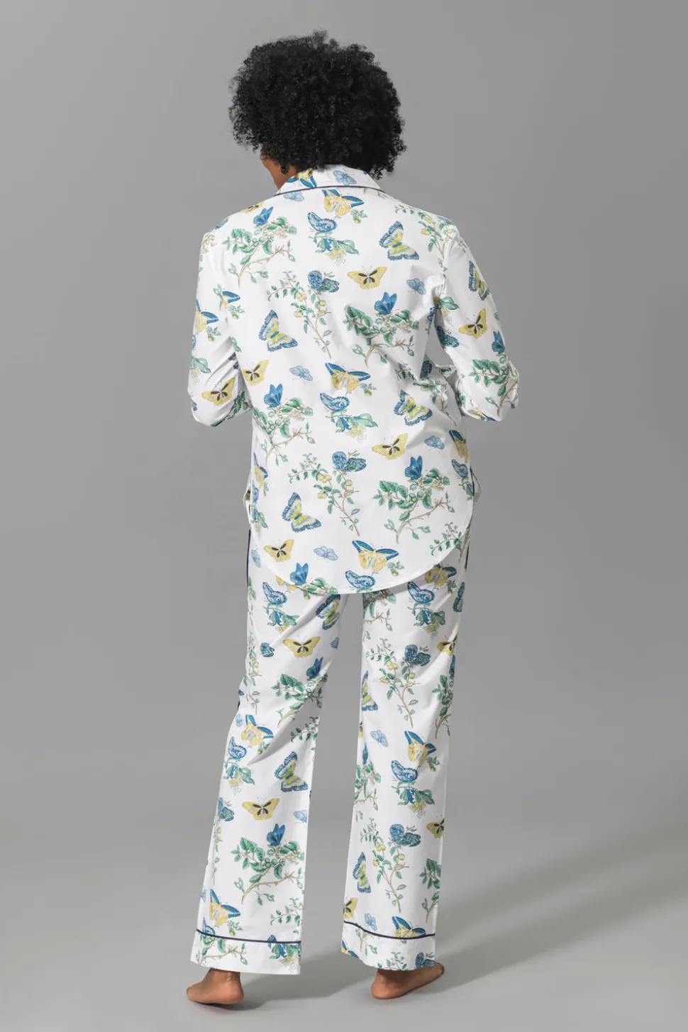 For nearly 100 years and three generations, Matouk has handcrafted luxury linens from the world’s finest materials. Their dedicated artisans in Fall River, Massachusetts are committed to creating the highest quality, most-loved bed, bath, and table linens for your home. Crafted from dreamy cotton percale in a range of vibrant Schumacher prints, the Luca Pajama Set in Baudin Butterfly Blue combines the luxury of Matouk sheeting with the comfort of your favorite lived-in dress shirt. The top features natural corozo buttons, piped details, and a scooped hem. The drawstring trousers have elastic in the back for extra comfort and a flattering fit. Beautifully tailored, these pajamas are just as chic outside the house as they are in the bedroom. Each set arrives in a Matouk gift box.