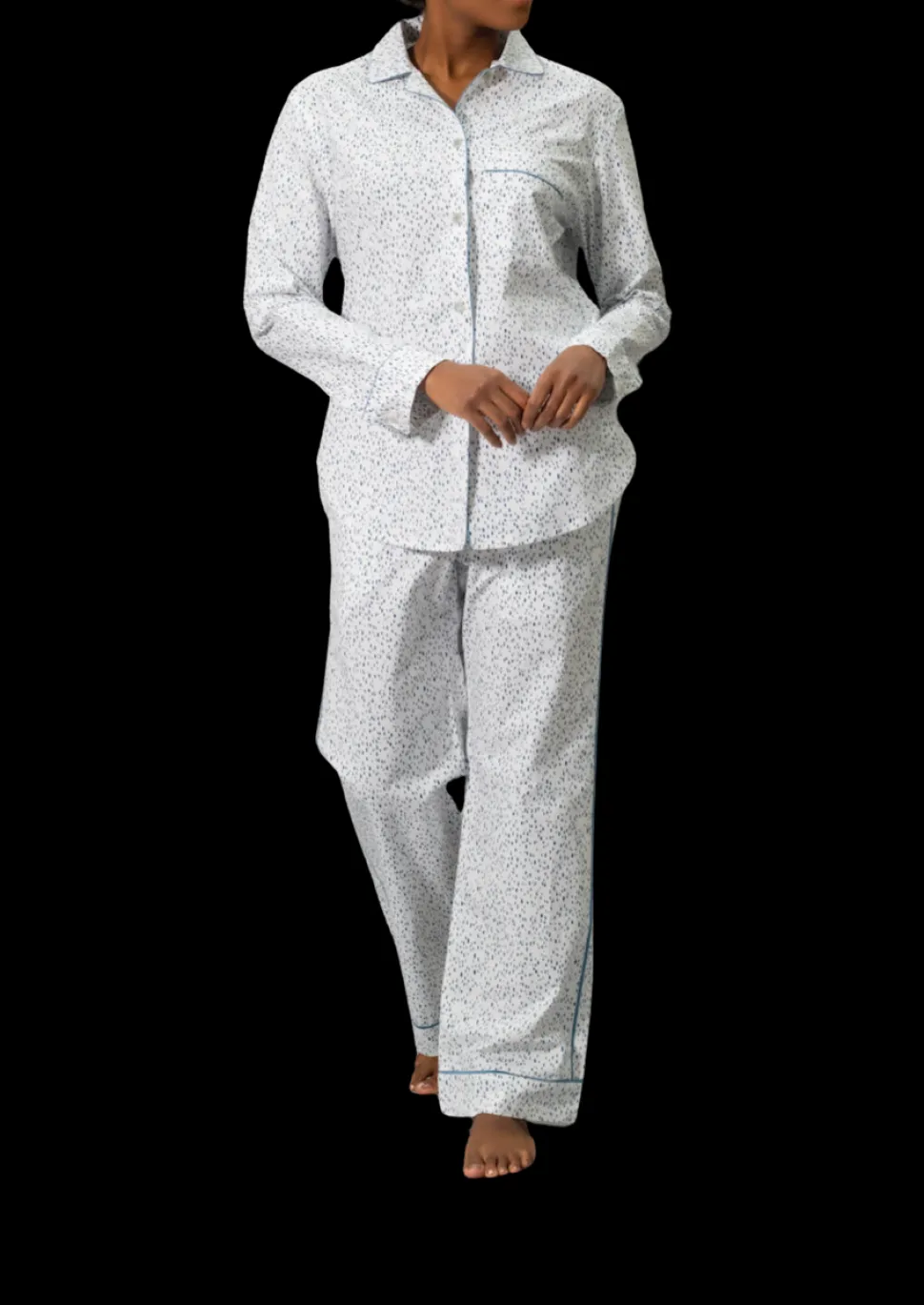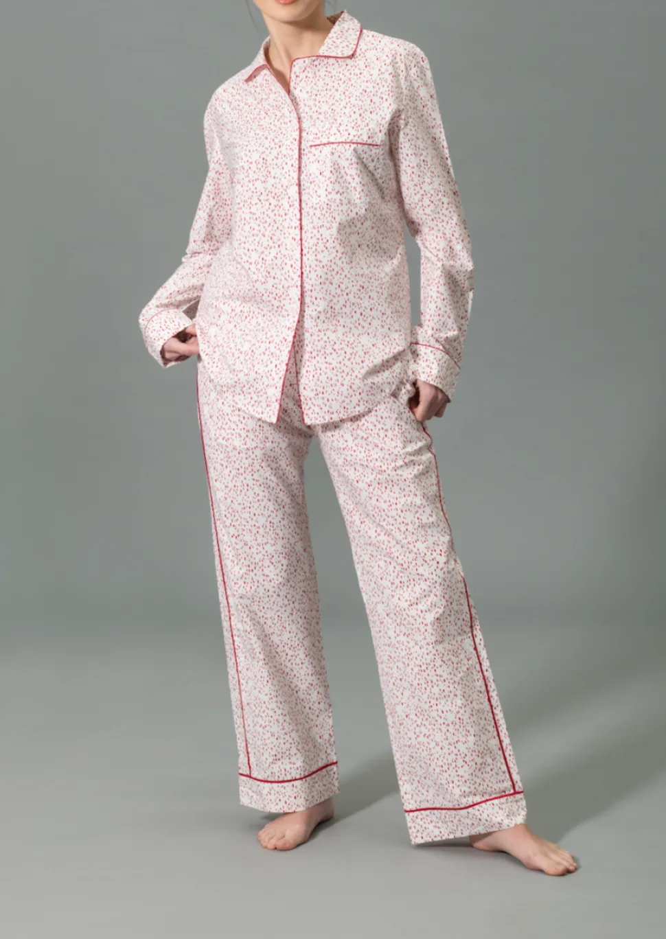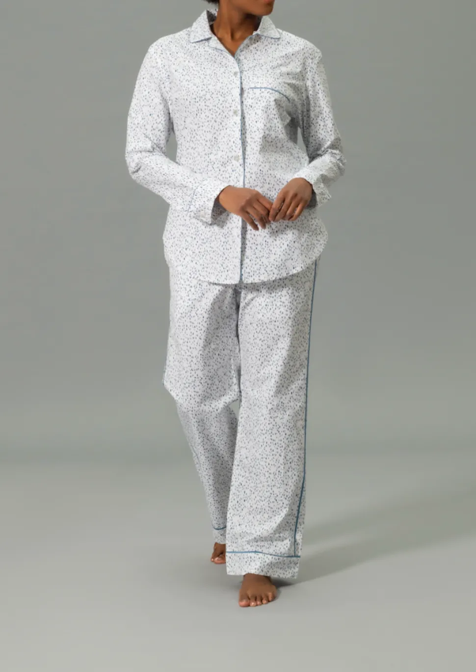 For nearly 100 years and three generations, Matouk has handcrafted luxury linens from the world’s finest materials. Their dedicated artisans in Fall River, Massachusetts are committed to creating the highest quality, most-loved bed, bath, and table linens for your home. Crafted from Matouk’s dreamy Luca cotton percale in a range of vibrant Schumacher prints, the Luca Pajama Set in Celine is a combination of the luxury of Matouk sheeting with the comfort of your favorite lived-in dress shirt. The top features natural corozo buttons, piped details, and a scooped hem. The drawstring trousers have elastic in the back for extra comfort and a flattering fit. Beautifully tailored, these pajamas are just as chic outside the house as they are in the bedroom.