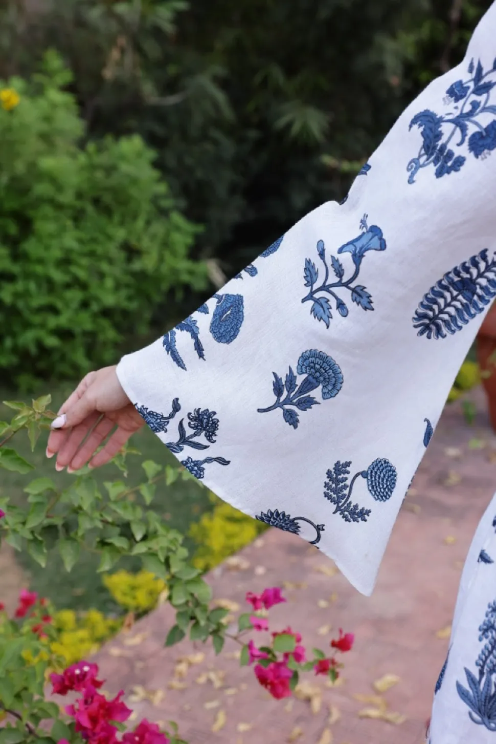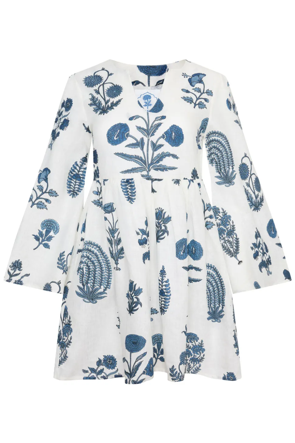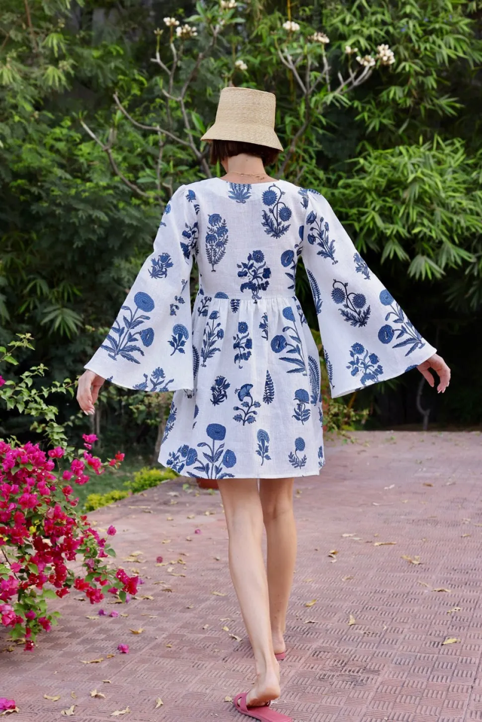 Introducing Maison Marigold, a new luxurious small-batch women’s resortwear brand inspired the wanderlust of travel. Our collections effortlessly transition from beachside lounging to an elegant evening on the town. The simplicity of design and classic silhouettes are the foundations for each and every style. Hand-printed linen and cotton make for comfortable and effortless pieces that are both feminine and flattering. Made from 100% European linen, Lugano Mini Dress in Indigo Botanical is bound to be your go to dress for any occasion. The Lugano features a uniquely crafted multi-botanical print, feminine sculpted v-neckline, bell sleeves, and a hidden side seam zip and pockets. This feminine and flirty dress is easy to wear and ideal for dreamy vacations and special occasions.