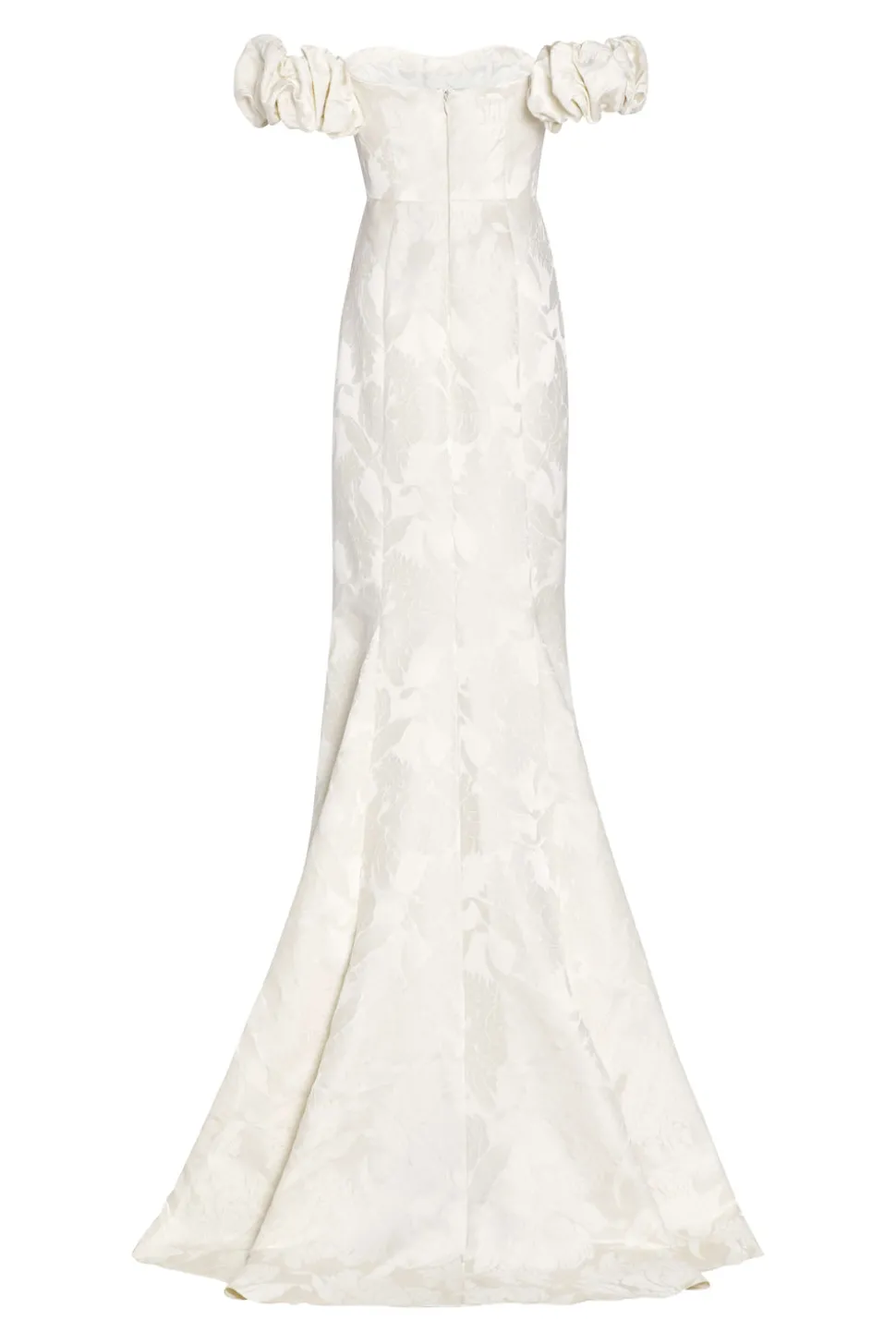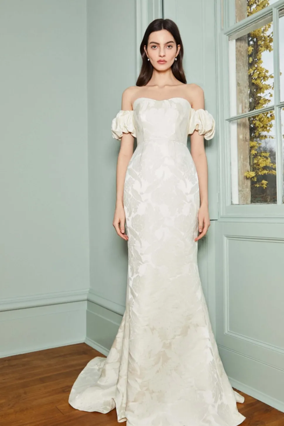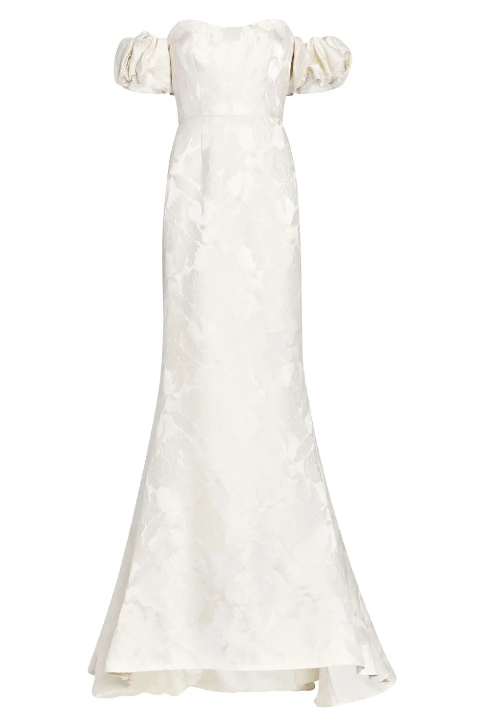 Named after a particularly radiant group of galaxies, Markarian combines designer Alexandra O’Neill’s love of the cosmos and celestial romanticism with timeless design and modern silhouettes. A forward-thinking approach to fashion and a focus on fine craftsmanship result in dresses that are beautiful, well-made, and flattering. Here, the Luisa Off-The-Shoulder White Floral Jacquard Gown features a sweetheart off-the-shoulder neckline and regal puff sleeves.
