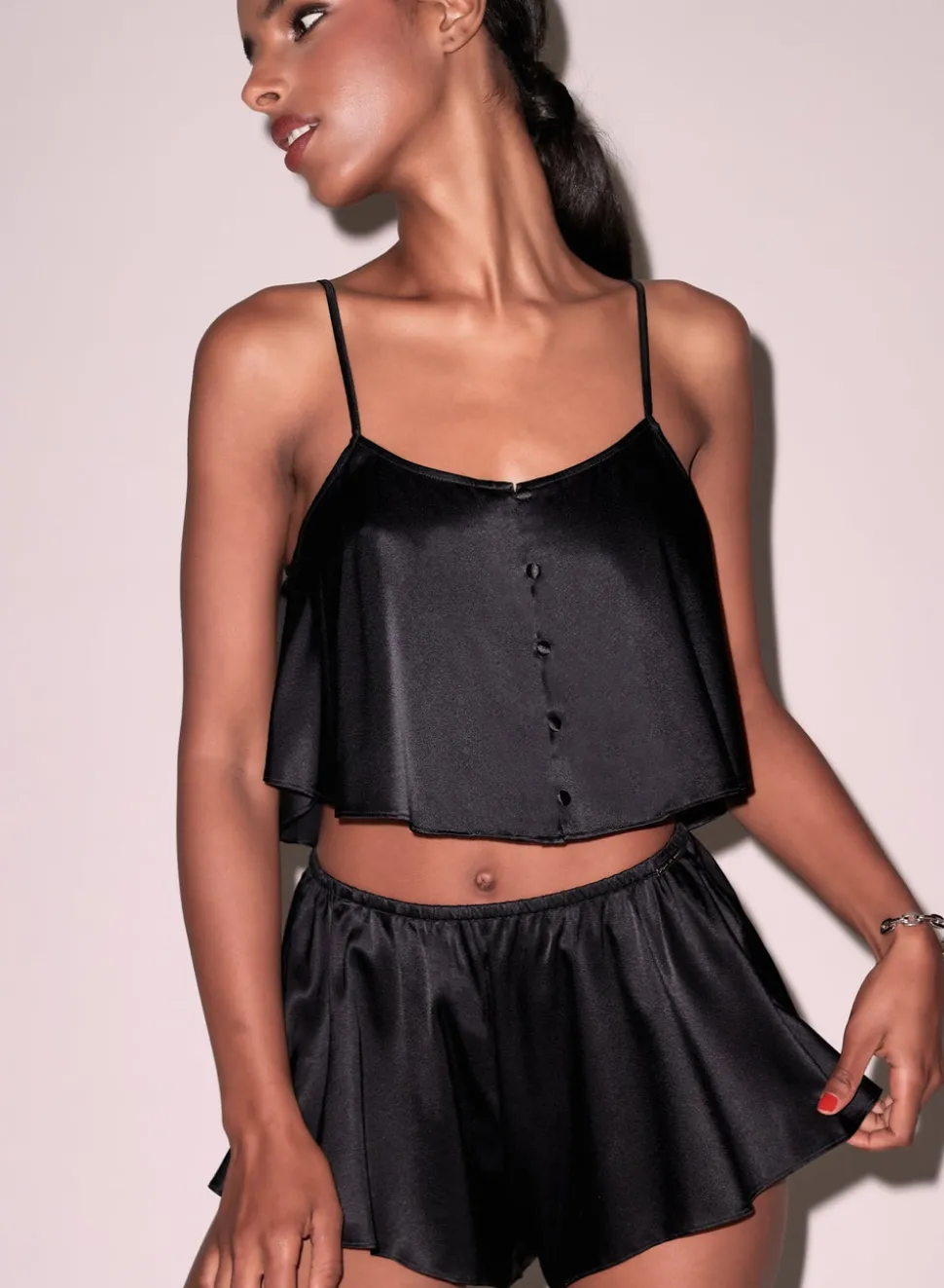 Inspired by Charles Baudelaire’s masterful collection of poetry entitled “Les Fleurs du Mal,” Jennifer Zuccarini founded Fleur du Mal with the belief that wearing beautiful lingerie should be an everyday affair. Tastefully provocative, the luxury brand has amassed a cult following of devotees who adore the sultry and empowering pieces. The Luxe Flutter Shorts feature a ruched elastic waistband and logo hardware detail. Easy, comfortable fit and flirty cheeky cut. Pair the set with the matching Luxe Flutter Cami.
