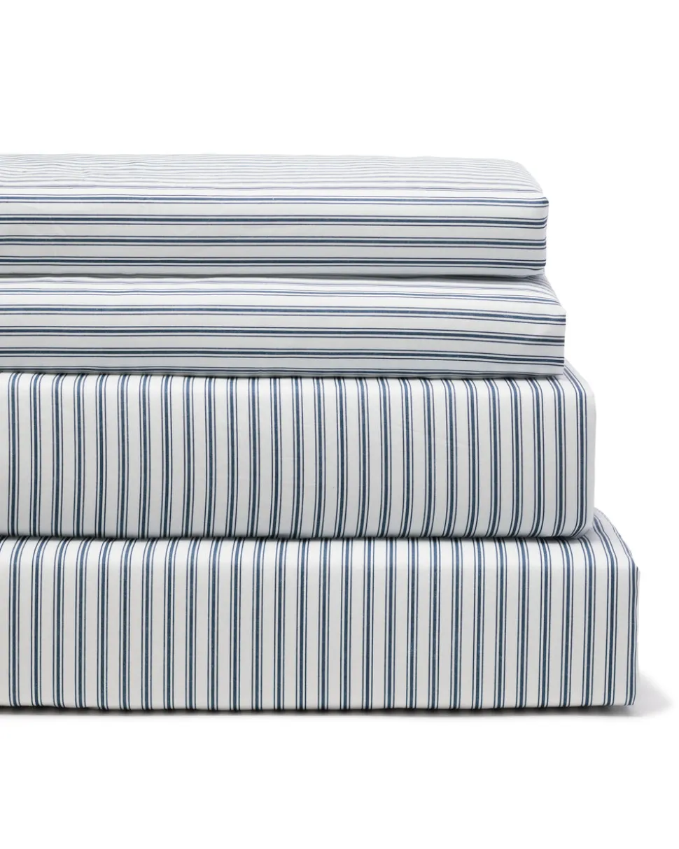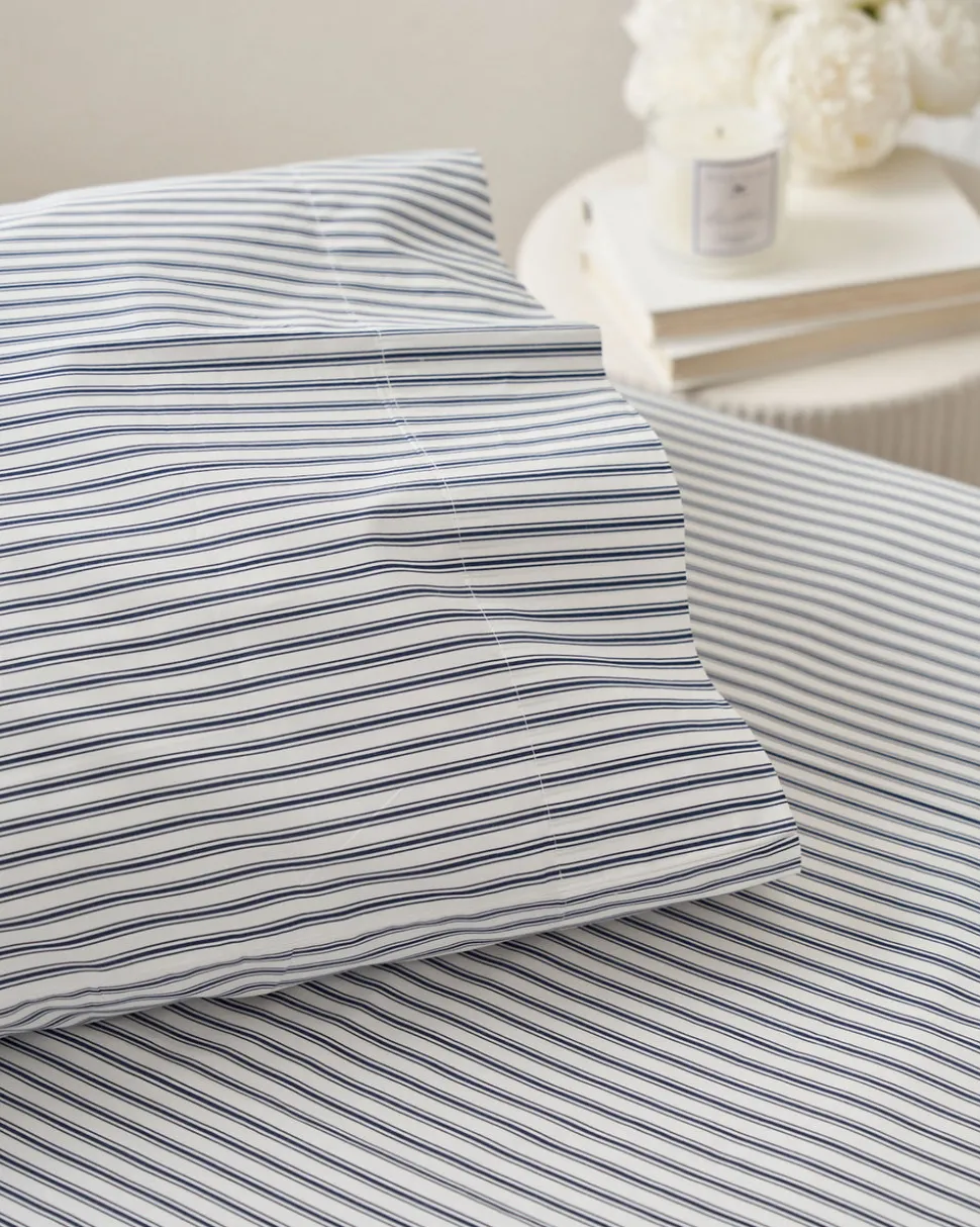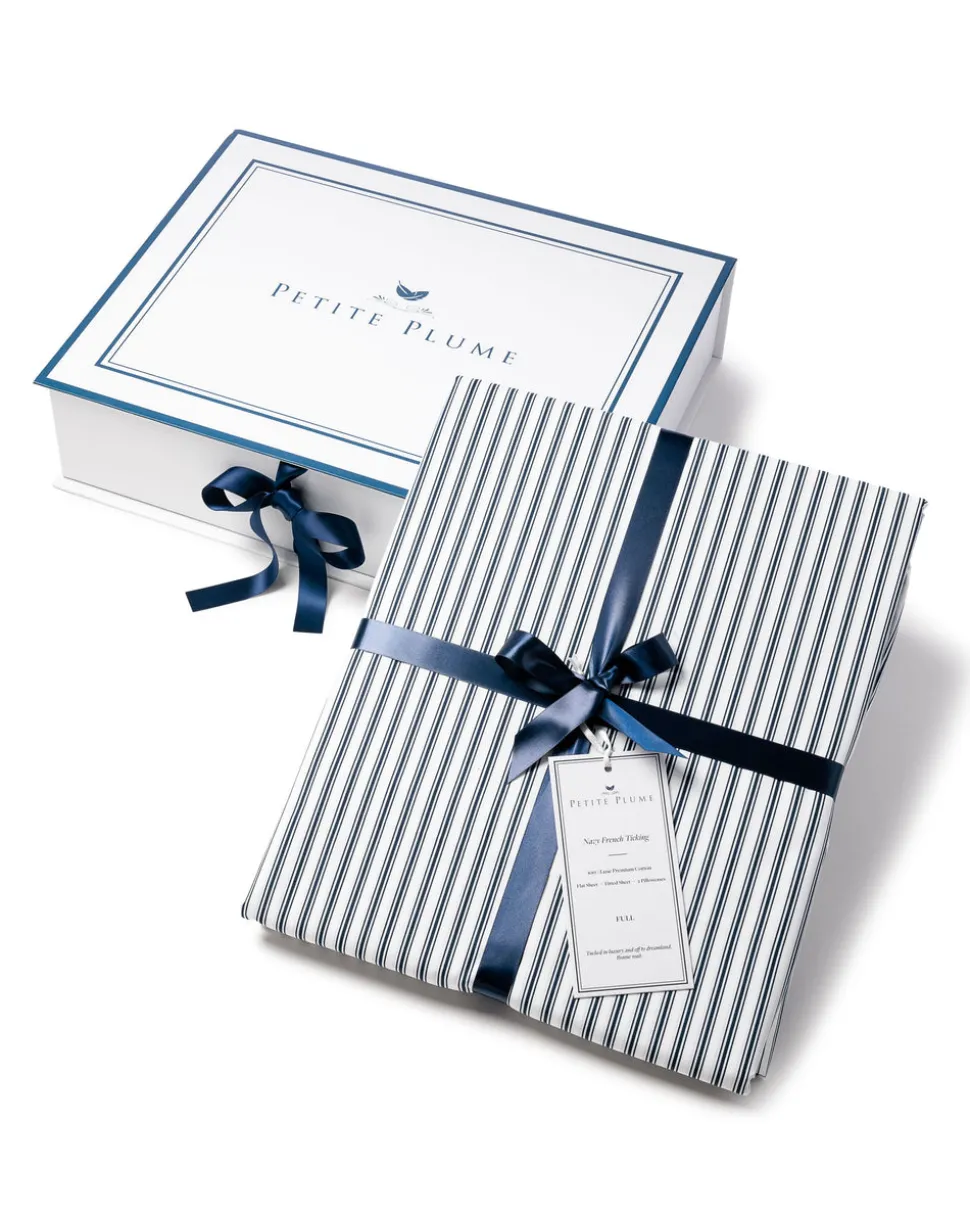 Petite Plume wishes you a “bonne nuit,” and in their luxury sleepwear, it’s hard not to oblige. Crafted in exquisite cotton, with the finest attention to detail, Petite Plume delivers the utmost comfort and sophistication. Made from luxe percale, the Premium 100% Cotton Navy French Ticking Bed Sheets are designed in the softest and most breathable cotton to keep cozy all night long. The cotton weave is crisp and cool to the touch, keeping you warm in wintry weather and cool in warmer temperatures.