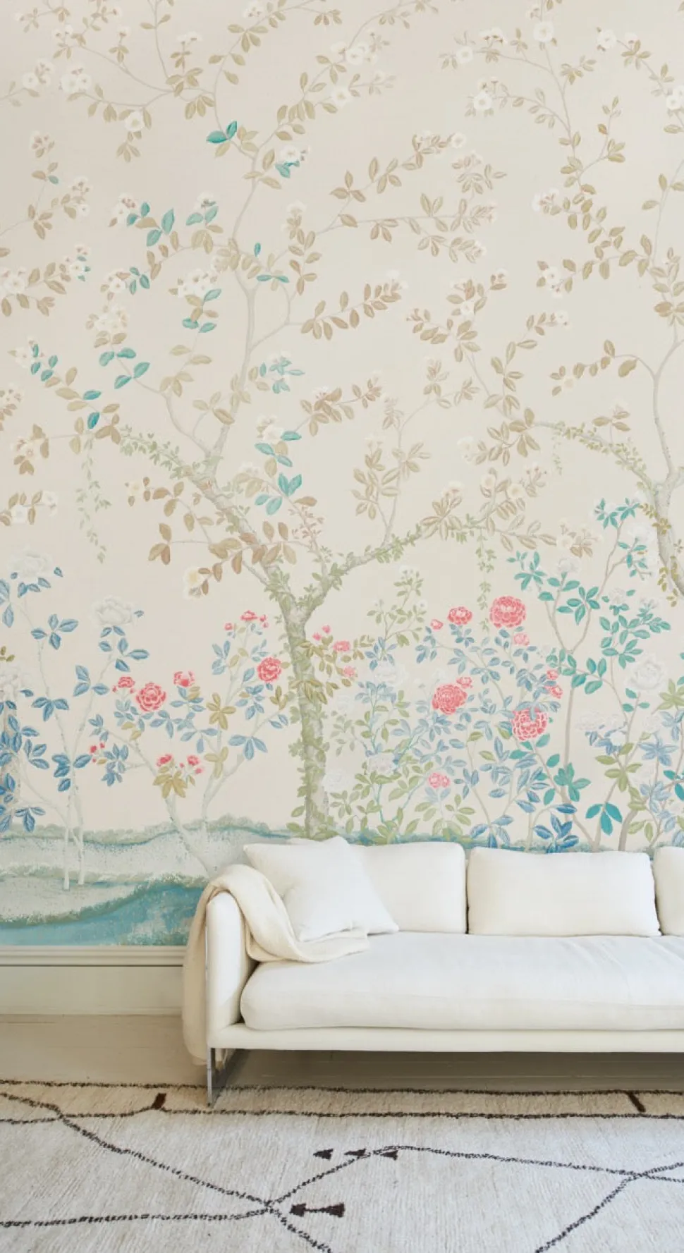 Founded by Frederic Schumacher in 1889 on Fifth Avenue in New York, Schumacher design transcend trends and time with generations-tested unwavering devotion to beauty and quality. Their luxury pillows, fabric, wallpaper, trim, and furniture allow decorators and shoppers alike to create with total confidence. An English garden meets chinoiserie in the Madame De Pompadour Panel Set Wallpaper, a stunning Miles Redd design.
