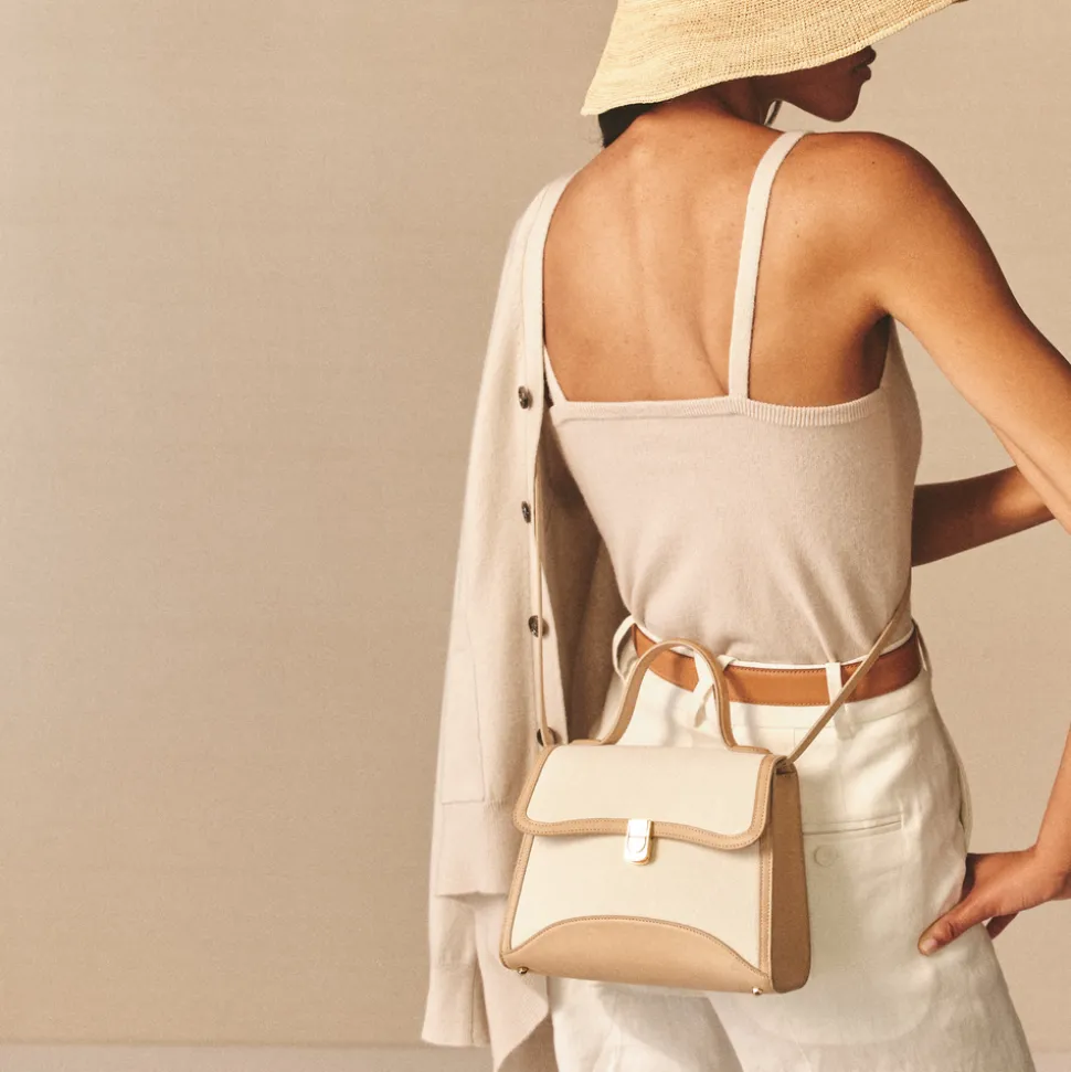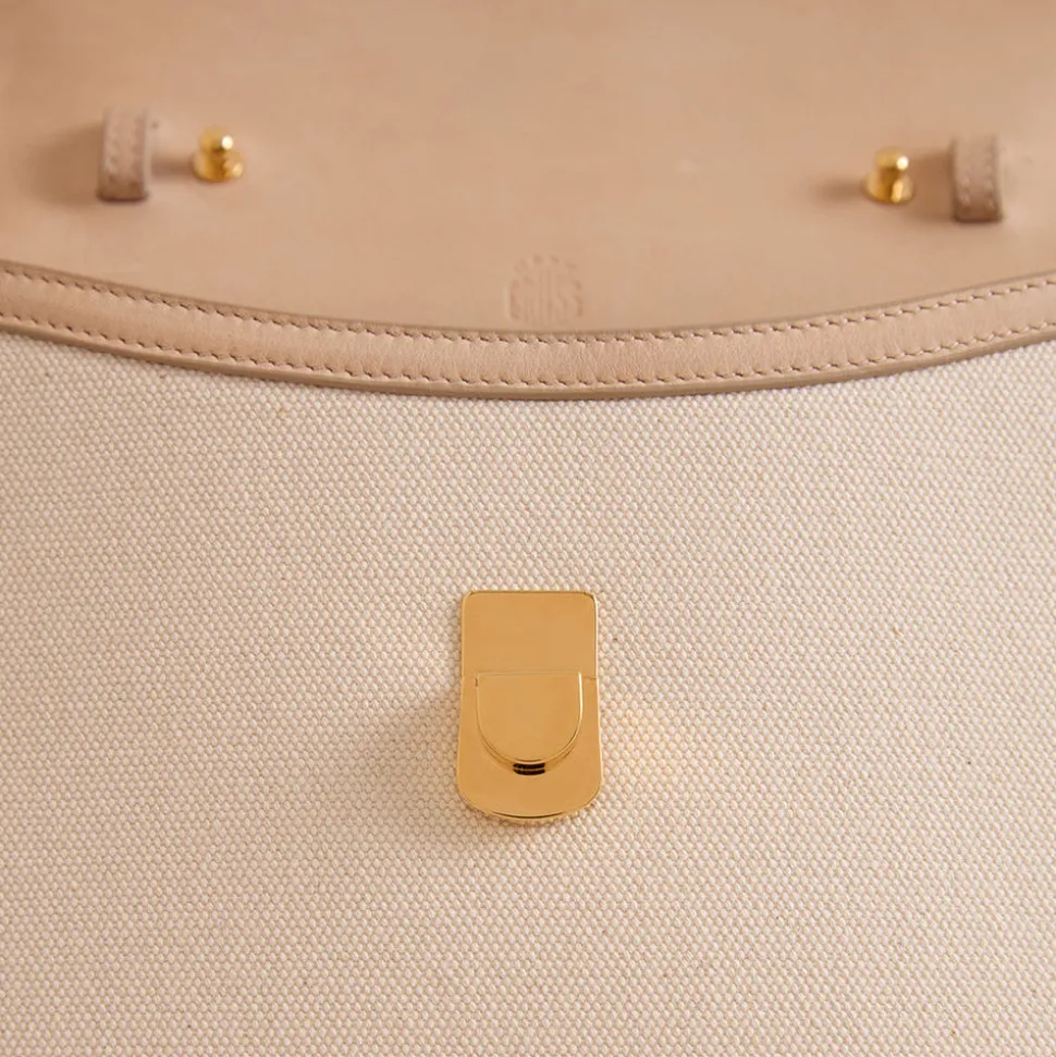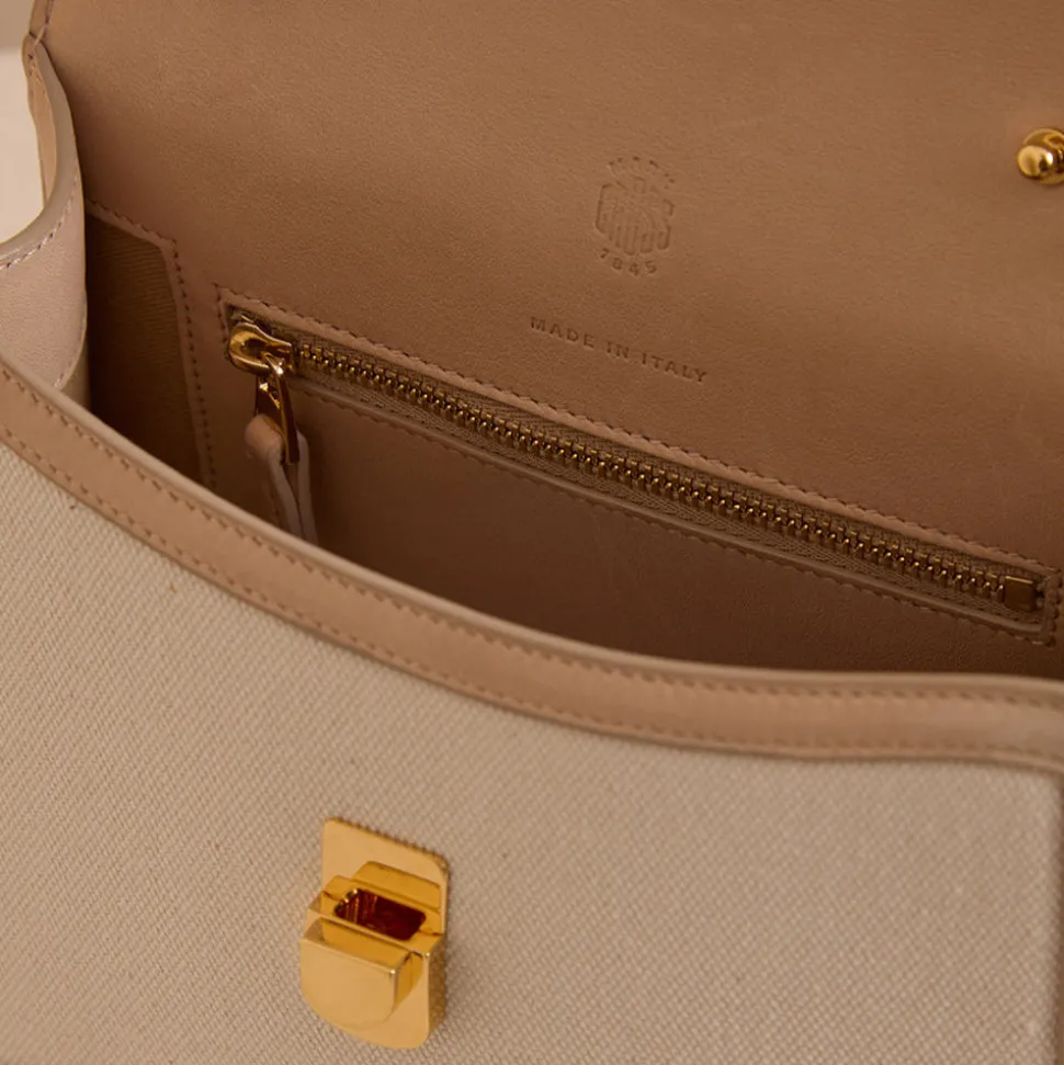 Founded in 1845 in Boston, Mark Cross is the quintessential American luxury brand with an uncompromising commitment to quality, elevated details, and nonchalant reworking of classic silhouettes. The signature shapes are discrete icons of pop culture, notably the overnight valise carried by Grace Kelly in Rear Window, designed by Gerald Murphy, the former president and ‘Lost Generation’ figurehead. The Madeline 21 in Canvas Natural & Supple Soft Natural is a compact reinterpretation of a house icon, reimagined with subtle updates. Crafted in Italian canvas with soft leather trim, it features a detachable shoulder strap secured by signature collar studs and a palladium clasp inspired by the original Rear Window case. Lined in creamy goatskin suede, this petite silhouette offers timeless style in a modern, versatile form.