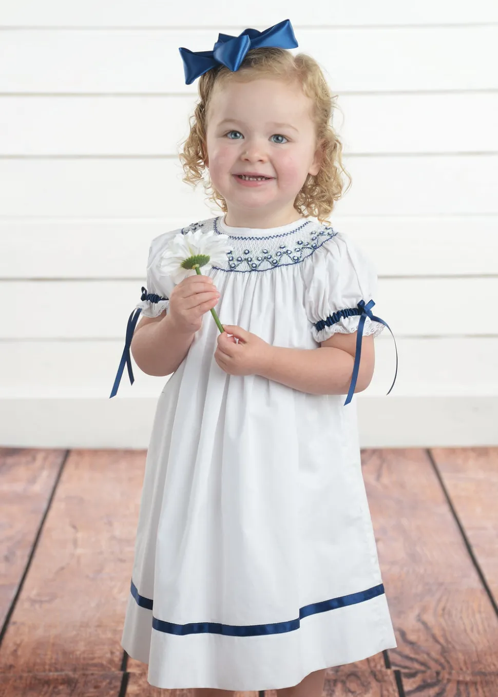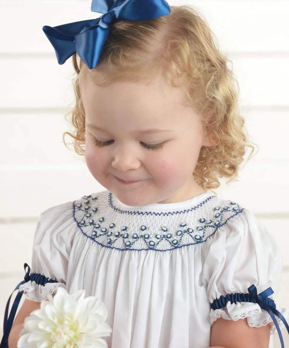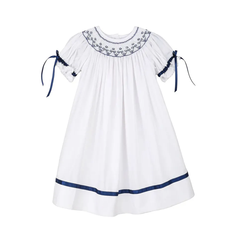 Using artisan seamstresses to craft small orders of their heirloom pieces, Strasburg Children pays special attention to details—French seams, built-in slips, and fabric-covered buttons—for lasting quality and comfort. In soft white cotton, with an included slip, this darling dress has handcrafted smocking and embroidery in white and navy surrounding the neck and sleeves, navy satin ribbon, and white cotton lace trim. French seams assure softness on the inside of the dress and the back opening closes with fabric-covered buttons.