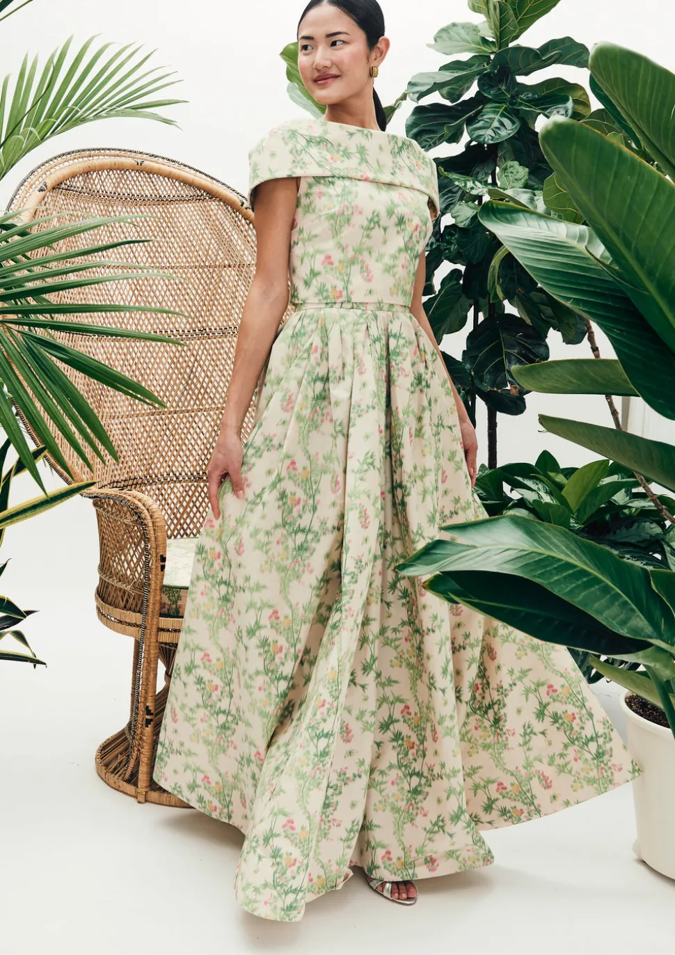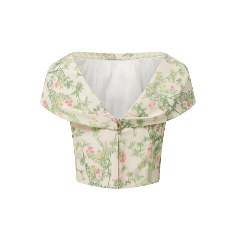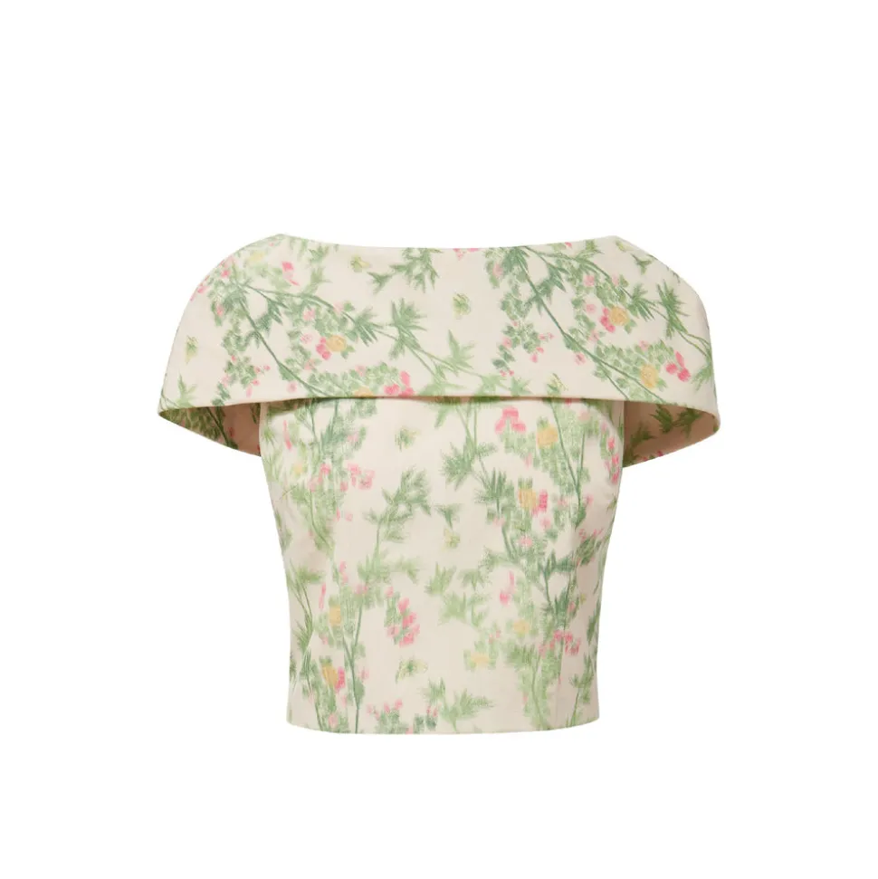 MAE New York seeks to revitalize New York’s historical garment district by creating small-batch and made-to-order collections—modern interpretations of 1960s glamor—highlighting tailoring, luxury materials, and craftsmanship. The MAE x Scalamandré Goldie Coat Bethany Top in Jardin De Chine brings vintage-inspired elegance into the modern wardrobe. With a 1960s-style cowl neckline and a V-back, it strikes the perfect balance between refined and alluring. The collaboration with Scalamandré features their famed “Jardin de Chine” wallpaper design thought to date back to the 1960s or 1970s. The pattern was discovered in the Noble Hardee Mansion in Savannah, Georgia—a stunning relic often called “the last unrestored grand mansion in Savannah.” Working with a mill in Italy, the brand reimagined the iconic wallpaper as a chiné fabric—a luxurious material known for its distinctive blurred or watercolor-like patterns, achieved through a specific pre-weaving dyeing process.