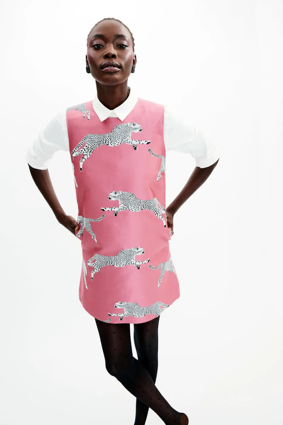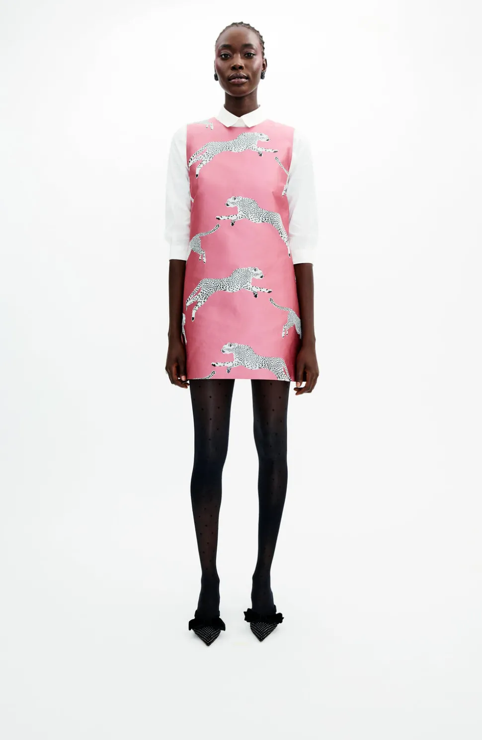 MAE New York seeks to revitalize New York’s historical garment district by creating small-batch and made-to-order collections—modern interpretations of 1960s glamor—highlighting tailoring, luxury materials, and craftsmanship. The Laurel Dress is inspired by classic shifts and features a jewel neckline and easy fit through the body. This season she is cut from the MAE x Scalamandre Leaping Cheetah jacquard, which is woven in Italy and cut by hand in the MAE New York atelier.