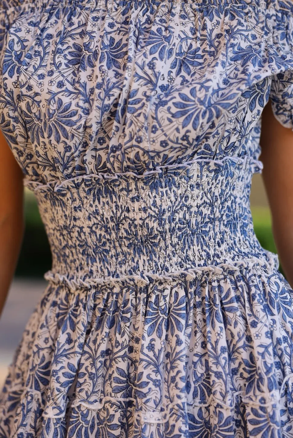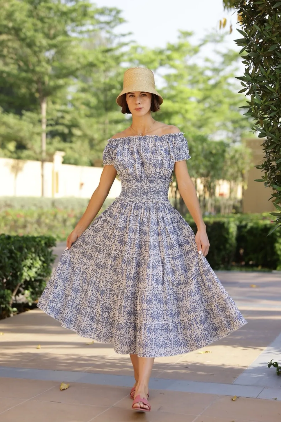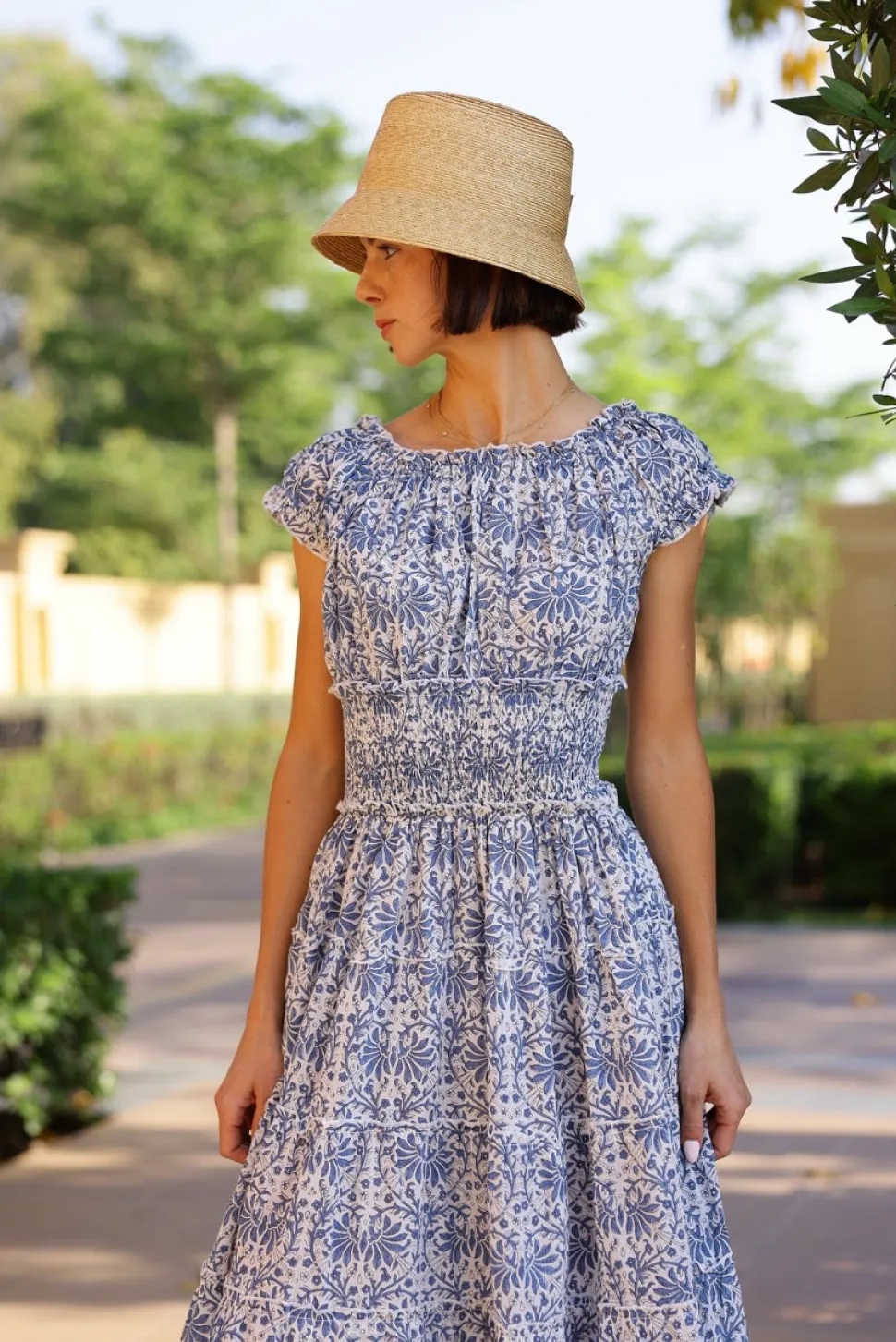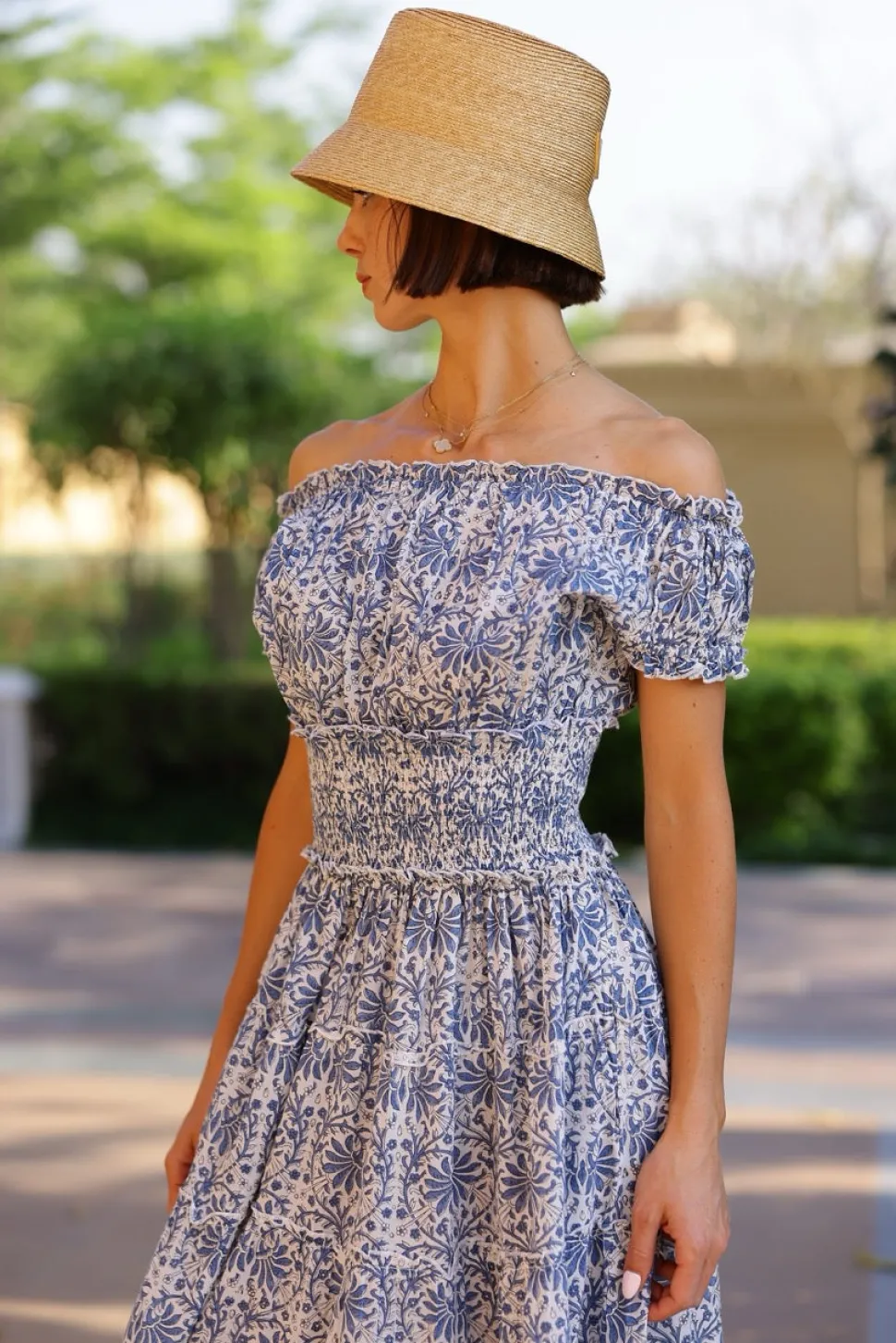 Introducing Maison Marigold, a new luxurious small-batch women’s resortwear brand inspired the wanderlust of travel. Our collections effortlessly transition from beachside lounging to an elegant evening on the town. The simplicity of design and classic silhouettes are the foundations for each and every style. Hand-printed linen and cotton make for comfortable and effortless pieces that are both feminine and flattering. From beachside brunches to tropical soirees, Majorca Midi Dress is bound to be a seaside favorite. Hand printed on lightweight cotton voile, it features a flattering smocked waist, micro ruffle trim, tiered skirt and hidden side seam pockets. Meant to be worn on or off the shoulders.