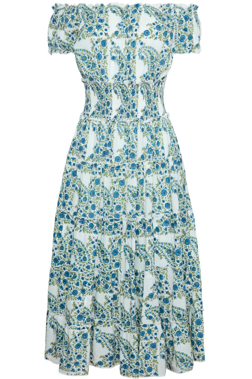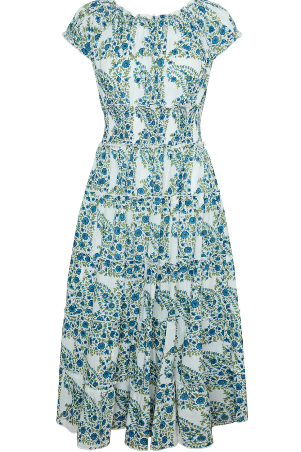 Introducing Maison Marigold, a new luxurious small-batch women’s resortwear brand inspired the wanderlust of travel. Our collections effortlessly transition from beachside lounging to an elegant evening on the town. The simplicity of design and classic silhouettes are the foundations for each and every style. Hand-printed linen and cotton make for comfortable and effortless pieces that are both feminine and flattering. From beachside brunches to tropical soirees, Majorca Midi Dress in Blue Green Paisley is bound to be a seaside favorite. Hand printed on lightweight cotton voile, it features a flattering smocked waist, micro ruffle trim, tiered skirt and hidden side seam pockets. Meant to be worn on or off the shoulders.
