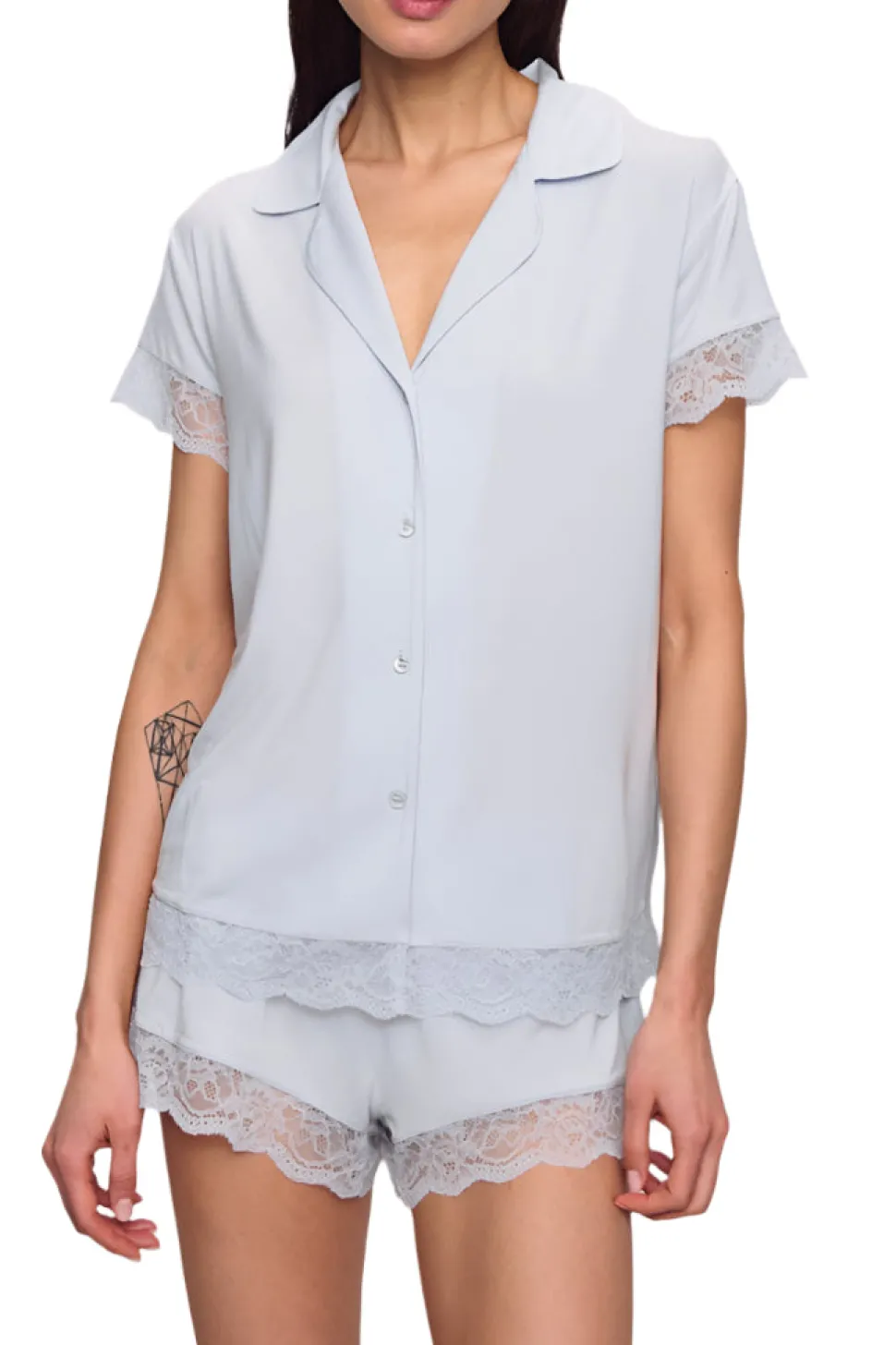 95% TENCEL™ Modal, 5% spandex. Cheeky short set. Short sleeve button front top with notch collar. Low-rise cheeky shorts with thin elastic waistband. Lace detail on top and short.