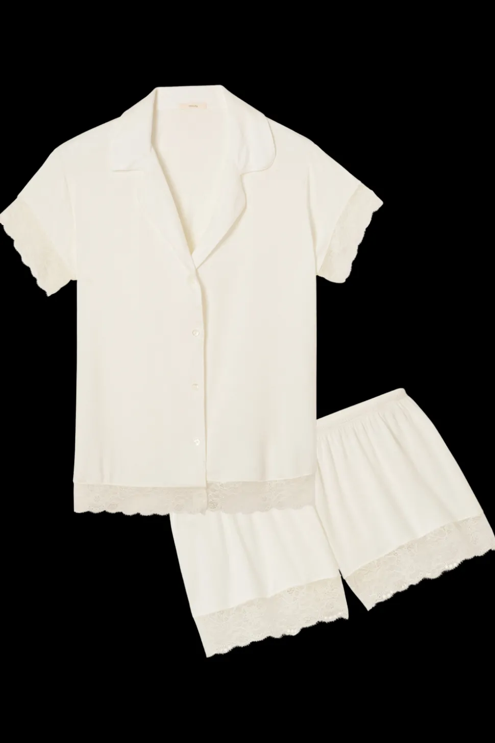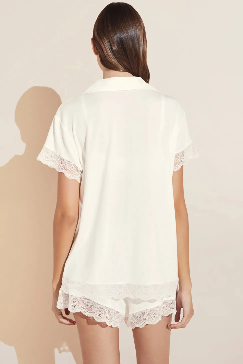 95% TENCEL modal, 5% spandex. Short sleeve button front top with notch collar. Low-rise cheeky shorts with thin elastic waistband. Lace detail on top and short.