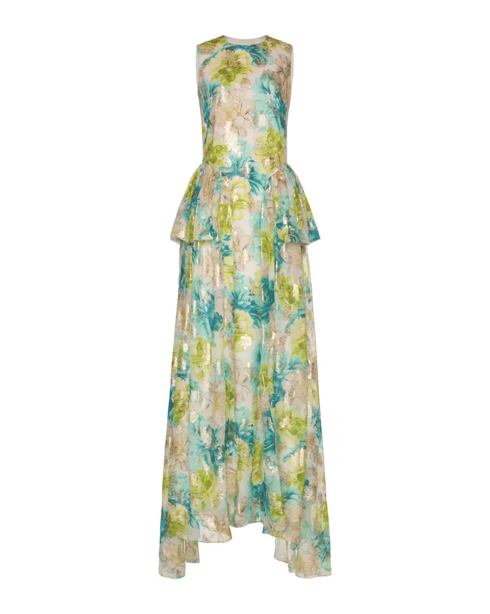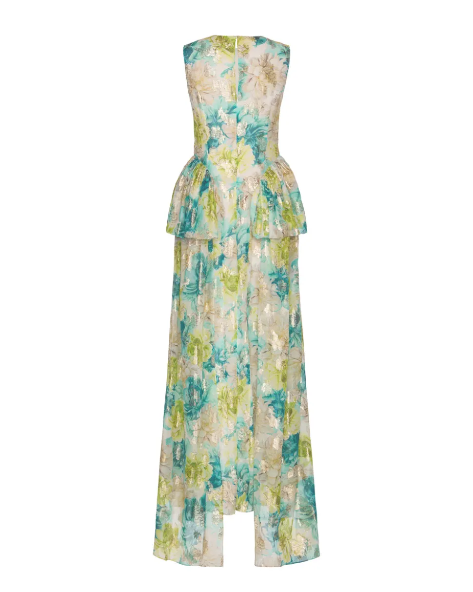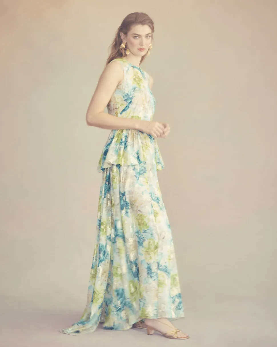 A graduate of the Savannah College of Design, award-winning Alexandra Pijut’s namesake line arrives from her studio in New York, offering luxe ready-to-wear pieces that distinguish themselves between femininity and practicality. The Manon Dress in Turquoise Peony Chiffon features a relaxed and effortless silhouette, adorned with delicate and vibrant turquoise peonies printed on silk chiffon. Petite, golden flowers are woven into the fabric, adding a touch of shine to this style. Rococo era inspiration is highlighted by a double train off the back of this dress and pillowy hip panels.