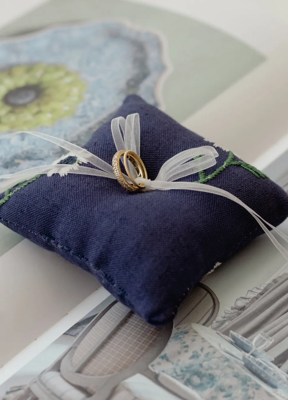 Esencial Hogar’s founder, Celina Wright, wants every gathering around the table a memorable one. What began as a small online shop based in El Salvador offering globally sourced treasures developed into its own collection of table linens —with linens sourced from India and finished by hand in El Salvador—designed to elevate the everyday. The ideal pillow to help escort your ring on the big day, the Manzanilla Ring Pillow in Navy features a vintage lace overlay, repeated embroideries of scale blooms, and a thin silk organza ribbon bow used to secure the rings for the ceremony. Utterly gorgeous and an instant keepsake.