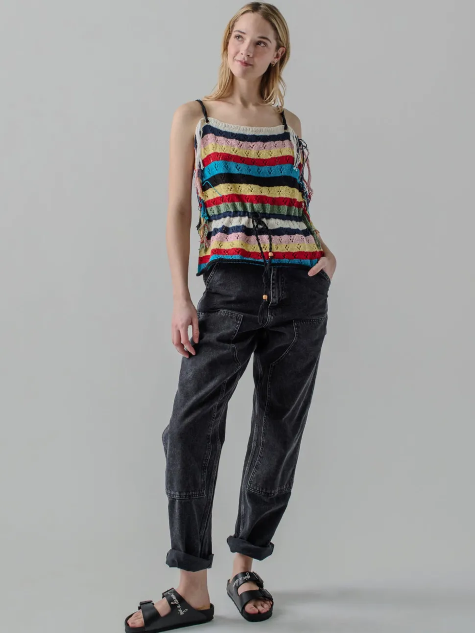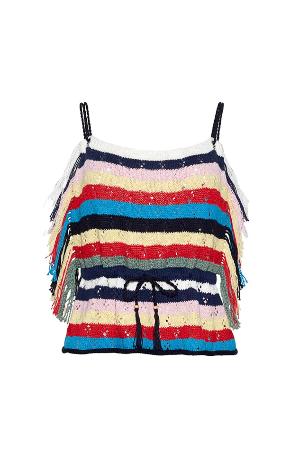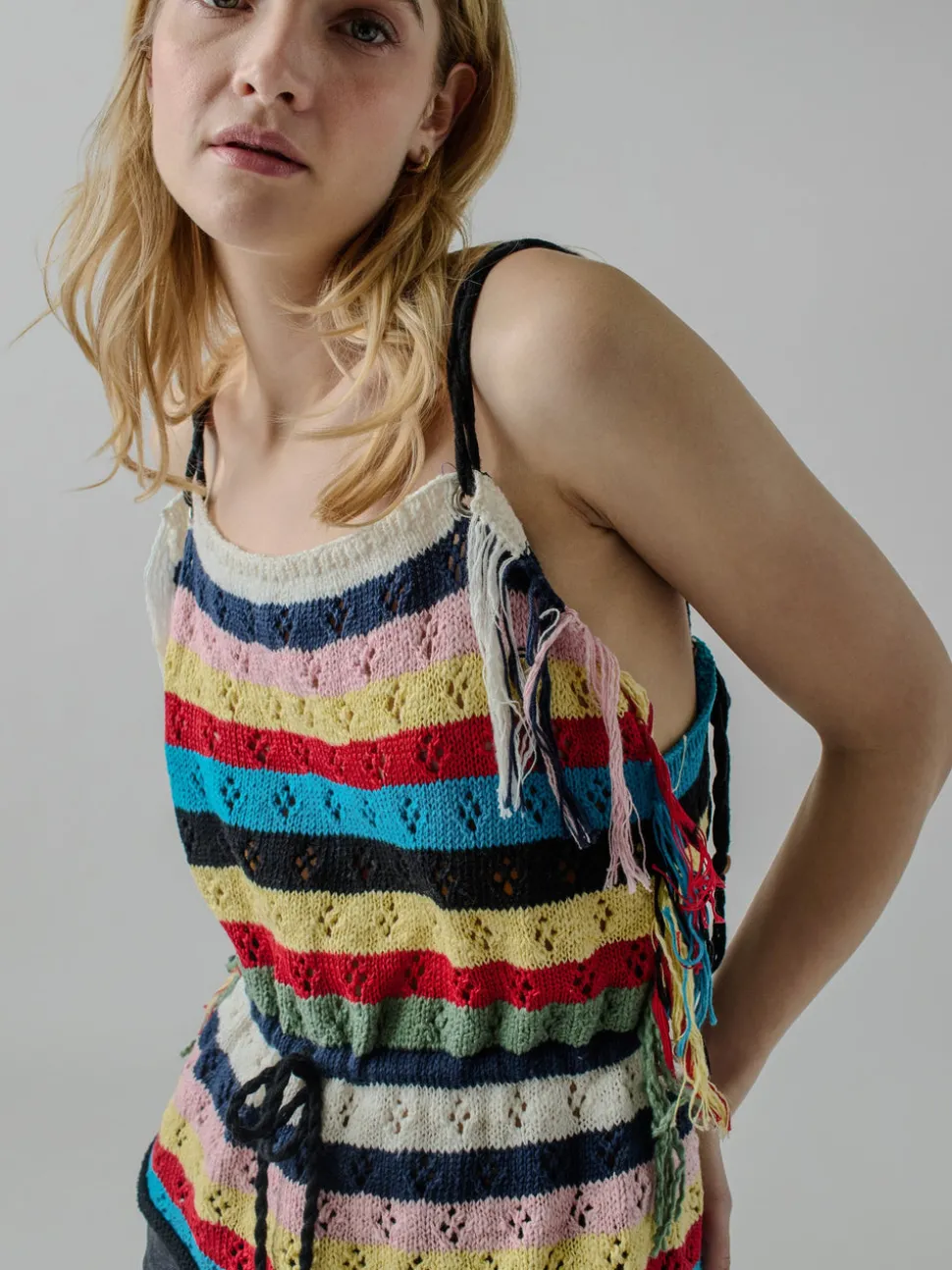 Lingua Franca is a line of sustainably-sourced, fair trade luxury ready-to-wear and cashmere pieces, all hand-stitched by women in New York City. Every word on Lingua Franca’s staple pullover sweaters is chalked in script by designer Rachelle Hruska MacPherson before it is ever stitched. Marathi Beach, just a short boat ride from Patmos, offers a slower pace, ideal for a moment of relaxation. This hand-tied, rope-detail Marathi Tank in Stripe Multi captures that laid-back vibe. Made in collaboration with women-led, fair trade-certified artisans in Peru, these striped cotton knit tanks feature intricate pointelle stitching throughout. The shoulder straps and drawcord are adorned with hand-twisted rope ties and wooden bead accents. Hand-tied fringe along the side seams adds a finishing touch of artisanal craftsmanship. Pair with the Marathi Shorts or Marathi Skirt.