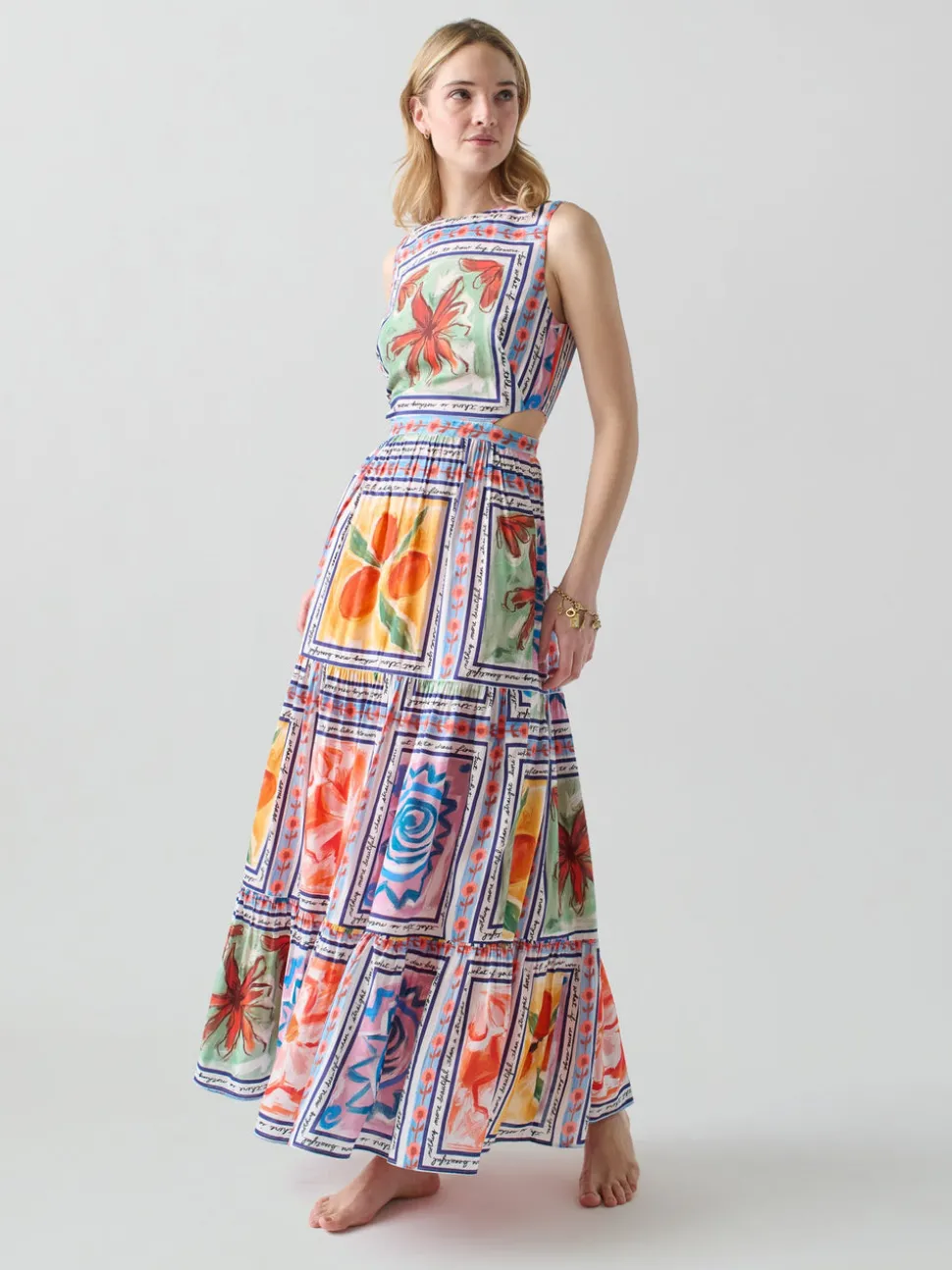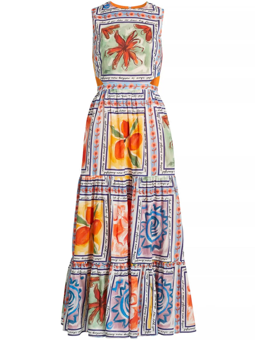 Shell: 52% cotton, 48% rayon. Lining: 100% cotton. Fitted throughout bodice with a line skirt silhouette. Cutouts at waist. Side seam pockets. Tiered skirt. Lined in cotton.