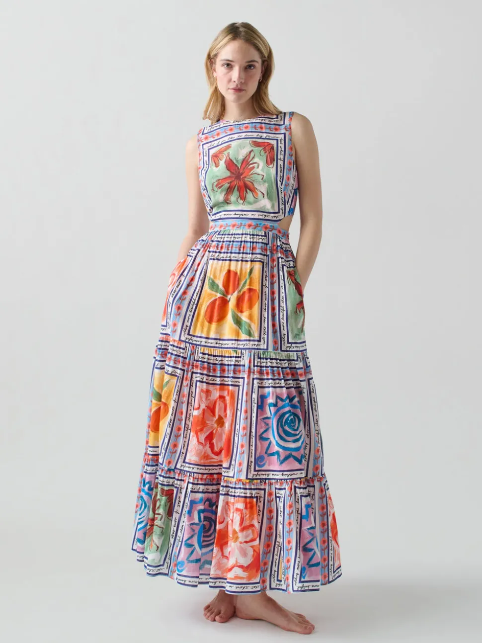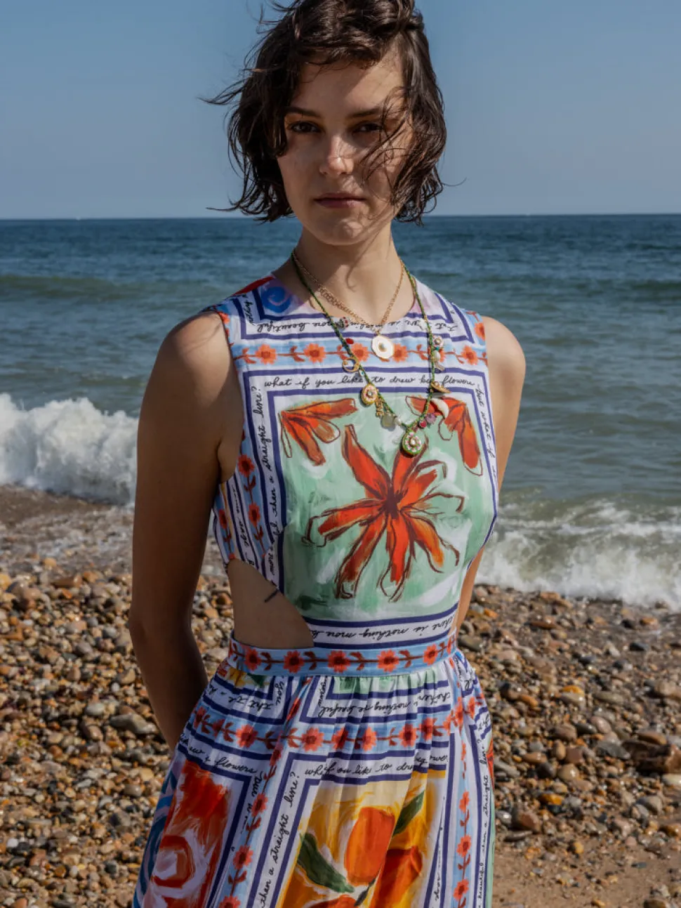 Lingua Franca is a line of sustainably-sourced, fair trade luxury ready-to-wear and cashmere pieces, all hand-stitched by women in New York City. Every word on Lingua Franca’s staple pullover sweaters is chalked in script by designer Rachelle Hruska MacPherson before it is ever stitched. The Marcia Dress in Ceramic is inspired by hand-painted ceramics from a traditional house in the Chora of Patmos. For this collection, the brand collaborated with the estate of the late Patmos poet Robert Lax, and this special print features his words: “What if you like to draw big flowers, but what if some sage has told you that there is nothing more beautiful, nothing more beautiful than a straight line?” The dress is also named after Robert’s niece, Marcia, who has been instrumental in making this partnership possible.