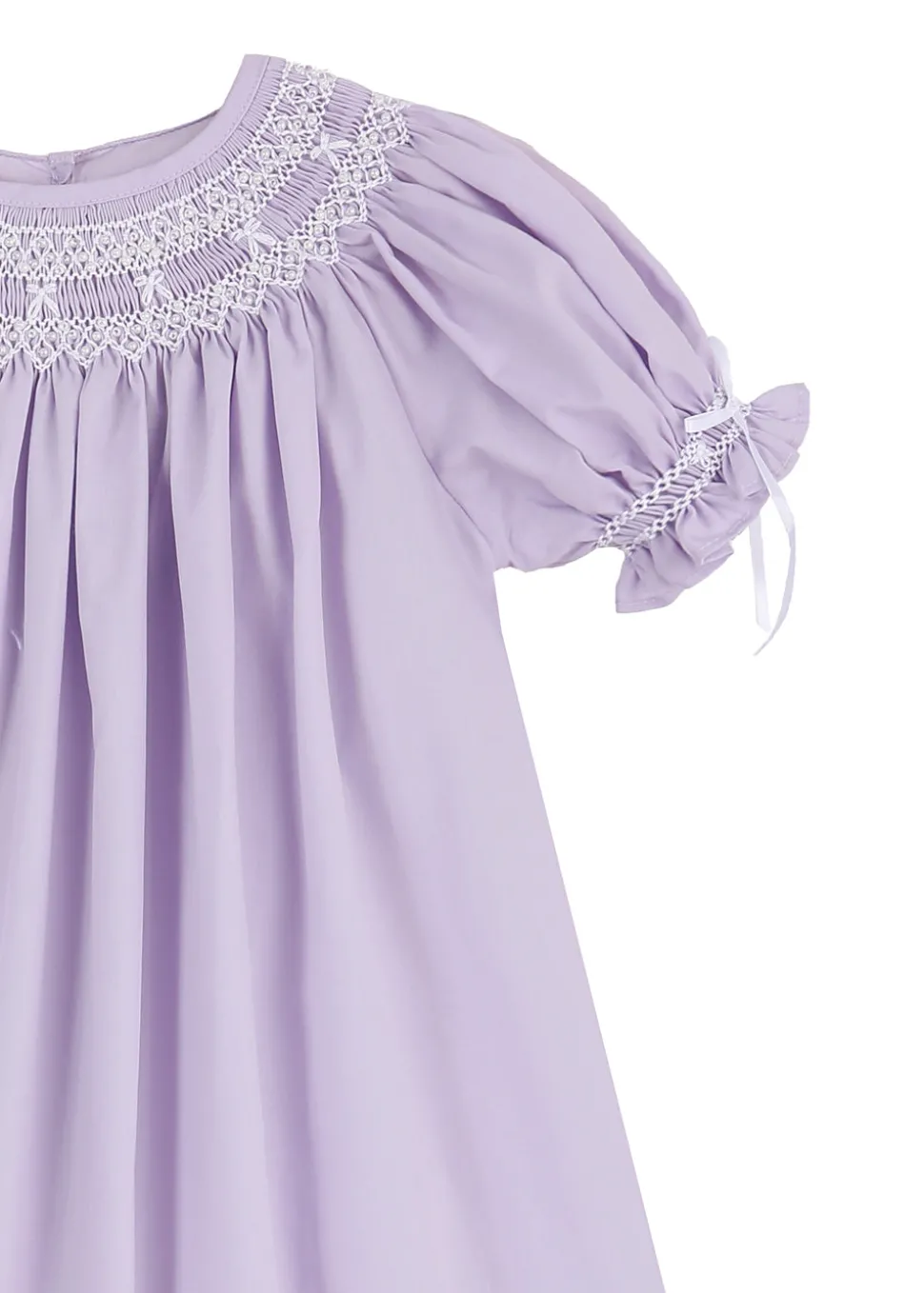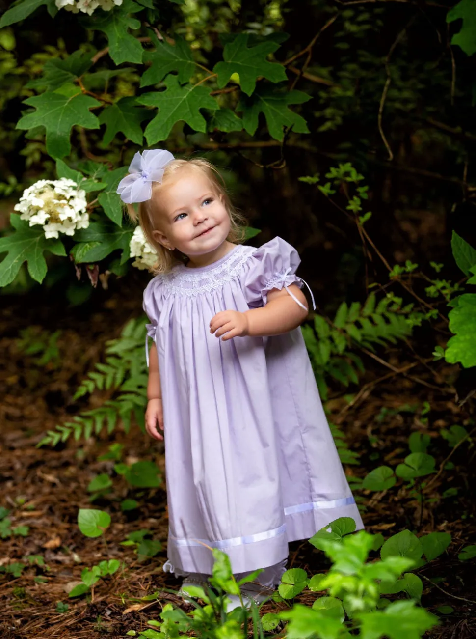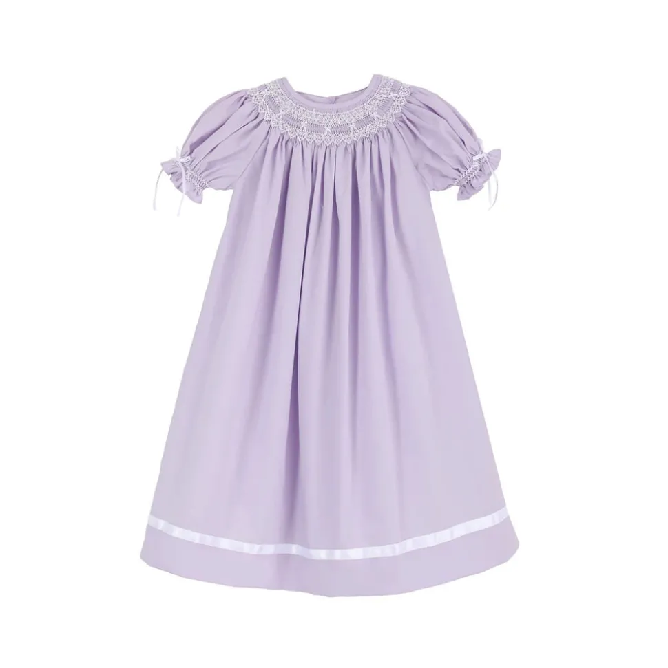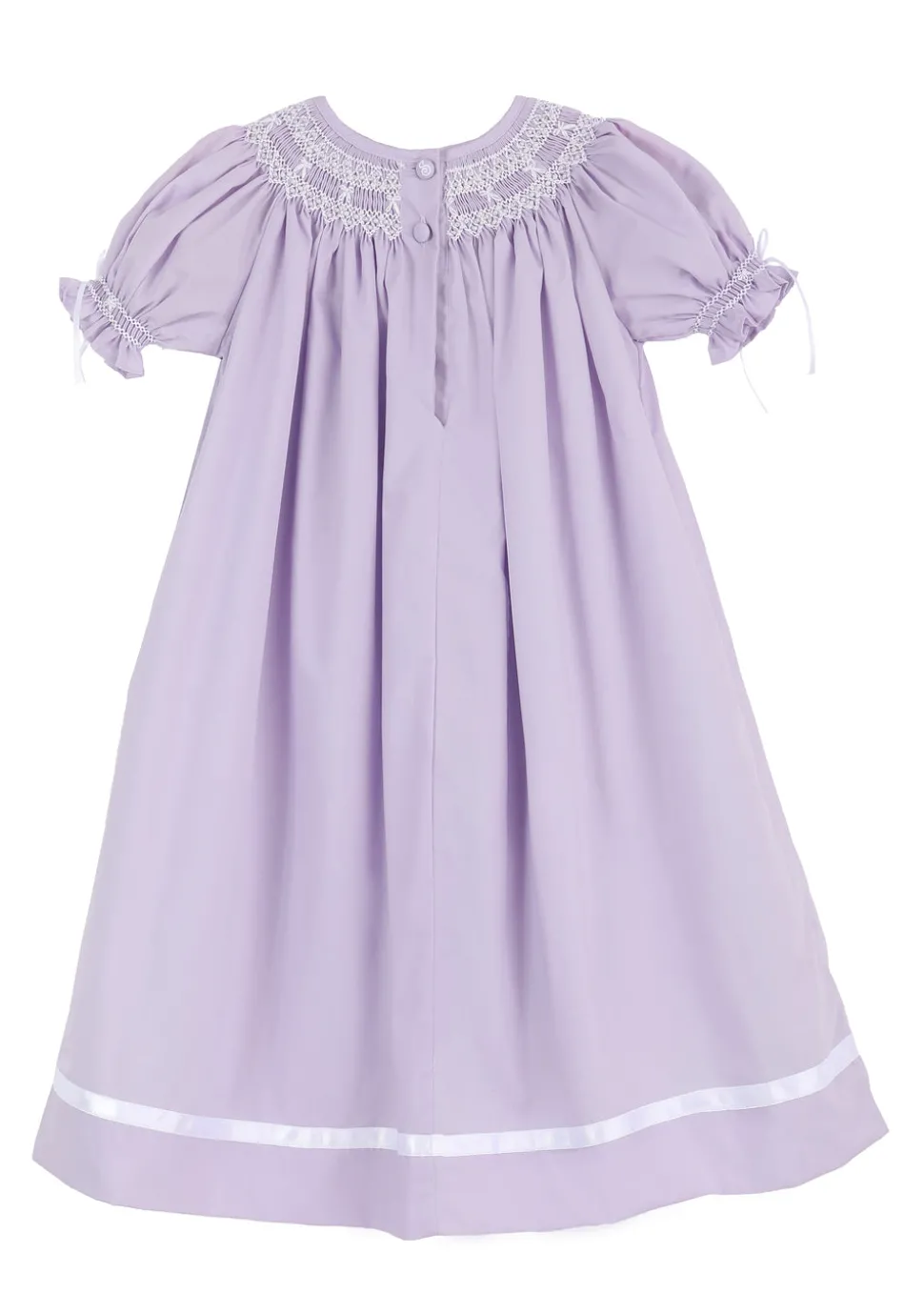 Using artisan seamstresses to craft small orders of their heirloom pieces, Strasburg Children pays special attention to details—French seams, built-in slips, and fabric-covered buttons—for lasting quality and comfort. The Margaret in Lilac Bishop features embroidered bows and seed pearls. This heirloom bishop dress also boasts accented satin white ribbons on the skirt and sleeve and comes with a matching lavender slip.