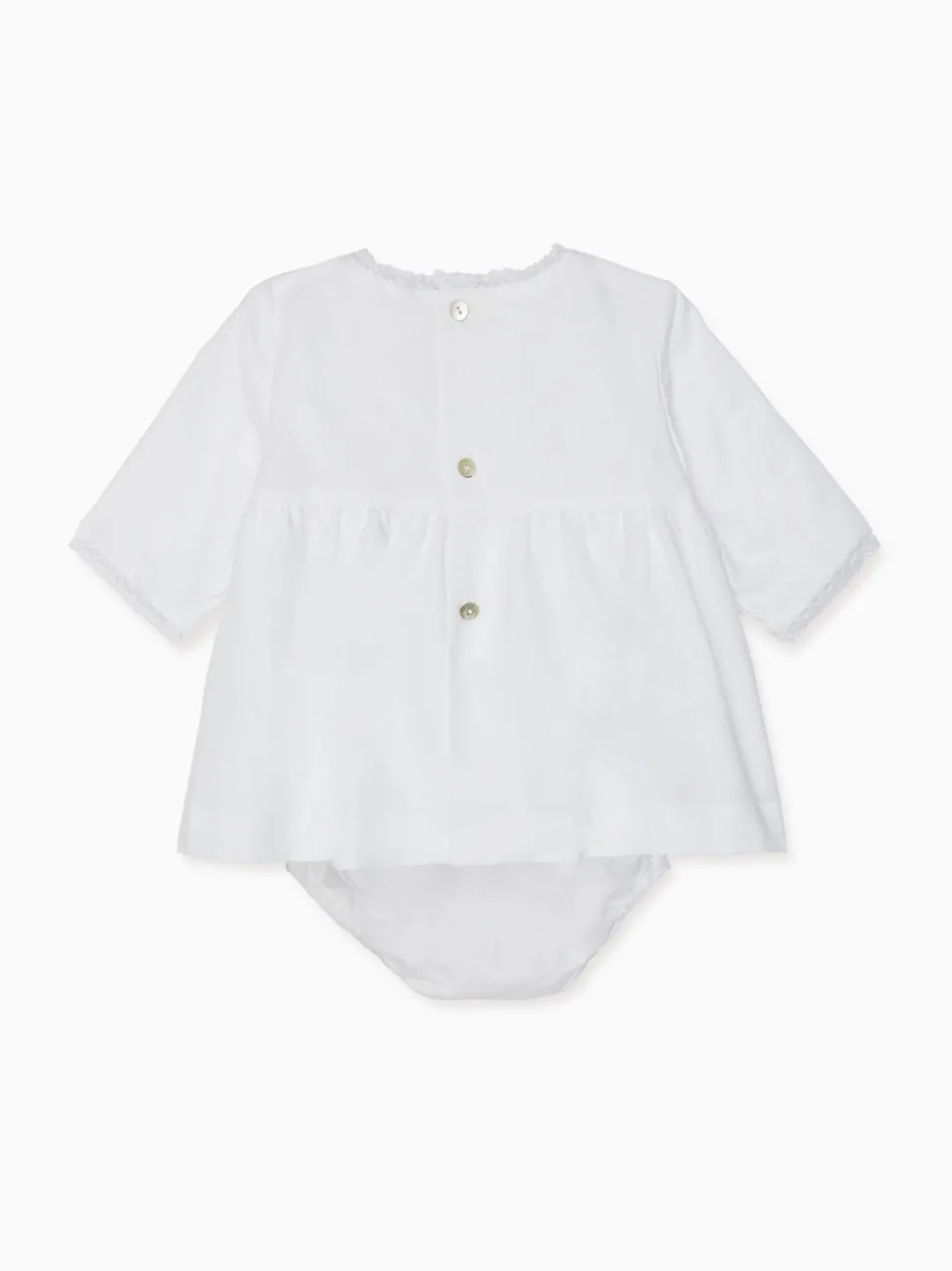 Nestled in Notting Hill but proudly made in Spain, La Coqueta was established in 2013 by Celia Muñoz, a mother of five. Known as Celia’s “sixth child,” La Coqueta marries modern traditionalism with Spanish nostalgia. An exclusive collaboration with Over The Moon, the Margarita Ceremony Baby Set is ideal for your next wedding, religious ceremony, or special event. Crafted from luxuriously soft linen-cotton fabric, it is kind to the most delicate skin and ensures your little one keeps comfortable throughout the big day. Featuring three-quarter sleeves, a charming Mandarin collar, and trimmed with touches of lace, get it with matching bloomers in crisp ivory linen-cotton material for extra coverage and fuss-free changing.