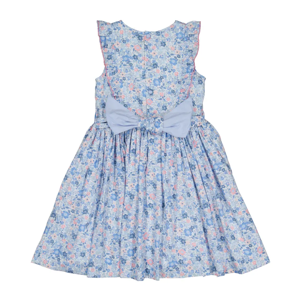 100% cotton. Unique blue and pink floral hand smocked dress. Flutter sleeves around the shoulders and no collar. Sophisticated floral embroideries on the chest, reversible bow tied around the back and covered buttons. Available from sizes 3M to 24M, ensuring a complete and adorable look for little ones.