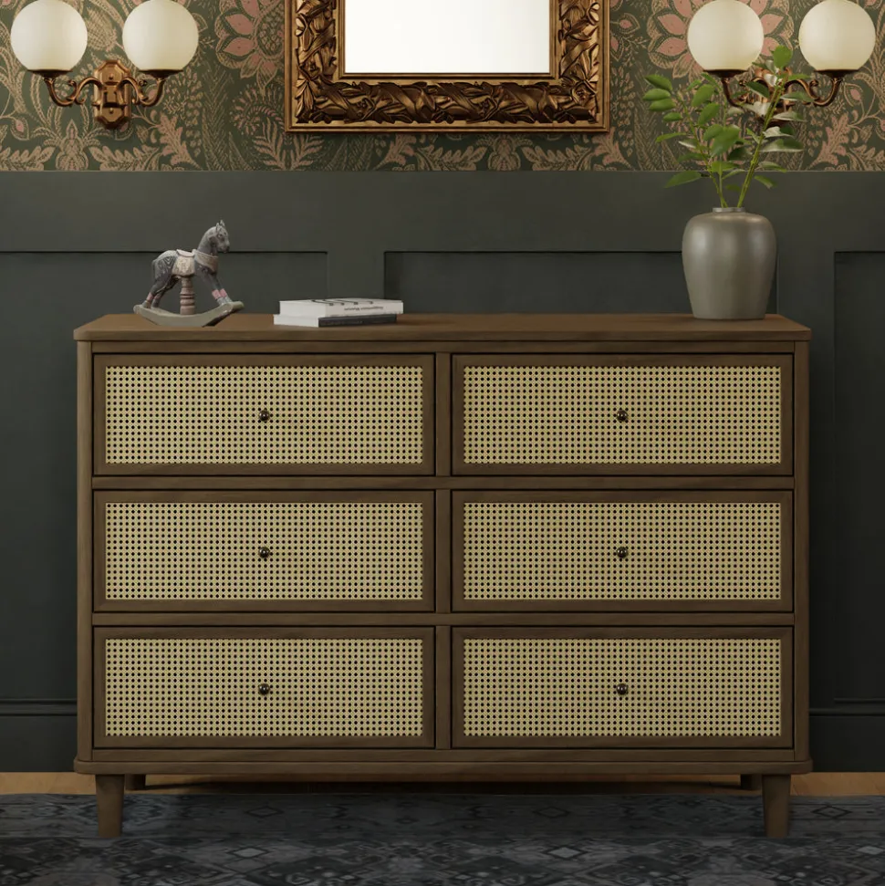 Made to treasure, Namesake brings quiet sophistication to the nursery and beyond. Imbuing heirloom-quality craftsmanship with modern sensibility, these timeless essentials are made to be cherished for years to come. The Marin with Cane 6-Drawer Assembled Dresser in Natural Walnut & Blonde Cane reimagines classic design through a contemporary lens, pairing softly curved lines with airy cane paneling for an effortlessly transitional aesthetic.