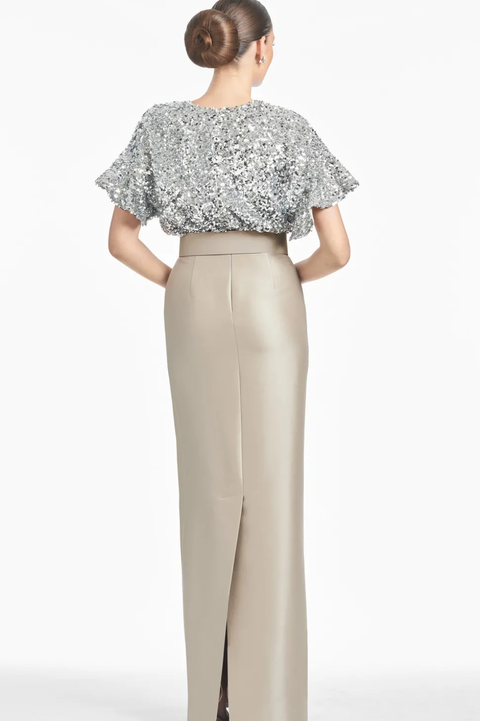 Born in India, Sachin and Babi bonded at New York’s Fashion Institute of Technology and launched an embroidery business, working with top houses, like Oscar de la Renta, and Manolo Blahnik. Today, the brand works with their own factory in Mumbai, controlling quality at every stage, and producing womenswear that is at once unique, beautiful, and wearable. The Marlene Gown in Silver Pewter features a column skirt in a double-face Mikado meets glittering metallic stretch micro-sequins for the ultimate black-tie ensemble. The drop sleeve offers an easy elegance to this otherwise classic silhouette. A self-belt in silver pewter completes the gown