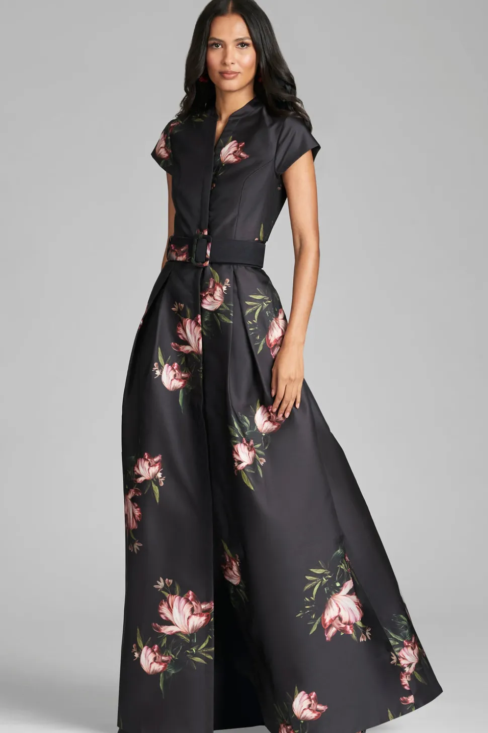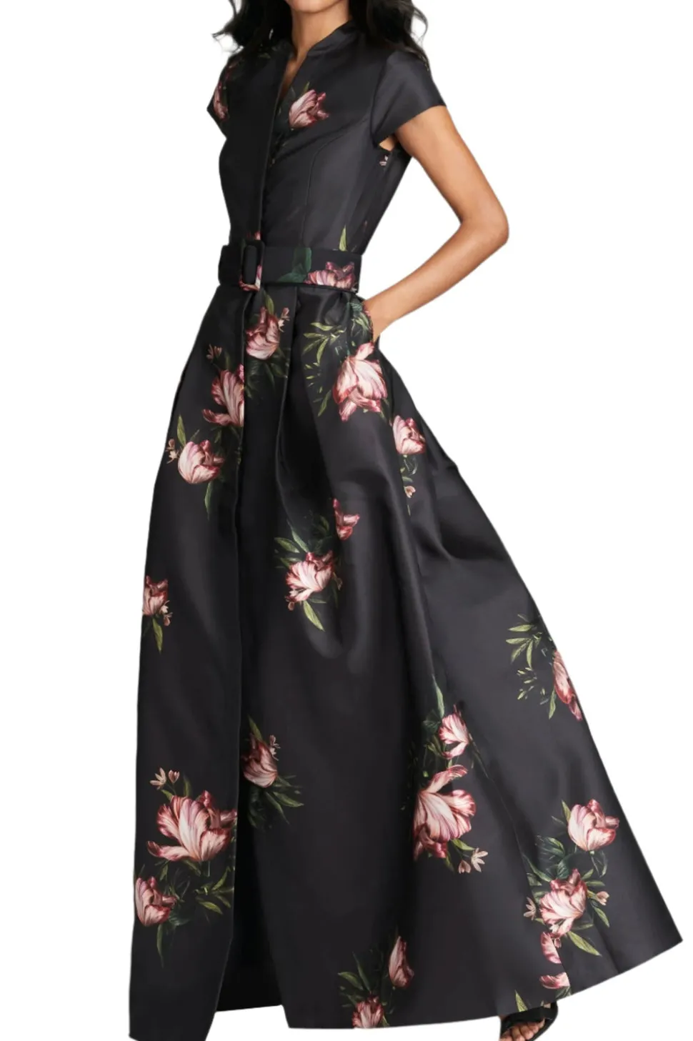 Born in India, husband-and-wife duo Sachin and Babi first met at New York’s Fashion Institute of Technology and launched an embroidery business, working with top houses, like Oscar de la Renta, and Manolo Blahnik. The incredibly flattering Marta Gown features the elegant Noir Blossom print. A banded collar is tastefully cut away to meet concealed front buttons. The black Mikado fabric with multi-color florals make this dress a classic and a statement all at once.