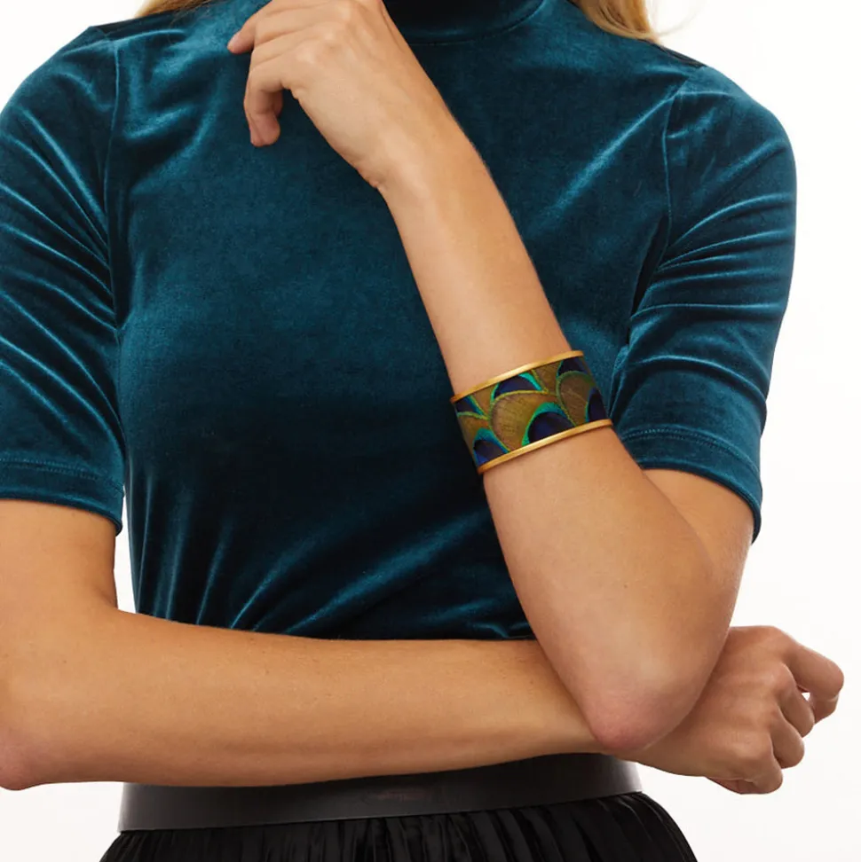 Brackish began with one feather bow tie designed by Ben Ross and gifted to his groomsman, Jeff Plotner. Since its inception, the brand has blossomed into full line of men’s and women’s accessories designed and handcrafted in Charleston, South Carolina with each piece focused on honoring the beauty found in nature. The Mary Ann Thin Cuff was designed to pay tribute to the wife of co-founder Ben. Crafted with beautiful peacock feathers, this stunning bracelet also comes in a wider, larger edition.