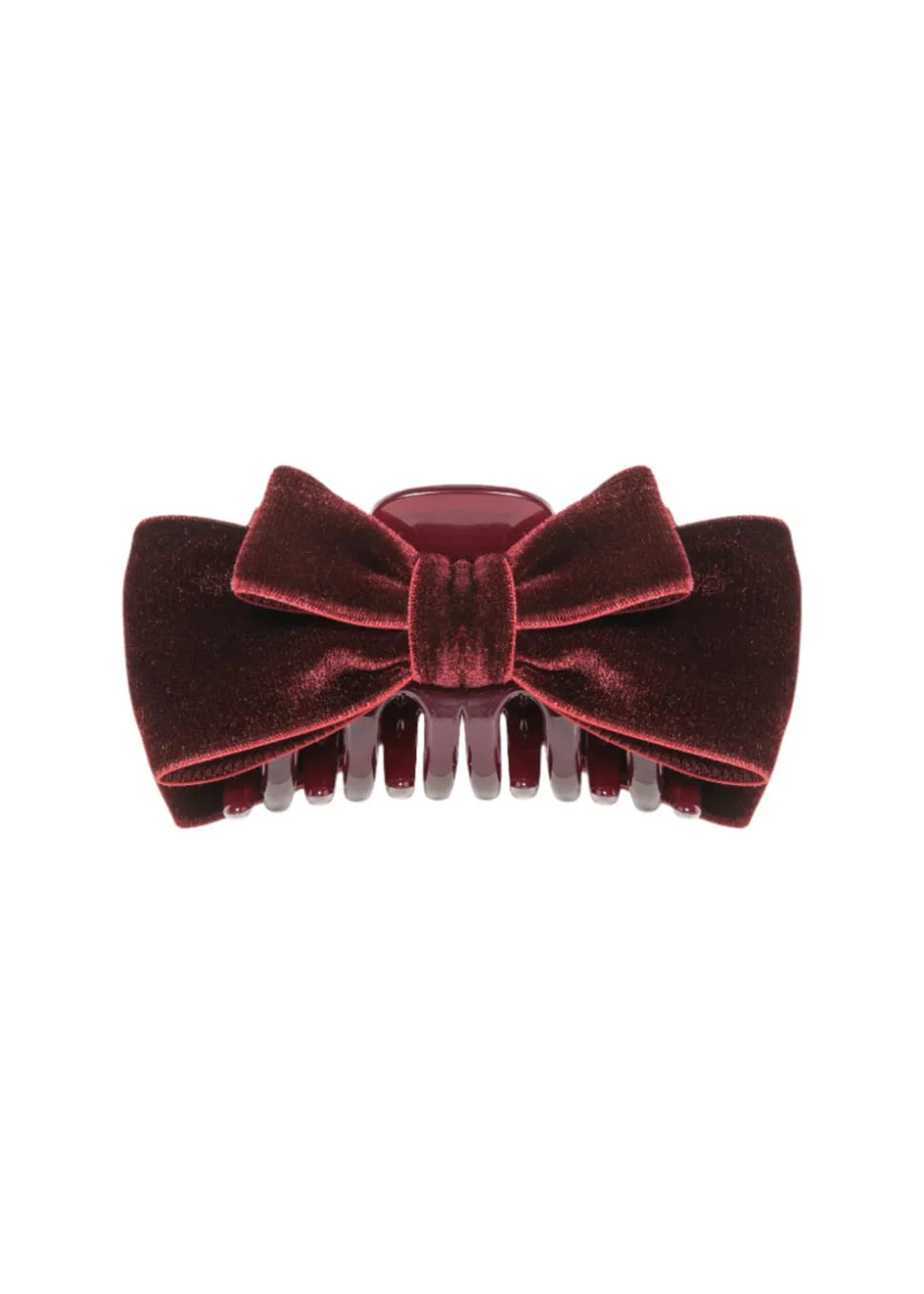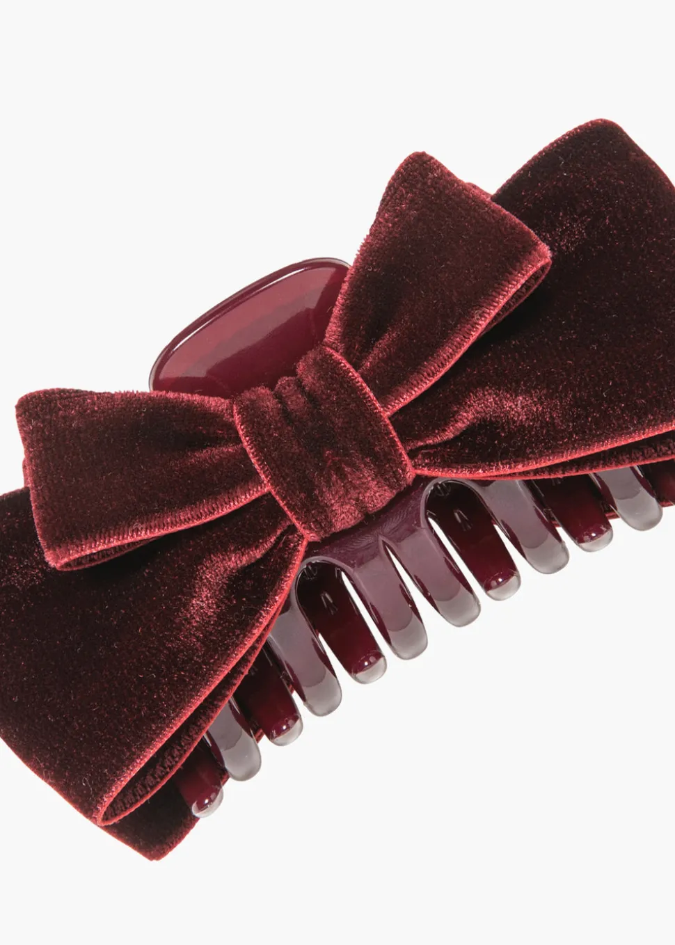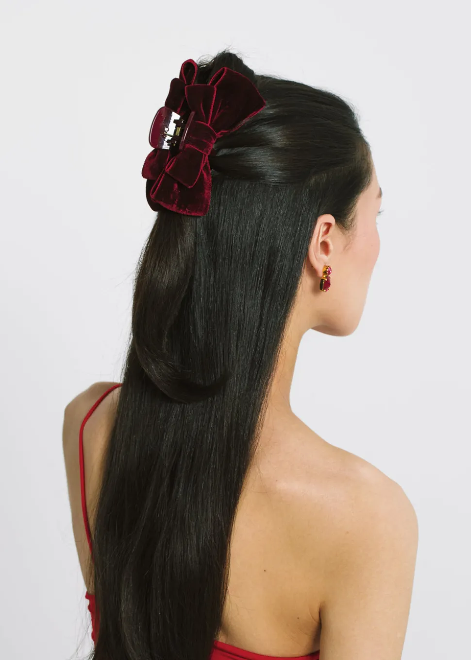 “Everything has a story to tell,” says Jennifer Behr, the founder of her namesake luxury hair accessory brand that has blossomed into one of New York City’s foremost ateliers for jewelry, as well as bridal. In every crystal, pearl, and ribbon, you’ll find the utmost quality and a sense of romance, as each piece reveals a modern interpretation of centuries-old regalia. The Matilda Jaw Clip in Pinot is the accessory you don’t want to run out the door without. Luxe velvet ribbon forms graduating layers of bows, for dimension and volume. These bows sit on a sturdy acrylic resin jaw clip, making it easy to sweep hair half-up, all the way back, and into any style in between.
