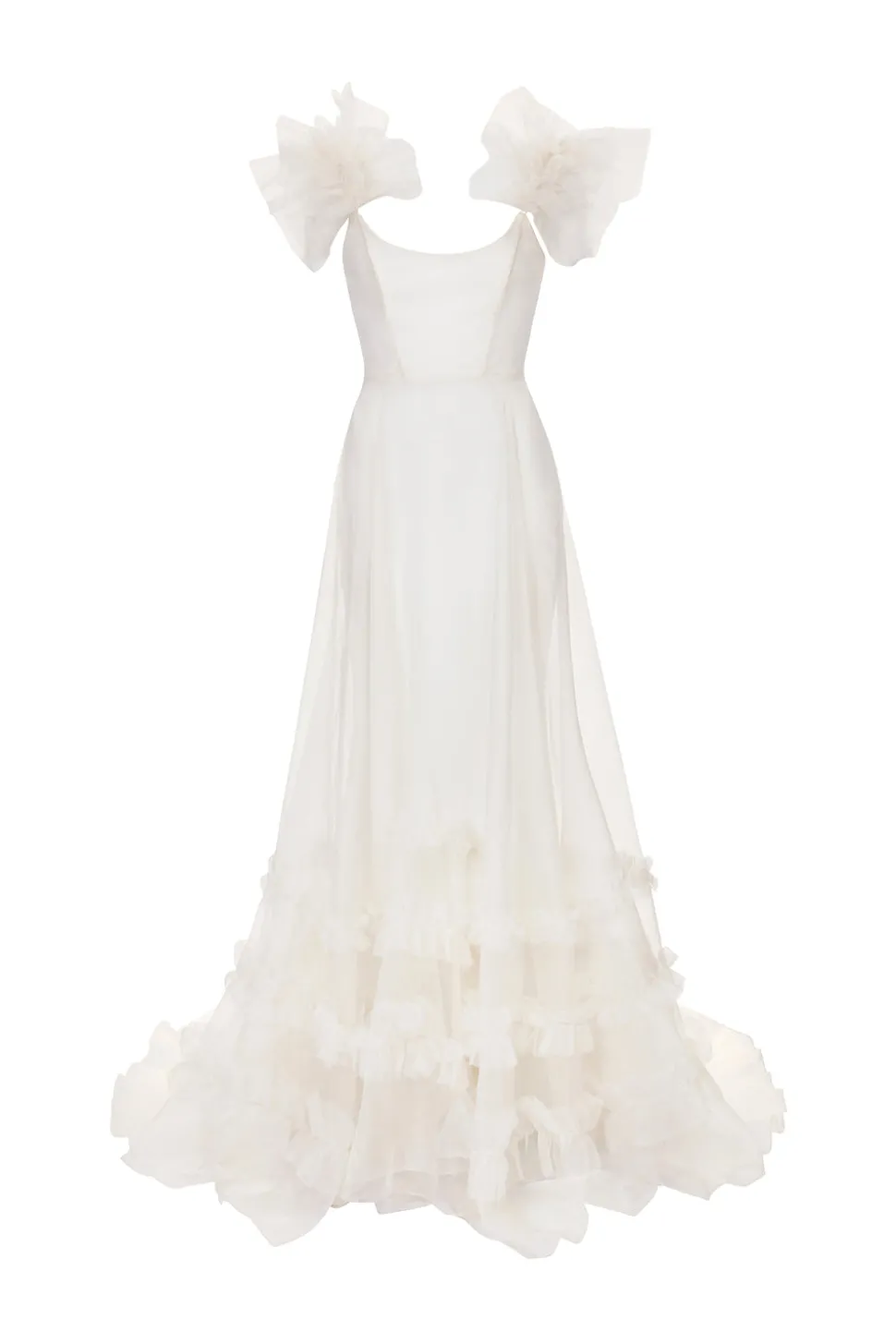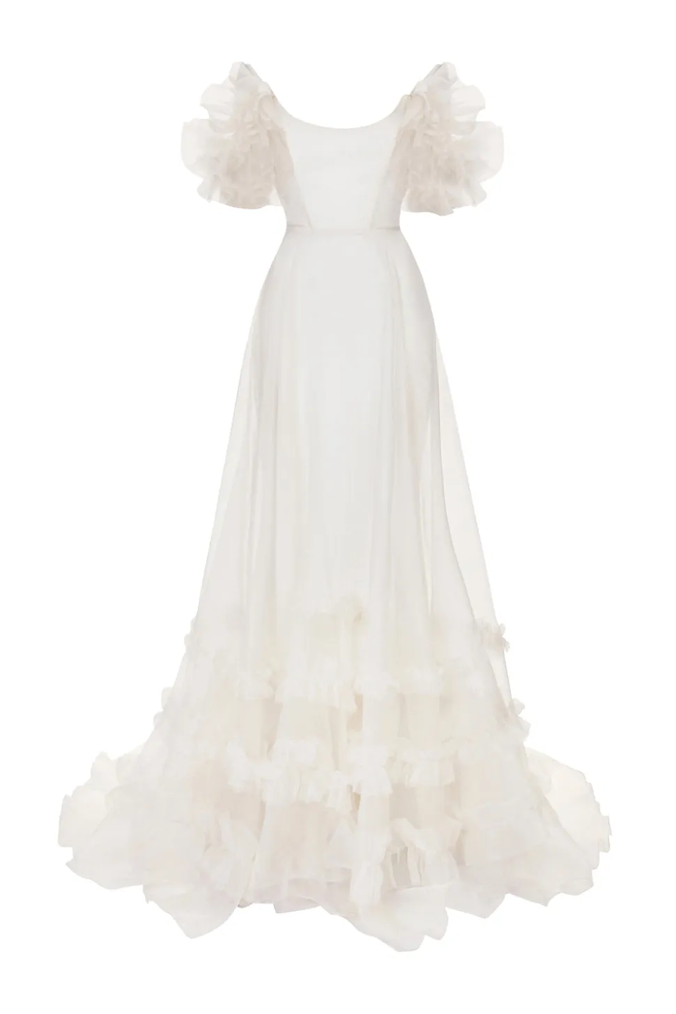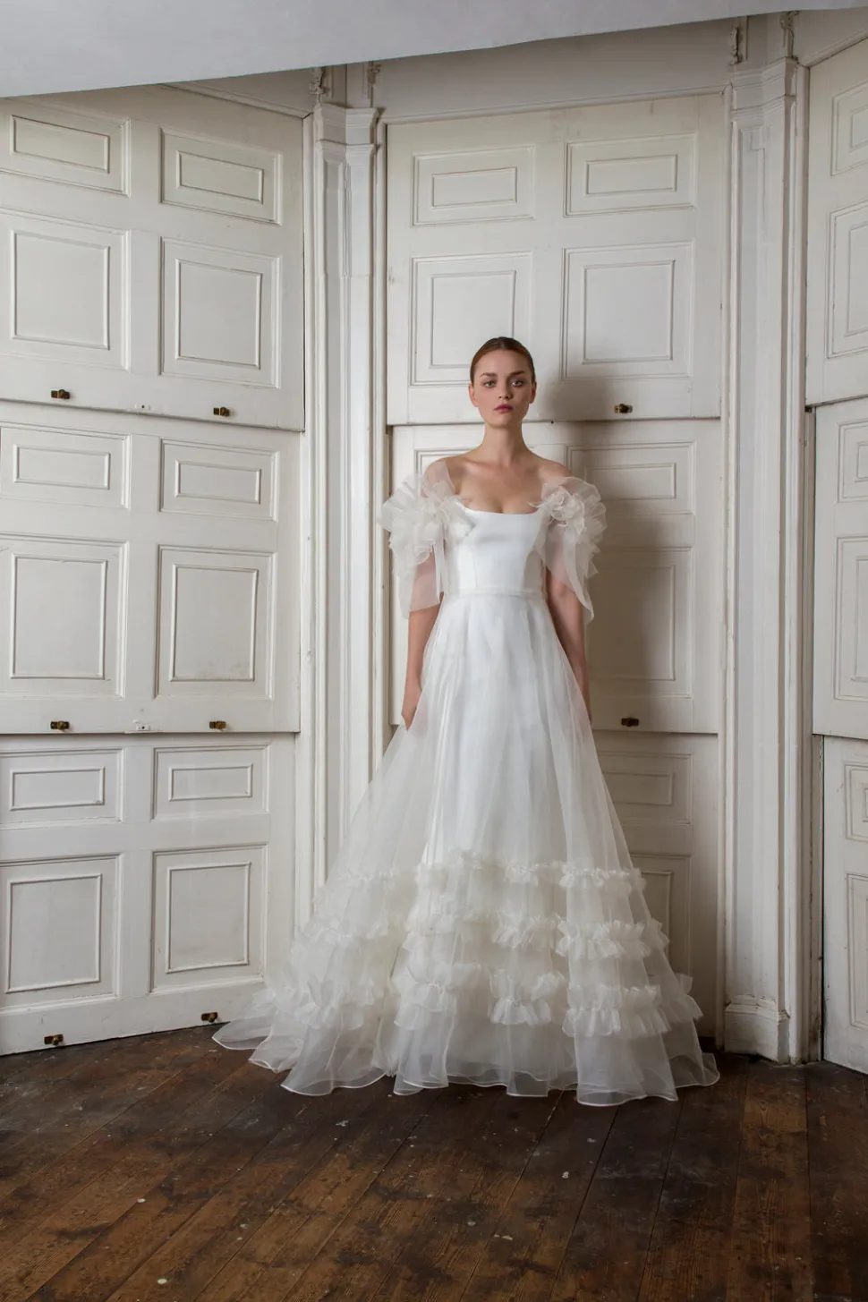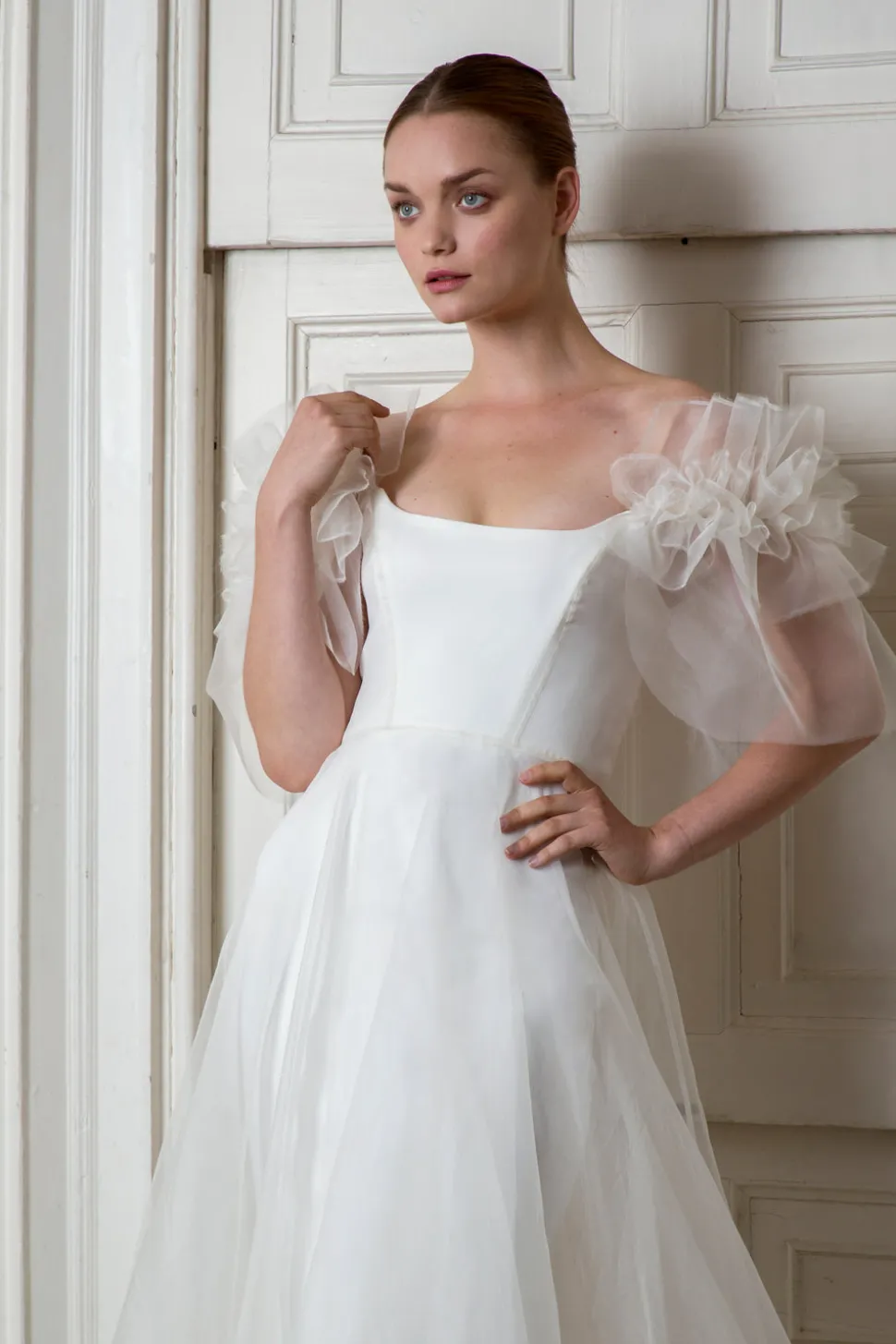 Luxury bridalwear brand Halfpenny London weaves Brit cool with a luxe sensibility, creating innovative, chic dresses and separates for the modern woman. The Mayfair Dress is for brides who love feminine details, a dual-silhouette, statement sleeves, and frills.